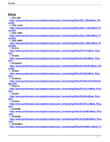 D-Link Dlink • DFL-200 http://www.portforward.com/english/routers/port_forwarding/Dlink/DFL-200/eMule_Plu s.htm • DGL-4100 http://www.portforward.com/english/routers/port_forwarding/Dlink/DGL-4100/eMule_Pl us.htm • DGL-4300 http://www.portforward.com/english/routers/port_forwarding/Dlink/DGL-4300/eMule_Pl us.htm • DGL-4500 http://www.portforward.com/english/routers/port_forwarding/Dlink/DGL-4500/eMule_Pl us.htm • DI-514 http://www.portforward.com/english/routers/port_forwarding/Dlink/DI-514/eMule_Plus. htm • DI-524 http://www.portforward.com/english/routers/port_forwarding/Dlink/DI-524/eMule_Plus. htm • DI-524UP http://www.portforward.com/english/routers/port_forwarding/Dlink/DI-524UP/eMule_Plu s.htm • DI-604 http://www.portforward.com/english/routers/port_forwarding/Dlink/DI-604/eMule_Plus. htm • DI-604v2 http://www.portforward.com/english/routers/port_forwarding/Dlink/DI-604v2/DI-604v2in dex.htm • DI-614+ http://www.portforward.com/english/routers/port_forwarding/Dlink/DI-614+/eMule_Plus. htm • DI-624 http://www.portforward.com/english/routers/port_forwarding/Dlink/DI-624/eMule_Plus. htm • DI-624+ http://www.portforward.com/english/routers/port_forwarding/Dlink/DI-624+/eMule_Plus. htm • DI-624M http://www.portforward.com/english/routers/port_forwarding/Dlink/DI-624M/eMule_Plus .htm • DI-634M http://www.portforward.com/english/routers/port_forwarding/Dlink/DI-634M/eMule_Plus .htm • DI-634Mv1 http://www.portforward.com/english/routers/port_forwarding/Dlink/DI-634Mv1/eMule_Pl 1/7 D-Link us.htm • DI-704 http://www.portforward.com/english/routers/port_forwarding/Dlink/DI-704/eMule_Plus. htm • DI-704P-revA http://www.portforward.com/english/routers/port_forwarding/Dlink/DI-704P-revA/eMule _Plus.htm • DI-704P-revB http://www.portforward.com/english/routers/port_forwarding/Dlink/DI-704P-revB/eMule _Plus.htm • DI-704P-revC http://www.portforward.com/english/routers/port_forwarding/Dlink/DI-704P-revC/eMule _Plus.htm • DI-704P-revC-v3.09 http://www.portforward.com/english/routers/port_forwarding/Dlink/DI-704P-revC-v3.09/ eMule_Plus.htm • DI-704pV2.60 http://www.portforward.com/english/routers/port_forwarding/Dlink/DI-704pV2.60/eMule _Plus.htm • DI-704UP http://www.portforward.com/english/routers/port_forwarding/Dlink/DI-704UP/eMule_Plu s.htm • DI-707 http://www.portforward.com/english/routers/port_forwarding/Dlink/DI-707/eMule_Plus. htm • DI-707P http://www.portforward.com/english/routers/port_forwarding/Dlink/DI-707P/eMule_Plus .htm • DI-711(configurazione generale) http://www.portforward.com/english/routers/port_forwarding/Dlink/DI-711/default.htm • DI-713 http://www.portforward.com/english/routers/port_forwarding/Dlink/DI-713/eMule_Plus. htm • DI-713P http://www.portforward.com/english/routers/port_forwarding/Dlink/DI-713P/eMule_Plus .htm • DI-714+v1.31 http://www.portforward.com/english/routers/port_forwarding/Dlink/DI-714+v1.31/eMule _Plus.htm • DI-714P+ http://www.portforward.com/english/routers/port_forwarding/Dlink/DI-714P+/eMule_Plu s.htm • di-714P+ver2 http://www.portforward.com/english/routers/port_forwarding/Dlink/di-714P+ver2/eMule _Plus.htm • DI-724 2/7 D-Link http://www.portforward.com/english/routers/port_forwarding/Dlink/DI-724/eMule_Plus. htm • DI-724GU http://www.portforward.com/english/routers/port_forwarding/Dlink/DI-724GU/eMule_Pl us.htm • DI-724P+ http://www.portforward.com/english/routers/port_forwarding/Dlink/DI-724P+/eMule_Plu s.htm • DI-754 http://www.portforward.com/english/routers/port_forwarding/Dlink/DI-754/eMule_Plus. htm • DI-764 http://www.portforward.com/english/routers/port_forwarding/Dlink/DI-764/eMule_Plus. htm • DI-774 http://www.portforward.com/english/routers/port_forwarding/Dlink/DI-774/eMule_Plus. htm • DI-784 http://www.portforward.com/english/routers/port_forwarding/Dlink/DI-784/eMule_Plus. htm • DI-804HV http://www.portforward.com/english/routers/port_forwarding/Dlink/DI-804HV/eMule_Plu s.htm • DI-804HVv2.00 http://www.portforward.com/english/routers/port_forwarding/Dlink/DI-804HVv2.00/eMul e_Plus.htm • DI-804V http://www.portforward.com/english/routers/port_forwarding/Dlink/DI-804V/eMule_Plus .htm • DI-808HV http://www.portforward.com/english/routers/port_forwarding/Dlink/DI-808HV/eMule_Plu s.htm • DI-824VUP http://www.portforward.com/english/routers/port_forwarding/Dlink/DI-824VUP/eMule_P lus.htm • DI-904 http://www.portforward.com/english/routers/port_forwarding/Dlink/DI-904/eMule_Plus. htm • DIR-100 http://www.portforward.com/english/routers/port_forwarding/Dlink/DIR-100/eMule_Plus .htm • DIR-300 http://www.portforward.com/english/routers/port_forwarding/Dlink/DIR-300/eMule_Plus .htm • DIR-450 http://www.portforward.com/english/routers/port_forwarding/Dlink/DIR-450/eMule_Plus 3/7 D-Link .htm • DIR-615 http://www.portforward.com/english/routers/port_forwarding/Dlink/DIR-615/eMule_Plus .htm • DIR-625 http://www.portforward.com/english/routers/port_forwarding/Dlink/DIR-625/eMule_Plus .htm • DIR-635 http://www.portforward.com/english/routers/port_forwarding/Dlink/DIR-635/eMule_Plus .htm • DIR-655 http://www.portforward.com/english/routers/port_forwarding/Dlink/DIR-655/eMule_Plus .htm • DSA-3100 http://www.portforward.com/english/routers/port_forwarding/Dlink/DSA-3100/eMule_Pl us.htm • DSL-2500U http://www.portforward.com/english/routers/port_forwarding/Dlink/DSL-2500U/eMule_P lus.htm • DSL-2540T http://www.portforward.com/english/routers/port_forwarding/Dlink/DSL-2540T/eMule_P lus.htm • DSL-2640B http://www.portforward.com/english/routers/port_forwarding/Dlink/DSL-2640B/eMule_P lus.htm • DSL-2640T http://www.portforward.com/english/routers/port_forwarding/Dlink/DSL-2640T/eMule_P lus.htm • DSL-2640U http://www.portforward.com/english/routers/port_forwarding/Dlink/DSL-2640U/eMule_P lus.htm • DSL-2740B http://www.portforward.com/english/routers/port_forwarding/Dlink/DSL-2740B/eMule_P lus.htm • DSL-302G http://www.portforward.com/english/rou