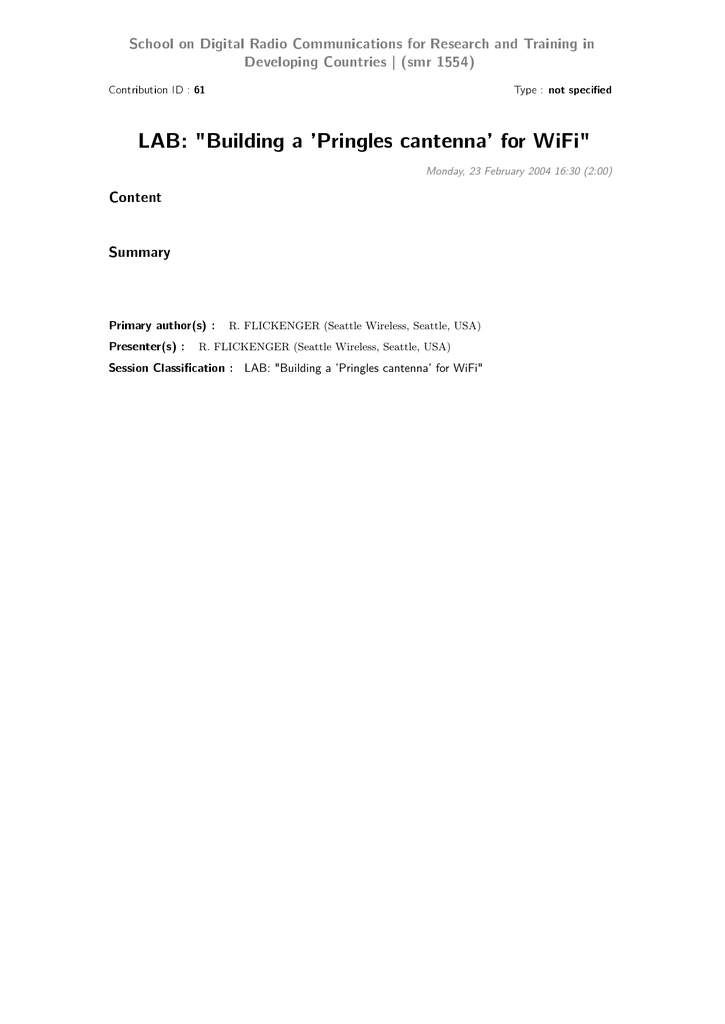 School on Digital Radio Communications for Research and Training in Developing Countries | (smr 1554) Contribution ID : 61 Type : not specied LAB: "Building a 'Pringles cantenna' for WiFi" Monday, 23 February 2004 16:30 (2:00) Content Summary Primary author(s) : R. FLICKENGER (Seattle Wireless, Seattle, USA) Presenter(s) : R. FLICKENGER (Seattle Wireless, Seattle, USA) Session Classication : LAB: "Building a ’Pringles cantenna’ for WiFi"