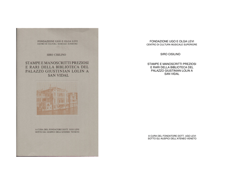 FONDAZIONE UGO E OLGA LEVI CENTRO DI CULTURA MUSICALE SUPERIORE SIRO CISILINO STAMPE E MANOSCRITTI PREZIOSI E RARI DELLA BIBLIOTECA DEL PALAZZO GIUSTINIAN LOLIN A SAN VIDAL A CURA DEL FONDATORE DOTT. UGO LEVI SOTTO GLI AUSPICI DELL’ATENEO VENETO Presentazione La Fondazione Ugo e Olga Levi — Centro di Cultura Musicale Superiore — ha avuto riconoscimento giuridico con decreto del Presidente della Repubblica del I agosto 1964 n. 1524, registrato alla Corte dei Conti il 19.1.1965 e pubblicato nella Gazzetta Ufficiale n. 21 del 26 gennaio 1965. Essa ha lo scopo di realizzare e di incoraggiare iniziative per l'incremento degli studi e della cultura musicale. La sua sede è nel Palazzo Giustinian Lolin di Venezia a San Vidal 2893, entrato a far parte del patrimonio della famiglia Levi nel 1876. Le norme statutarie sono state lungamente elaborate dai coniugi Ugo e Olga Levi che hanno destinato interamente il loro patrimonio a tale fine. La Fondazione è già dotata di una importante Biblioteca musicale frutto di una paziente raccolta di manoscritti e di stampe musicali che da diversi anni il suo Fondatore Dottor Ugo Levi sta collezionando con « inesausto amore per la musica » come ha ricordato nel suo testamento la di lui consorte Olga Brunner, che fu sollecita e amorosa collaboratrice nell'ideazione di questo ente che è destinato ad avere un importante ruolo nella vita culturale della nostra città. Fra le opere di maggiore rilievo della Biblioteca sono da annoverare stampe sia di musica madrigalesca che sacra del ' 500 e del ' 6oo, tanto in edizioni romane che in edizioni venete, ed opere teatrali francesi ed inglesi del ' 700 in edizioni coeve di Parigi e di Londra. Ed inoltre manoscritti che vanno da cantate di Cavalli e di Legrenzi ad opere per canto e strumenti di Benedetto Marcella e di Domenico Scarlatta concerti strumentali di Baldassare Galuppi, partiture per canto ed orchestra di opere italiane del ' 700 e dell'800, come la partitura de « / giochi di Agrigento » di Paisiello che servì (16 maggio 1792) per la inaugurazione del Teatro La Fenice. 2 Ugo Levi è socio affezionato dell'Ateneo Veneto dall'I aprile 1921 e ha fatto parte degli organi amministrativi dello stesso. Egli ha trovato in un altro eminente socio dello stesso Istituto il Sacerdote Prof. Siro Cisilino, profondo conoscitore di musiche antiche e realizzatore della fototeca dell'Istituto di musica veneta presso la Fondazione Cini, un collaboratore di grande merito per uno studio approfondito della sua importante Biblioteca. Fu così che V'Ateneo Veneto conscio dell'importanza della Fondazione e della sua Biblioteca, ha incoraggiato il socio Don Cisilino a predisporre una relazione documentata che illustrasse la notevole raccolta, intendendo in tale modo di onorare ad un tempo Ugo Levi per la grande benemerenza acquisita nel campo dell'arte Il testo della relazione tenuta il 20 maggio 1965 all'Ateneo Veneto e che ora viene pubblicato a cura del Fondatore è uno studio veramente importante che servirà da illuminata guida a quanti avranno bisogno di ricorrere a ricerche musicali. ENZO MILNER Ringrazio l'illustre e caro don Siro Cisilino per lo studio compiuto con grande competenza nella mia Biblioteca alla quale ho dedicato ogni mio affetto fin dalla mia gioventù. E ringrazio pure l'Ateneo Veneto e il suo Presidente avv. Enzo Milner, mio carissimo amico, che fu di guida a mia moglie e a me nel realizzare la Fondazione per avere preso l'iniziativa di fare conoscere il contenuto della mia cara Biblioteca. Presidente dell' Ateneo Veneto UGO LEVI Venezia, marzo 1966 Venezia, marzo 1966 3 La Biblioteca «Ugo Levi» di Palazzo Giustinian-Lolin a San Vidal è ormai una realtà di dominio pubblico : e quando la già approvata fondazione musicale « Olga e Ugo Levi » sarà in efficienza, anche la biblioteca musicale sarà messa a servizio degli studiosi. Essa è stata portata all' attuale ampiezza dal Commendatore Ugo Levi; ma fu cominciata ad adunare dal nonno suo Giacomo, figlio di Angelo (detto Anzolon), che abitava nelle Procuratie Vecchie in Piazza San Marco. Quel Giacomo fu un benemerito del teatro sociale di Treviso. Abitava molto anche nella sua splendida villa « Manfrin » a Sant' Artièn, nei sobborghi della città di Treviso. In quella villa oggi ha sede la divisione Folgore. Tutte le cinque figlie di Giacomo Levi suonavano l’arpa. Il nipote Ugo racconta che nonno Giacomo per aver partecipato d' inverno ad un ricevimento per i Reali d' Italia, a Palazzo Reale (in Venezia) si prese una polmonite di cui in due giorni morì e nelle tasche gli fu trovato il biglietto del teatro per partecipare alla prima del « Falstaff » di Verdi alla Scala di Milano, il 9 febbraio 1893. E per questa improvvisa morte, la prima figlia di Giacomo, Emma, non ha voluto mai, in vita, assistere a quell' opera. Un prozio del Commendatore Ugo, Samuele Levi, fratello della bisnonna, era 4 compositore di opere: il cartellone della Fenice del carnevale 184344 porta, fra le opere nuove, « La Giuditta », opera seria di Samuele Levi, appositamente scritta, su libretto di Giovanni Peruzzini. Nella biblioteca Levi c' è un fascicolo dattiloscritto : «Musica stampata e manoscritta del maestro e compositore di musica Cavalier Samuele Levi, nato a Venezia il 14 aprile 1816 e morto a Firenze il 18 maggio 1883». Questo elenco comprende 63 volumi; ne dò il sunto in 4 serie: 4 - Vari volumi di teorica musicale, fra i quali un volume (segnato col numero 57) «Appunti di lezioni di contrapunto avute a Berlino dal Professor Dehn» - Vari rotoli di musica sacra e anche di storia ed estetica musicale. Samuele Levi è morto a Firenze, dove si era trasferita la sua famiglia, e probabilmente i 63 volumi delle sue opere saranno ancora presso gli eredi. Alla Biblioteca Levi ci sono di lui: La Giuditta: partitura completa in due grandi tomi manoscritti autografi di Samuele Levi, quelli che servirono per la prima esecuzione alla Fenice (il 14 febbraio 18