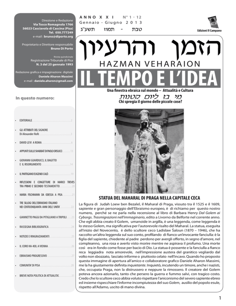 Direzione e Redazione Via Tosco Romagnola 1766 56023 Casciavola di Cascina (Pisa) Tel. 050.777249 e-mail : [email protected] Anno X X I n° 1 - 12 Gennaio - Giugno 2 0 1 3 Edizioni Il Campano Proprietario e Direttore responsabile Bruno Di Porto Rivista quindicinale Registrazione Tribunale di Pisa N. 3 del 25 gennaio 1993 Redazione grafica e impaginazione digitale Daniele Aharon Massimi e-mail : [email protected] HAZMAN VEHARAION IL TEMPO E L’IDEA Una finestra ebraica sul mondo – Attualità e Cultura In questo numero: Chi spregia il giorno delle piccole cose? • EDITORIALE........................................................2 • GLI ATTRIBUTI DEL SIGNORE Di Alexander Rofè..............................................3 • DAVID LEVI A ROMA ..........................................6 • APPUNTI SULLO SHABBAT DI PAOLO ORSUCCI............13 • GIOVANNI GUARDUCCI, IL BAGITTO E IL RISORGIMENTO..........................................14 • IL PARTIGIANO EUGENIO CALÒ.................................19 • RIFLESSIONI E CONGETTURE DI MARCO TREVES TRA PRIMO E SECONDO TESTAMENTTO..................20 • MARIA FISCHMANN DA ODESSA A PISA..............21 • TRE SILLOGI DELL’EBRAISMO ITALIANO NEI CENTOCINQUANTA ANNI DELL’ UNITA’................22 • GIANNETTO PAGGI DA PITIGLIANO A TRIPOLI.......23 • RASSEGNA BIBLIOGRAFICA.................................24 • NOTIZIE E RINGRAZIAMENTI................................25 • IL CORO HA-KOL A VIENNA..................................26 • EBRAISMO PROGRESSIVO ...................................27 • COMUNITA’ DI PISA.............................................28 • BREVE NOTA POLITICA DI ATTUALITA’...................31 STATUA DEL MAHARAL DI PRAGA NELLA CAPITALE CECA La figura di Judah Loew ben Bezalel, il Maharal di Praga, vissuto tra il 1525 e il 1609, sapiente e gran personaggio dell’Ebraismo europeo, è di richiamo per questo nostro numero, perché se ne parla nella recensione al libro di Barbara Henry Dal Golem ai Cyborgs. Trasmigrazioni nell’immaginario, edito a Livorno da Belforte nel corrente anno. Che egli abbia creato il Golem, umanoide in argilla, è una leggenda, come leggenda è lo stesso Golem, ma significativa per l’autorevole risalto del Maharal. La statua, eseguita all’inizio del Novecento, è dello scultore ceco Ladislaw Šaloun (1870 – 1946), che ha raccolto un’altra leggenda sul suo conto, profilando di fianco un’invocante fanciulla: è la figlia del sapiente, chiedente al padre perdono per avergli offerto, in segno d’amore, nel compleanno, una rosa e averlo visto morire mentre ne aspirava il profumo. Una morte così era in fondo come fosse per bacio di Dio. La statua è possente e la fanciulla a fianco reca leggiadra nota amorevole, nell’impressione austera del granitico vegliardo dal volto non sbozzato, lasciato informe o piuttosto celato nell’incavo. Quando ho proposto questa immagine di apertura all’amico e collaboratore grafico Daniele Aharon Massimi, me la ha giustamente definita inquietante. Inquietò, incutendo un timore, anche i nazisti, che, occupata Praga, non la distrussero e neppure la rimossero. Il creatore del Golem poteva ancora azionarlo, tanto che persero la guerra e fummo salvi, con tragico costo. Credo che lo scultore ceco abbia voluto rispettare l’aniconismo del severo sapiente ebreo ed insieme rispecchiare l’informe incompiutezza del suo Golem, ausilio del popolo esule, rispetto all’Adamo, uscito di mano divina. 1 HAZMAN VEHARAION - IL TEMPO E L’IDEA A nno X x I n° 1-12 Gennaio - Giugno 2013 E D I T O R I A L E D I I N T R O D U Z I O N E A Q U E S T O N U M E R 0 , I L P R I M O D E L L A X X I A N N ATA ll numero si apre con il testo di una conversazione di Alexander Rofè, professore di Mikrà (Bibbia, Primo Testamento o Bibbia ebraica), all’Università ebraica di Gerusalemme, sugli attributi divini, tenuta nel più recente incontro ebraico – cristiano di Camaldoli. Fa presente la grande varietà di generi del Primo Testamento, che è il complesso scritturale della civiltà ebraica nel corso di molti secoli, contenente materia di fede, ma anche legislazione, storia e letteratura, nonché la varietà evolutiva di tendenze di pensiero, tra l’altro in merito agli attributi divini, sulla base di fondamenti teologici, in una dialettica di interpretazioni: qui, in particolare, sulla disposizione divina al perdono. Continuando a trattare di David Levi, patriota e scrittore dell’Ottocento, si esamina l’atteggiamento verso Roma, dall’antitesi che egli sentiva, nel retaggio ebraico, per l’occupazione della Giudea e la distruzione di Gerusalemme, all’incontro diretto, quando venne nella città ambita dall’Italia, dopo la breccia di Porta Pia. Luogo adatto al rasserenamento dell’animo è la Cappella Sistina, con i dipinti biblici di Michelangelo, l’artista diletto, nello spirito dei profeti, che hanno riscattato il dramma storico di Israele in valori di redenzione universale, attuali per la liberazione d’Italia, in ideale convito di popoli. Per il rapporto, problematico e intenso, con Roma, si accosta l’esperienza di David Levi a quella successiva di Sigmund Freud. Due maggiori recensioni vertono su un libro di Barbara Henry, ordinaria di filosofia politica presso la Scuola Superiore Sant’Anna di Pisa, che, con trasmigrazioni nell’immaginario, percorre un cammino dal mito dell’umanoide d’argilla, assurto a pathos nel Golem, alla problematica attuale dei Cyborgs, e su uno studio di Fabrizio Franceschini, ordinario di linguistica italiana all’Università, egualmente di Pisa, sull’ uso del gergo ebraico livornese, il Bagitto, in composizioni letterarie di non ebrei. Tra questi vi è messo in rilievo biografico il sensale e capopopolo Giovanni Guarducci, seguace di Francesco Domenico Guerrazzi e volontario garibaldino. Entrambi i libri sono editi da Belforte, storica casa editrice livornese, rilanciata e diretta da Guido Guastall