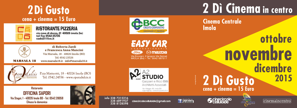 2 Dì Cinema in centro 2 Dì Gusto cena + cinema = 15 Euro Cinema Centrale Imola ottobre novembre dicembre 2cena Dì Gusto + cinema = 15 Euro Ristorante OFFICINA SAPORI Via Stagni, 1 - 40026 Imola BO - Tel. 0542.28058 Chiuso la domenica info 338 7315216 338 6891937 338 8128598 2015 2 Dì Gusto cena + cinema = 15 Euro 2 Dì Cinema martedì / mercoledì ore 21:30 PECORE IN ERBA mart. 27 ottobre SICARIO 3-4 novembre di Alberto Caviglia Con Davide Giordano, Anna Ferruzzo, Omero Antonutti, Bianca Nappi Commedia, 85 min. - Italia 2015 Luglio 2006. Leonardo Zuliani è scomparso. Da Trastevere la clamorosa notizia diventa vera e propria emergenza nazionale. Alla televisione ogni canale parla di lui: da Sgarbi a Freccero, da De Bortoli a De Cataldo (tutti nel ruolo di loro stessi), commenti e interrogativi si sprecano. Genio della comunicazione, fumettista di successo, stilista visionario, scrittore di grido, attivista dei diritti civili: ma chi è veramente Leonardo? Divertente e creativo mockumentary, che ha il merito di fare una critica surreale all'imperante revisionismo storico e al dilagante opinionismo da salotto. L'esordiente Caviglia convince per originalità e freschezza. Cinema Centrale - Via Emilia, 212 - Imola ingresso euro 5 - ridotto 4,50 - tessera associativa euro 2 LA VITA È FACILE AD OCCHI CHIUSI mart. 17 novembre di David Trueba Con Javier Cámara, Natalia de Molina, Francesc Colomer, Ramon Fontserè Commedia, 104 min. - Spagna 2014 Spagna, estate 1966: un professore che usa i testi dei Beatles (trascritti a orecchio) per insegnare l'inglese ai suoi alunni viene a conoscenza che John Lennon è in Almeria (Andalusia) per girare un film e si mette in testa di incontrarlo per farsi aiutare a completare le lacunose trascrizioni. Intraprende dunque un viaggio in macchina verso il Sud, e lungo il percorso monta su in macchina una ragazzo di 16 anni, fuggito di casa, e una giovane ragazza di 21 che pure sembra scappare da qualcosa. Tra i tre nascerà un’amicizia indimenticabile. Il titolo è un verso di Strawberry fields forever. SOPRAVVISSUTO - THE MARTIAN 24-25 novembre di Denis Villeneuve Con Benicio Del Toro, Emily Blunt, Josh Brolin, Jon Bernthal Thriller, 121 min. - USA 2015 Terzetto d’attori in stato di grazia per uno dei film più duri della stagione. Villeneuve dà corpo a un’opera che porta in sé i semi del miglior cinema di genere, scolpito dalle immagini di Roger Deakins, che staglia le silhouette dei protagonisti in un bianco melmoso e abbacinante o nel buio più oscuro: quando la fotografia restituisce l’anima più profonda del racconto e la tecnica si fa poesia. Il regista canadese porta un affondo più radicale ed estremo sulla materia, inscenando la guerra al narcotraffico come una discesa nei gironi di un inferno dei vivi dove ogni speranza è irrimediabilmente perduta. di Ridley Scott Con Matt Damon, Jessica Chastain, Kristen Wiig, Mackenzie Davis Fantascienza, 130 min. - USA 2015 Ridley Scott torna nella spazio con una storia fatalmente coinvolgente, magnificamente fotografata e montata con un buon ritmo. Durante una missione su Marte, l'astronauta Mark Watney viene considerato morto dopo una forte tempesta e per questo abbandonato dal suo equipaggio. Ma Watney è sopravvissuto e ora si ritrova solo sul pianeta ostile. Con scarse provviste, deve attingere al suo ingegno, alla sua arguzia e al suo spirito di sopravvivenza per trovare un modo per segnalare alla Terra che è vivo. A milioni di chilometri di distanza, la NASA e un team di scienziati internazionali lavorano instancabilmente per cercare di portare "il marziano" a casa. NON ESSERE CATTIVO 10-11 novembre THE LOBSTER di Yorgos Lanthimos di Claudio Caligari. Con Luca Marinelli, Alessandro Borghi, Silvia D'Amico, Roberta Mattei Drammatico, 100 min. - Italia 2015 L’ultimo film di Claudio Caligari è un'opera inevitabilmente testamentaria ma che trasuda grinta, rabbia e vitalità da ogni fotogramma. Senza dare giudizi, il regista osserva partecipe il viaggio privo di salvezza - (r)esiste soltanto un vago anelito di speranza - di questi perdenti, interpretati dai bravissimi Luca Marinelli e Alessandro Borghi, così dipendenti dalla voglia di rivalsa da finire schiacciati sotto il peso della vita. Il film, presentato fuori concorso alla Mostra del cinema di Venezia, è stato scelto per rappresentare l'Italia agli Oscar nella selezione per il miglior film in lingua straniera. mart. 1 dicembre Con Colin Farrell, Rachel Weisz, Léa Seydoux, Ben Whishaw, John C. Reilly Drammatico, Sentimentale - 118 min. FR-GB-EL 2015 In un futuro prossimo e immaginario essere single oltre una certa età è vietato, pena l'arresto e la deportazione in un grande hotel nel quale si è obbligati a trovare l'anima gemella in 45 giorni di tempo, tra punizioni e questionari assurdi, pena la trasformazione in un animale a propria scelta. Visionario e folle progetto del regista greco Yorgos Lanthimos in cui la violenza onnipresente, spietata, brutale e insensibile sembra una versione concreta di quella più sottile violenza psicologica operata dal condizionamento sociale. Premio della Giuria al Festival di Cannes 2015.
