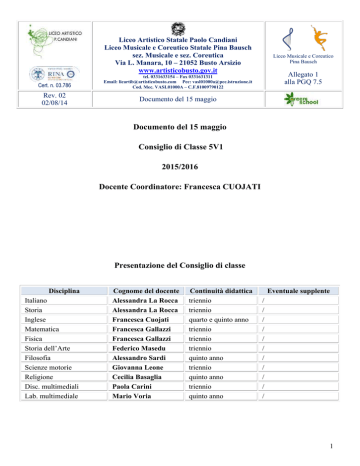Liceo Artistico Statale Paolo Candiani Liceo Musicale e Coreutico Statale Pina Bausch sez. Musicale e sez. Coreutica Via L. Manara, 10 – 21052 Busto Arsizio www.artisticobusto.gov.it Cert. n. 03.786 Rev. 02 02/08/14 Liceo Musicale e Coreutico Pina Bausch Allegato 1 alla PGQ 7.5 tel. 0331633154 – Fax 0331631311 Email: [email protected] Pec: [email protected] Cod. Mec. VASL01000A – C.F.81009790122 Documento del 15 maggio Documento del 15 maggio Consiglio di Classe 5V1 2015/2016 Docente Coordinatore: Francesca CUOJATI Presentazione del Consiglio di classe Disciplina Italiano Storia Inglese Matematica Fisica Storia dell’Arte Filosofia Scienze motorie Religione Disc. multimediali Lab. multimediale Cognome del docente Alessandra La Rocca Alessandra La Rocca Francesca Cuojati Francesca Gallazzi Francesca Gallazzi Federico Masedu Alessandro Sardi Giovanna Leone Cecilia Basaglia Paola Carini Mario Voria Continuità didattica triennio triennio quarto e quinto anno triennio triennio triennio quinto anno triennio quinto anno triennio quinto anno Eventuale supplente / / / / / / / / / / / 1 Informazioni sull’indirizzo di Studi: Indirizzo nel triennio “AUDIOVISIVO E MULTIMEDIALE Piano Orario biennio e triennio Disciplina Italiano Storia Inglese Matematica Fisica Scienze naturali Storia dell’Arte Filosofia Scienze motorie Religione Laboratorio artistico Disc. plastiche e scultoree Disc. grafiche e pittoriche Disc. geometriche Disc. audiovis. e multimed. Lab. audiovis. e multimed. Totale ore 1° anno 132 99 99 99 / 66 99 / 66 33 99 99 132 99 / / 1122 2° anno 132 99 99 99 / 66 99 / 66 33 99 99 132 99 / / 1122 3° anno 132 66 99 66 66 66 99 66 66 33 / / / / 198 198 1155 4° anno 132 66 99 66 66 66 99 66 66 33 / / / / 198 198 1155 5° anno 132 66 99 66 66 99 66 66 33 / / / / 198 264 1155 Profilo professionale Gli studenti, a conclusione del percorso di studio, oltre a raggiungere i risultati di apprendimento comuni, dovranno: • avere approfondito la conoscenza degli elementi costitutivi dei linguaggi audiovisivi e multimediali negli aspetti espressivi e comunicativi, avere consapevolezza dei fondamenti storici e concettuali; • conoscere le principali linee di sviluppo tecniche e concettuali delle opere audiovisive contemporanee e le intersezioni con le altre forme di espressione e comunicazione artistica; • conoscere e applicare le tecniche adeguate nei processi operativi, avere capacità procedurali in funzione della contaminazione tra le tradizionali specificazioni disciplinari; • conoscere e saper applicare i principi della percezione visiva e della composizione dell’immagine. Presentazione e giudizio sulla classe Al principio del triennio la classe era composta da ventotto elementi, dei quali diversi al termine della terza classe ed alcuni al termine della quarta non hanno raggiunto gli obbiettivi stabiliti dal corso di studi. Le sedici ragazze che oggi compongono la classe, pur differenziandosi per capacità, attitudini e preparazione di base, hanno però dimostrato costante diligenza e impegno nel prendere parte al dialogo educativo. Nel corso del triennio queste studentesse hanno dimostrato un crescente interesse per le discipline di indirizzo e hanno partecipato attivamente agli itinerari educativi previsti anche dalle materie scientifiche e umanistiche. Spesso coinvolte in progetti e iniziative curricolari ed extracurricolari, anche nel corso del quinto ed ultimo anno di Liceo Artistico, quasi tutte le studentesse si sono rivelate capaci di lavorare proficuamente sia in gruppo sia in autonomia. La loro 2 intraprendenza e originalità nel processo creativo hanno avuto modo di emergere nel campo multimediale e audiovisivo ed affermarsi in occasione della partecipazione a concorsi, il cui esito più di una volta le ha viste incluse nella rosa dei vincitori o vincitrici del primo premio. Nella classe, alcune ragazze si sono distinte per conoscenze e competenze ottime, autonomia, capacità critiche e inventiva sia nella materie di indirizzo sia in quelle di studio. Un ulteriore gruppo della classe comprende studentesse maggiormente inclini a impegnarsi e ottenere risultati positivi soprattutto nelle materie di indirizzo. Numero studenti Abbandoni o ritiri Maschi: Femmine: 16 Numero: / Provenienza Candidati privatisti Stessa scuola: 16 Altra scuola: / Numero: / Obiettivi del Consiglio di classe acquisizione dei contenuti e degli strumenti imprescindibili delle diverse discipline; conoscenza dei diversi approcci e del metodo di studio relativo alle diverse discipline; conoscenza approfondita dei linguaggi specifici relativi anche all'indirizzo prescelto; conoscenza articolata di contesti storici, culturali e artistici, fino alle correnti contemporanee. Capacità di ascolto Capacità di osservazione Capacità di comprensione Capacità logiche Capacità comunicative Capacità propositive e creative Declinazione Capacità e competenze Saper cogliere nella struttura di un discorso orale i nuclei centrali della comunicazione, distinguendoli da aspetti di sostegno e di esemplificazione; Saper schematizzare i punti essenziali della comunicazione. Saper tradurre gli schemi in appunti. Saper cogliere i vari elementi che compongono un tutto; Saper cogliere le relazioni e i rapporti tra le parti di una realtà tridimensionale; Saper individuare gli elementi proporzionali di un dato oggetto; Saper mettere in relazione la realtà con i metodi di rappresentazione bidimensionali e tridimensionali. Saper selezionare segmenti, distinguendo informazioni principali da informazioni secondarie; Saper individuare concetti di particolare rilievo e costruire schemi; Saper impostare e risolvere problemi (problem solving). Saper cogliere concetti e instaurare relazioni tra essi; Saper essere pertinente alla tematica proposta e consequenziale nelle affermazioni; Saper individuare i passaggi ordinati e logici che conducono alla risoluzione di un problema. Saper usare con consapevolezza i linguaggi nei proces