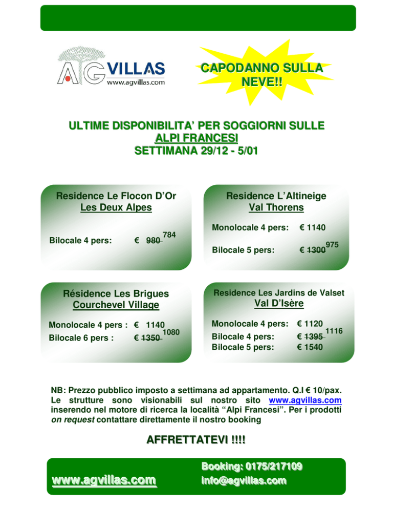 C CA APODAN NNO O SULLA N NE EV VE!!! ULLTIME DIIS SP PO ONIIB BILITA’ P PE ER R SOG GGIIOR RN NI S SU ULLLLE ALPI FFRA AN NCESI S SE ETTTIMANA A 299/122 -- 5//011 Residence Le Flocon D’Or Les Deux Alpes Bilocale 4 pers: € 980 784 Résidence Les Brigues Courchevel Village Residence L’Altineige Val Thorens Monolocale 4 pers: € 1140 Bilocale 5 pers: € 1300 Residence Les Jardins de Valset Val D’Isère Monolocale 4 pers : € 1140 Monolocale 4 pers: € 1120 Bilocale 6 pers : Bilocale 4 pers: Bilocale 5 pers: € 1395 € 1540 € 1350 1080 975 1116 NB: Prezzo pubblico imposto a settimana ad appartamento. Q.I € 10/pax. Le strutture sono visionabili sul nostro sito www.agvillas.com inserendo nel motore di ricerca la località “Alpi Francesi”. Per i prodotti on request contattare direttamente il nostro booking AFFFRETTA ATE EV VII !!!!!! www.aagvilllass..co om B Booookkiinngg:: 00117755//221177110099 iinnffoo@ @aaggvviillllaass..ccoom m