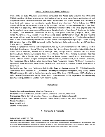 Parco Della Musica Jazz Orchestra From 2005 to 2010 Maurizio Giammarco conducted the Parco della Musica Jazz Orchestra (PMJO), resident big band at the roman Auditorium with the same name (www.auditorium.it), and supported by the Fondazione Musica per Roma. Born on the trail of the Roman Jazz Ensemble, a long lived unit leaded by trombonist Mario Corvini and drummer Pietro Iodice, the PMJO presented the same personnel, made up by some of the best roman professionals in the field. From the very beginning PMJO worked to different directions on the same time: original projects by the orchestra main composers (Giammarco, Corvini, Iodice), "Jazz Focus" dedicated to italian arrangers, "Jazz Memories" dedicated to the big band great traditions (Ellington, Basie, Thad Jones, W.Herman etc.), special events trespassing classic contemporary music to the valuable exchange with some of the world most renowed jazz composers and artists. The band established itself as one of the most important new realities of the contemporary european jazz scene, playing 106 concerts (up to the 2010 summer), in the Auditorium, Italy and abroad as well (Argentina, Spain, Mexico, Germany). Among the great conductors and composers invited by PMJO we remember: Bill Holman, Martial Solal, Bob Brookmeyer, Kenny Wheeler, Uri Caine, Karl Berger, Maria Schneider, Mike Gibbs, Frank Tiberi, Perico Sambeat, Michel Portal, George Lewis, Giorgio Gaslini, Riccardo Del Fra, Paolo Damiani, Bruno Tommaso, Marcello Rosa, Franco Piana e Marco Tiso. Among the artists: Dee Dee Bridgewater, Maria Pia De Vito, Norma Winston, Petra magoni, Ingrid Sesto, Alan Farrington, Cinzia Tedesco, Mario Castiglia, il compianto Maurizio Rota, Irene Grandi, Raiz, Frankie Lovecchio, Roy Hardgrove, Flavio Boltro, Mike Stern, David Fuze Fiuczynski, Horacio "El Negro" Hernandez, Nguyen Lê, Raed Khoshaba, Dino Piana, Paolo Fresu, Javier Girotto, Antonio Iasevoli, Enrico Rava e Gino Paoli. During the past five years PMJO recorded five CD: Open on Sunday (double CD -‐ PMJO & Maurizio Giammarco -‐PDM Records 2011), Alla Casa Del Jazz (with l’Espresso magazine, may 2007), Electric Miles Directions (Live at the Auditorium, special guest Mike Stern -‐PDM Records 2007), Dedicato a Lelio Luttazzi (PMJO conducted by Gianni Ferrio -‐PDM Records 2006), Argentina: Escenas en Big Band (special guest Javier Girotto -‐PDM Records 2006). Personnel Conduction and saxophones: Maurizio Giammarco Trumpets: Fernando Brusco, Claudio Corvini, Giancarlo Ciminelli, Aldo Bassi. Trombones: Mario Corvini, Massimo Pirone, Luca Giustozzi, Roberto Pecorelli. Saxophones: Gianni Oddi, Daniele Tittarelli, Gianni Savelli, Marco Conti, Elvio Ghigliordini. Piano: Pino Iodice. Bass: Luca Pirozzi Drums: Pietro Iodice A -‐ Concerts & Projects EXPANDING MILES '65 -‐'68 by & with Maurizio Giammarco (composer, conductor, saxes) and Flavio Boltro (trumpet) The music from the fabulous Miles Davis Quintet of the sixties (with Wayne Shorter, Herbie Hancock, Ron Carter e Tony Williams), seldom played by the same group that recorded it, lives again in Giammarco's arrangements, where the bet is to merry the legendary small group repertoire with the writing and the sound of the big band. SOHO MOODS: a Glance at the Seventies New York Loft Scene. By Maurizio Giammarco (composing, saxophone) and Roberta Escamilla Garrison (coreographer) feturing: Djassi De Costa Johnson, Cinzia Franchi, Tery Weikel (dance). The New York artistic avantgarde of the seventies found in the soho loft scene a place to live a season of very special and significant creativity and experimentalism. Soho Moods is a jazz+dance project born with the wish to bring back a suggestion of those times, places and feelings through the eyes of a witness. The original music (with some adds by Don Cherry, Stevie Wonder, Joe Zawinul and Herbie Hancock) has been composed by Maurizio Giammarco (PMJO' director and sax soloist), while the coreographies are by Roberta Escamilla Garrison who comes from the Merce Cunningham legacy but, being also Jimmy Garrison's wife, has been deeply connected with the afro-‐american culture through the years. BEAT BOP: A Free Association of ideas By Mario Corvini (composer and arranger) and Alfredo Saitto (text and direction). Featuring Massimo Venturiello (voice) e Maurizio Giammarco (sax soloist). New ideas give birth to new languages. This happened in jazz with the Be Bop revolution and in literature with the Beat Generation, and these two languages had and still have a deep relationship, showing their disruptive drive. Like in the past, the project Beat Bop links the two languages in a new multidisciplinary project build in seven parts, seven feelings, seven colours and seven compositions. The beautiful voice af actor Massimo Venturiello and the expressive energie of Giammarco's saxophone blend with the new original music composed by trombonist Mario Corvini, expressly conceived for the PMJO, with lirics by Alfredo Saitto ispired by the Beat poets. THE SINDBAD JOURNEY By Pino Iodice and Raed Khoshaba. Featuring Raed Khoshaba (Oud, composing), Giuliana Soscia (Fisarmonica), Emanuele Smimmo (Percussions), Pino Iodice (Piano, composing and arranging) Raed Khoshaba, iraqi oud master german resident, and Pino Iodice, composer and piano player with the PMJO, have merged their musical worlds in one unified project, born with the idea of a multiethnic contamination that looks at music as a powerful, joining tool between different cultures. Pino's usual interest in the mediterranean ethnic musical heritage moves the big band sound towards new timbrical shapes and directions. STRATA-‐JAM-‐MUSIC: Maurizio Giammarco Music. A longtime composer with a recognizable style, Maurizio Giammarco, in the very recent years, has assembled a remarkable body of orchestral charts (expecially conceived for the PMJO), here presented in concert. His writing concept, starting from a passional, occasionally romantic, rendition o