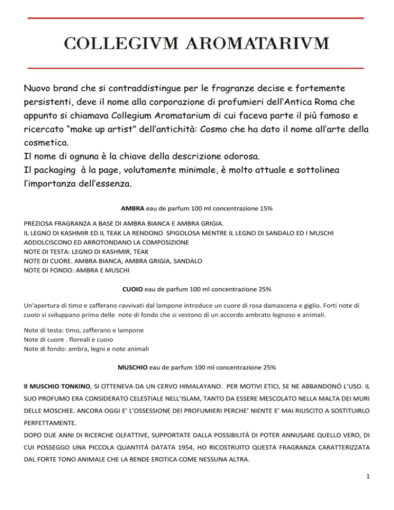 Nuovo brand che si contraddistingue per le fragranze decise e fortemente persistenti, deve il nome alla corporazione di profumieri dell’Antica Roma che appunto si chiamava Collegium Aromatarium di cui faceva parte il più famoso e ricercato “make up artist” dell’antichità: Cosmo che ha dato il nome all’arte della cosmetica. Il nome di ognuna è la chiave della descrizione odorosa. Il packaging à la page, volutamente minimale, è molto attuale e sottolinea l’importanza dell’essenza. AMBRA eau de parfum 100 ml concentrazione 15% PREZIOSA FRAGRANZA A BASE DI AMBRA BIANCA E AMBRA GRIGIA. IL LEGNO DI KASHMIR ED IL TEAK LA RENDONO SPIGOLOSA MENTRE IL LEGNO DI SANDALO ED I MUSCHI ADDOLCISCONO ED ARROTONDANO LA COMPOSIZIONE NOTE DI TESTA: LEGNO DI KASHMIR, TEAK NOTE DI CUORE. AMBRA BIANCA, AMBRA GRIGIA, SANDALO NOTE DI FONDO: AMBRA E MUSCHI CUOIO eau de parfum 100 ml concentrazione 25% Un'apertura di timo e zafferano ravvivati dal lampone introduce un cuore di rosa damascena e giglio. Forti note di cuoio si sviluppano prima delle note di fondo che si vestono di un accordo ambrato legnoso e animali. Note di testa: timo, zafferano e lampone Note di cuore . floreali e cuoio Note di fondo: ambra, legni e note animali MUSCHIO eau de parfum 100 ml concentrazione 25% Il MUSCHIO TONKINO, SI OTTENEVA DA UN CERVO HIMALAYANO. PER MOTIVI ETICI, SE NE ABBANDONÓ L’USO. IL SUO PROFUMO ERA CONSIDERATO CELESTIALE NELL’ISLAM, TANTO DA ESSERE MESCOLATO NELLA MALTA DEI MURI DELLE MOSCHEE. ANCORA OGGI E’ L’OSSESSIONE DEI PROFUMIERI PERCHE’ NIENTE E’ MAI RIUSCITO A SOSTITUIRLO PERFETTAMENTE. DOPO DUE ANNI DI RICERCHE OLFATTIVE, SUPPORTATE DALLA POSSIBILITÁ DI POTER ANNUSARE QUELLO VERO, DI CUI POSSEGGO UNA PICCOLA QUANTITÁ DATATA 1954, HO RICOSTRUITO QUESTA FRAGRANZA CARATTERIZZATA DAL FORTE TONO ANIMALE CHE LA RENDE EROTICA COME NESSUNA ALTRA. 1 OLIBANUM eau de parfum 100 ml concentrazione 25% Una fragranza dedicata all’incenso. Le resine sono sovrane nella composizione che inizia con la freschezza del rosmarino e la fragranza del pepe nero. I legni di cedro, oud , sandalo e gayac preaparano l’olfatto ai misteri dell’incenso etiope che traspare nel cuore della fragranza. Ambra, iris, vetyver e muschi compongono il finale. Note di testa: pepe e rosmarino Note di cuore: legni di oud, cedro, sandalo e gayac. Incenso Note di fondo: ambra, iris, vetyver, muschio. ROSA BULGARA eau de parfum 100 ml concentrazione 25% MONOTEMATICO DI GRANDE EFFETTO E PERSISTENZA LA ROSA BULGARA COME OLIO ESSENZIALE E COME ASSOLUTA NE FANNO UNA FRAGRANZA ESCLUSIVA , DEGNA DELLA REGINA DI FIORI. NOTE DI TESTA: ROSA BULGARA IN OLIO ESSENZIALE NOTE DI CUORE: ROSA BULGARA OLIO ESSENZIALE E ASSOLUTA NOTE DI FONDO: ROSA BULGARA ESSENZA , MUSCHI SYNTHESIS eau de parfum 100 ml concentrazione 25% Fragranza costituita integralmente da componenti sintetiche e totalmente priva di allergeni. L’ho creata durante una lectio magistralis che ho tenuto presso l’Università di Venezia, Cà Foscari, per gli studenti della facoltà di Scienze Molecolari. Apre con note frizzanti ed agrumate di scorza di pompelmo, bergamotto,limetta e neroly. Alle note fruttate di ananas, lampone e moscato seguono le note verdi degli aghi di pino, delle foglie di edera, del trifoglio e della radice di vetyver. E’ il momento del jus floreale composto dalle costituenti della rosa, della gardenia, della violetta, dell’iris e del gelsomino. Note legnose delle componenti del sandalo e del legno cedro che riportano alla mente le scatole di sigari e del legno della matita, anticipano le note acquatiche che compongono un fresco finale di vanillina, ambroxan e muschi bianchi. Un profumo estremamente intrigante. NOTEDI TESTA: SCORZA DI POMPELMO, LIMETTA, ANANAS NOTE DI CUORE: FLOREALI E LEGNOSE NOTE DI FONDO: VANIGLIATE, AMBRATE, MUSCHI 2