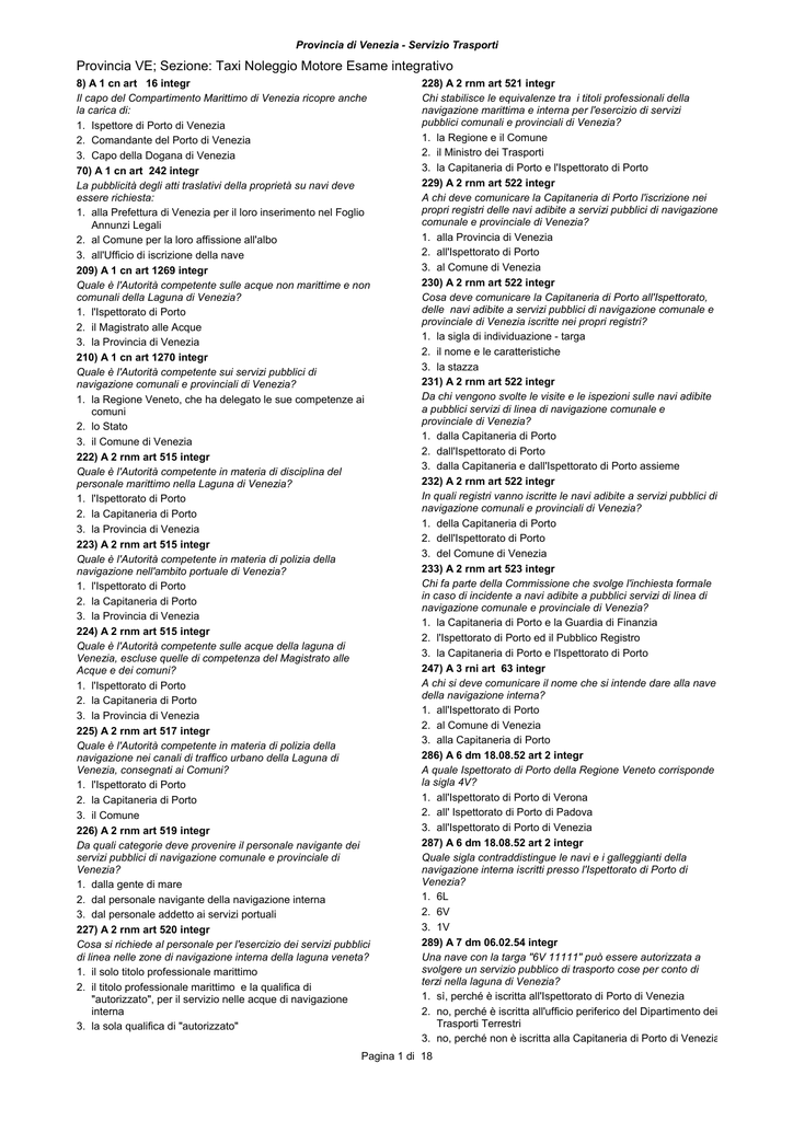 Provincia di Venezia - Servizio Trasporti Provincia VE; Sezione: Taxi Noleggio Motore Esame integrativo 8) A 1 cn art 16 integr Il capo del Compartimento Marittimo di Venezia ricopre anche la carica di: 1. Ispettore di Porto di Venezia 2. Comandante del Porto di Venezia 3. Capo della Dogana di Venezia 70) A 1 cn art 242 integr La pubblicità degli atti traslativi della proprietà su navi deve essere richiesta: 1. alla Prefettura di Venezia per il loro inserimento nel Foglio Annunzi Legali 2. al Comune per la loro affissione all'albo 3. all'Ufficio di iscrizione della nave 209) A 1 cn art 1269 integr Quale è l'Autorità competente sulle acque non marittime e non comunali della Laguna di Venezia? 1. l'Ispettorato di Porto 2. il Magistrato alle Acque 3. la Provincia di Venezia 210) A 1 cn art 1270 integr Quale è l'Autorità competente sui servizi pubblici di navigazione comunali e provinciali di Venezia? 1. la Regione Veneto, che ha delegato le sue competenze ai comuni 2. lo Stato 3. il Comune di Venezia 222) A 2 rnm art 515 integr Quale è l'Autorità competente in materia di disciplina del personale marittimo nella Laguna di Venezia? 1. l'Ispettorato di Porto 2. la Capitaneria di Porto 3. la Provincia di Venezia 223) A 2 rnm art 515 integr Quale è l'Autorità competente in materia di polizia della navigazione nell'ambito portuale di Venezia? 1. l'Ispettorato di Porto 2. la Capitaneria di Porto 3. la Provincia di Venezia 224) A 2 rnm art 515 integr Quale è l'Autorità competente sulle acque della laguna di Venezia, escluse quelle di competenza del Magistrato alle Acque e dei comuni? 1. l'Ispettorato di Porto 2. la Capitaneria di Porto 3. la Provincia di Venezia 225) A 2 rnm art 517 integr Quale è l'Autorità competente in materia di polizia della navigazione nei canali di traffico urbano della Laguna di Venezia, consegnati ai Comuni? 1. l'Ispettorato di Porto 2. la Capitaneria di Porto 3. il Comune 226) A 2 rnm art 519 integr Da quali categorie deve provenire il personale navigante dei servizi pubblici di navigazione comunale e provinciale di Venezia? 1. dalla gente di mare 2. dal personale navigante della navigazione interna 3. dal personale addetto ai servizi portuali 227) A 2 rnm art 520 integr Cosa si richiede al personale per l'esercizio dei servizi pubblici di linea nelle zone di navigazione interna della laguna veneta? 1. il solo titolo professionale marittimo 2. il titolo professionale marittimo e la qualifica di "autorizzato", per il servizio nelle acque di navigazione interna 3. la sola qualifica di "autorizzato" 228) A 2 rnm art 521 integr Chi stabilisce le equivalenze tra i titoli professionali della navigazione marittima e interna per l'esercizio di servizi pubblici comunali e provinciali di Venezia? 1. la Regione e il Comune 2. il Ministro dei Trasporti 3. la Capitaneria di Porto e l'Ispettorato di Porto 229) A 2 rnm art 522 integr A chi deve comunicare la Capitaneria di Porto l'iscrizione nei propri registri delle navi adibite a servizi pubblici di navigazione comunale e provinciale di Venezia? 1. alla Provincia di Venezia 2. all'Ispettorato di Porto 3. al Comune di Venezia 230) A 2 rnm art 522 integr Cosa deve comunicare la Capitaneria di Porto all'Ispettorato, delle navi adibite a servizi pubblici di navigazione comunale e provinciale di Venezia iscritte nei propri registri? 1. la sigla di individuazione - targa 2. il nome e le caratteristiche 3. la stazza 231) A 2 rnm art 522 integr Da chi vengono svolte le visite e le ispezioni sulle navi adibite a pubblici servizi di linea di navigazione comunale e provinciale di Venezia? 1. dalla Capitaneria di Porto 2. dall'Ispettorato di Porto 3. dalla Capitaneria e dall'Ispettorato di Porto assieme 232) A 2 rnm art 522 integr In quali registri vanno iscritte le navi adibite a servizi pubblici di navigazione comunali e provinciali di Venezia? 1. della Capitaneria di Porto 2. dell'Ispettorato di Porto 3. del Comune di Venezia 233) A 2 rnm art 523 integr Chi fa parte della Commissione che svolge l'inchiesta formale in caso di incidente a navi adibite a pubblici servizi di linea di navigazione comunale e provinciale di Venezia? 1. la Capitaneria di Porto e la Guardia di Finanzia 2. l'Ispettorato di Porto ed il Pubblico Registro 3. la Capitaneria di Porto e l'Ispettorato di Porto 247) A 3 rni art 63 integr A chi si deve comunicare il nome che si intende dare alla nave della navigazione interna? 1. all'Ispettorato di Porto 2. al Comune di Venezia 3. alla Capitaneria di Porto 286) A 6 dm 18.08.52 art 2 integr A quale Ispettorato di Porto della Regione Veneto corrisponde la sigla 4V? 1. all'Ispettorato di Porto di Verona 2. all' Ispettorato di Porto di Padova 3. all'Ispettorato di Porto di Venezia 287) A 6 dm 18.08.52 art 2 integr Quale sigla contraddistingue le navi e i galleggianti della navigazione interna iscritti presso l'Ispettorato di Porto di Venezia? 1. 6L 2. 6V 3. 1V 289) A 7 dm 06.02.54 integr Una nave con la targa "6V 11111" può essere autorizzata a svolgere un servizio pubblico di trasporto cose per conto di terzi nella laguna di Venezia? 1. sì, perché è iscritta all'Ispettorato di Porto di Venezia 2. no, perché è iscritta all'ufficio periferico del Dipartimento dei Trasporti Terrestri 3. no, perché non è iscritta alla Capitaneria di Porto di Venezia Pagina 1 di 18 Provincia di Venezia - Servizio Trasporti Provincia VE; Sezione: Taxi Noleggio Motore Esame integrativo 290) A10 dpr 135/00 art. 1 integr Quali sono i compartimenti marittiimi che interessano il territorio della Regione Veneto? 1. Venezia 2. Venezia e Chioggia 3. Venezia e Trieste 292) A11 dm 18.07.59 integr In quale registro è iscritta una nave contraddistinta dal segno di individuzione "1VE 1036"? 1. nei registri delle navi minori e dei galleggianti della Delegazione di Spiaggia di Pellestrina 2. nei registri delle navi addette alla navigazione interna 3. nei registri tenuti dall'Ispettorato di Porto 293) A11 dm 18.07.59 integr Una imbarcazione con la