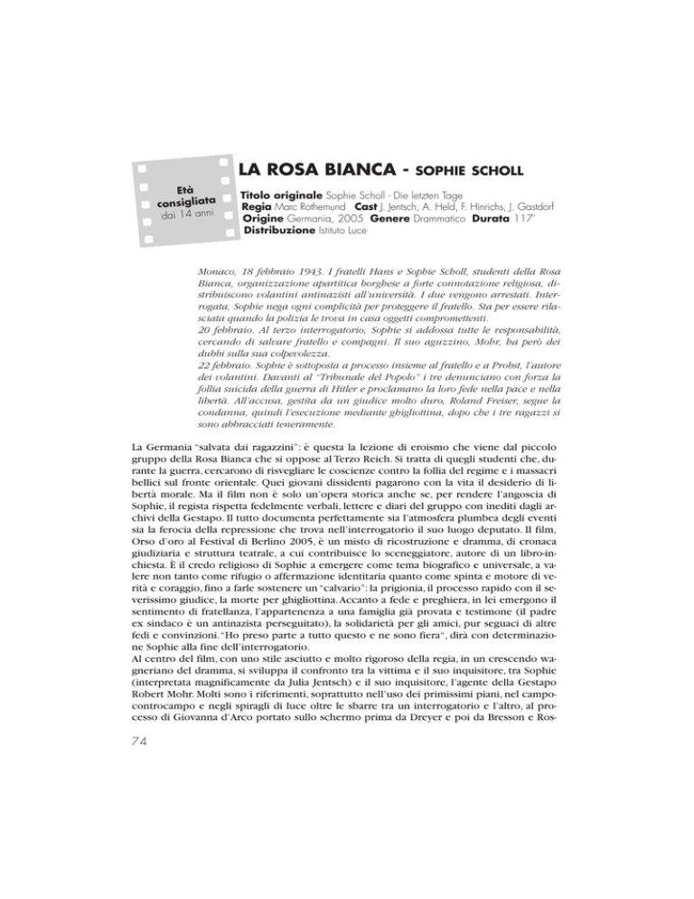 LA ROSA BIANCA Età consigliata dai 14 anni SOPHIE SCHOLL Titolo originale Sophie Scholl - Die letzten Tage Regia Marc Rothemund Cast J. Jentsch, A. Held, F. Hinrichs, J. Gastdorf Origine Germania, 2005 Genere Drammatico Durata 117’ Distribuzione Istituto Luce Monaco, 18 febbraio 1943. I fratelli Hans e Sophie Scholl, studenti della Rosa Bianca, organizzazione apartitica borghese a forte connotazione religiosa, distribuiscono volantini antinazisti all’università. I due vengono arrestati. Interrogata, Sophie nega ogni complicità per proteggere il fratello. Sta per essere rilasciata quando la polizia le trova in casa oggetti compromettenti. 20 febbraio. Al terzo interrogatorio, Sophie si addossa tutte le responsabilità, cercando di salvare fratello e compagni. Il suo aguzzino, Mohr, ha però dei dubbi sulla sua colpevolezza. 22 febbraio. Sophie è sottoposta a processo insieme al fratello e a Probst, l’autore dei volantini. Davanti al “Tribunale del Popolo” i tre denunciano con forza la follia suicida della guerra di Hitler e proclamano la loro fede nella pace e nella libertà. All’accusa, gestita da un giudice molto duro, Roland Freiser, segue la condanna, quindi l’esecuzione mediante ghigliottina, dopo che i tre ragazzi si sono abbracciati teneramente. La Germania “salvata dai ragazzini”: è questa la lezione di eroismo che viene dal piccolo gruppo della Rosa Bianca che si oppose al Terzo Reich. Si tratta di quegli studenti che, durante la guerra, cercarono di risvegliare le coscienze contro la follia del regime e i massacri bellici sul fronte orientale. Quei giovani dissidenti pagarono con la vita il desiderio di libertà morale. Ma il film non è solo un’opera storica anche se, per rendere l’angoscia di Sophie, il regista rispetta fedelmente verbali, lettere e diari del gruppo con inediti dagli archivi della Gestapo. Il tutto documenta perfettamente sia l’atmosfera plumbea degli eventi sia la ferocia della repressione che trova nell’interrogatorio il suo luogo deputato. Il film, Orso d’oro al Festival di Berlino 2005, è un misto di ricostruzione e dramma, di cronaca giudiziaria e struttura teatrale, a cui contribuisce lo sceneggiatore, autore di un libro-inchiesta. È il credo religioso di Sophie a emergere come tema biografico e universale, a valere non tanto come rifugio o affermazione identitaria quanto come spinta e motore di verità e coraggio, fino a farle sostenere un “calvario”: la prigionia, il processo rapido con il severissimo giudice, la morte per ghigliottina.Accanto a fede e preghiera, in lei emergono il sentimento di fratellanza, l’appartenenza a una famiglia già provata e testimone (il padre ex sindaco è un antinazista perseguitato), la solidarietà per gli amici, pur seguaci di altre fedi e convinzioni.“Ho preso parte a tutto questo e ne sono fiera“, dirà con determinazione Sophie alla fine dell’interrogatorio. Al centro del film, con uno stile asciutto e molto rigoroso della regia, in un crescendo wagneriano del dramma, si sviluppa il confronto tra la vittima e il suo inquisitore, tra Sophie (interpretata magnificamente da Julia Jentsch) e il suo inquisitore, l’agente della Gestapo Robert Mohr. Molti sono i riferimenti, soprattutto nell’uso dei primissimi piani, nel campocontrocampo e negli spiragli di luce oltre le sbarre tra un interrogatorio e l’altro, al processo di Giovanna d’Arco portato sullo schermo prima da Dreyer e poi da Bresson e Ros- 74 sellini. È nei due personaggi che si concentra lo scontro tra due modi diversi di intendere l’identità come protezione o rischio, appartenenza o coscienza, in modo da poter lottare contro o a favore di essa. L’uomo si dichiara convintamente nazista perché deve tutto a Hitler, mentre la ragazza proprio nel lungo estenuante interrogatorio si convince sempre più della giustezza delle proprie idee e degli atti conseguenti. Sullo scontro con Mohr e sull’idealizzazione di Sophie sorge, però, un interrogativo. C’è chi accentra i rilievi critici su un’immagine che santifica la protagonista, trasformandosi in una “idealizzazione storica” o spersonalizzazione delle responsabilità. “È un elemento che conferma una sottotraccia in cui il giudizio storico non sembra toccare le persone ma le istituzioni. Colpevole sembra dunque essere la “Cosa” nazista e non i nazisti. Non è un caso che venga creato un deciso iato perfino dentro gli apparati con l’evidente differenza che marca, per esempio, il commissario che interroga Sophie e il giudice e la corte che la condannano. Di fronte alla Storia però non importa solo il “cosa” sia successo bensì anche il “chi” ne abbia permesso l’accadere. Per questo l’ostentato ottimismo del film – pur operando una bella metamorfosi per cui il senso claustrofobico (fisiologico in un film cupo, drammatico e interamente girato in interni) diventa prospettiva onirica – sembra voler eludere il tentativo di spiegare il male personificandolo con decisione. Il rischio corso e non risolto dal film è, ovviamente, quello della banalizzazione del male che c’è nella Storia. Che comunque è sempre la concomitante interazione di epoche fatti persone“ (Attilio Coco, “Segnocinema”, n. 137, gennaiofebbraio 2006). Anche i “Cahiers du Cinéma” definiscono “semplicistica” la raffigurazione dei nazisti (come il segretario di Mohr che sembra un sosia caricaturale di Hitler), parlando addirittura di “folklore storico”. La rivista francese, peraltro, riconosce che l’interrogatorio nel film dà l’impressione di assistere agli eventi in diretta, con la loro componente d’incertezza, elemento determinante di riuscita per un film di ricostruzione storica. Ma questo livello d’incertezza è sostituito dalla “drammatizzazione inutile di un conteggio alla rovescia teso fino alla morte“, sottolineato com’è da un “sound design” che via via finisce per sostituire il farsi degli avvenimenti e delle pers
