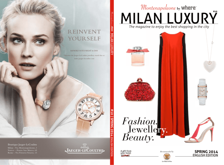 Montenapoleone by RENDEZ-VOUS NIGHT & DAY Discover the Jaeger-LeCoultre jewellery watch line at milan LU URY #10 The magazine to enjoy the best shopping in the city milan LUXURY REINVENT YOURSELF Montenapoleone by ladies.jaeger-lecoultre.com Milan - Via Montenapoleone, 1 Venice - Piazza San Marco, 65 Rome - Via Vittor io Veneto, 13 #10 | SPRING 2014 English Edition Boutique Jaeger-LeCoultre Fashion. Jewellery. Beauty. A gift from your hotel 10 euro Recommended by C lefs d’Or C lef s d’Or Clefs d’Or “Le Chiavi d’Oro” SPRING 2014 English Edition Introduction by Umayya Theba Stylish and full of surprises... Welcome to Milano! Fashion capital and host city for Expo 2015 when hoardes of international visitors will descend on this compact, concrete runway to discover that there's so much more to stylish Milan than most travel guides suggest. Whether you're here on business or pleasure, our handbag-sized luxury shopping guide will be your travel companion, making sure that your trip transcends expectations and that you leave with some purchased evidence to prove that you really did experience the essence of this shopper's paradise, design hub and cultural feast - all rolled into one! In view of “iSaloni” in April, read on to find out more about the design stores and boutiques in Milan, must-see venues during the Design Week and how to have fun sightseeing on wheels! We reveal the most potent and pampering beauty products to help ADV VACHERON you look your radiant best as you gear up for Spring, and tell you exactly which fine leather items will make top quality additions to your wardrobe. While you're here, consider blending in with the meticulously dressed Milanesi. Simply check out our recommended head-to-toe ensembles of designer apparel, footwear and accessories to suit an evening at the opera or terrace-top outing. IN THIS ISSUE | CONTRIBUTORS UMAYYA THEBA ALISA AUNS ELENA BINDA STEFANIA VIDA BIO: South African by birth but BIO: A fashion journalist, BIO: Elena is an Italian BIO: A Milanese journalist Italian in heart and spirit, Umayya blogger (blog.smartmilan.it) and journalist who came to Milan as a with a passion for her job, for is a journalist and blogger who a consultant for Latitude45.it, student – planning to stay for only years Stefania has covered the gave up a corporate job to expe- Alisa introduces us to an exclusive a short time, life intervened and latest fashion and style trends in rience Italy - not just as a tourist, shopping experience in Milan she has lived here for many years, the city. After contributing to a but like a local. She documents by offering us a slew of insider first as a student, then as a career number of high-end publications her travels and pours her passion secrets and new trends but also girl and now also as a married in the sector, she now works as for Italian fashion and Milanese useful information to navigate the woman. Though seeing Milan as a the Lifestyle and Fashion Editor of lifestyle into her blog, U in Milan, countless opportunities offered multi-faceted city she still retains Where Milan. while contributing to the Where by the city. the eye of a tourist experiencing it Milan magazine and The Luxury for the first time. Shopping Guide. SPRING_1 Contents News The best of Discovering Milan Italian High Fashion Top Brands Jewels and Watches Top Brands Italian Design Top Brands Tips Montenapoleone Card, shopping without stopping Authentic experiences in the Quadrilatero Tasting experience Getting around Milan Insider’s View DESIGN | Creativity reigns supreme by Stefania Vida BEAUTY | Beauty & the City by Stefania Vida LEATHER | The new skin I live in! by Alisa Auns Focus on MANZONI 24 | Manzoni 24, Made-in-Italy stylish fur 4 Shop in Style SPRING 6 The best Spring shopping DAY-TIME 14 Diarise a day-time date APERITIVO 18 The Aperitivo collection EVENING 22 Evening starlet, shine! Highlights 26 Jaeger-LeCoultre Manzoni 24 29 Damiani Rocca 1794 58 Giòsa Milano 64 Miki House Pisa Orologeria – Rolex Boutique Pisa Orologeria and Patek Philippe Boutique Around Milan 36 Outlets and factory stores 40 The Guide Via Montenapoleone & Around the corner boutiques directory Check the logos on the following pages Montenapoleone by #10 #10 | SPRING 2014 ENGLISH EDITION The magazine to enjoy the best shopping in the city Fashion. Jewellery. Beauty. A gift from your hotel 10 euro Recommended by C lefs d ’Or C lefs d’Or SPRING 2014 ENGLISH EDITION Clefs d’Or “Le Chiavi d’Oro” 2_MONTENAPOLEONE 44 46 48 50 50 51 51 52 52 53 53 62 milan LU URY The magazine to enjoy the best shopping in the city #10 SPRING 2014 English Edition THE WHERE PROJECT IS ENDORSED BY MONTENAPOLEONE BY WHERE MILAN LUXURY http://montenapoleone.wheremilan.com published by: Where Italia srl Via Ezio Biondi, 1 - 20154 Milano. T: 02 349951 - Fax 02 33107015 [email protected] www.wheremilan.com publisher and editor-in-chief Andrea Jarach ([email protected]) RECOMMENDED BY C lefs d’Or C lef s d’Or Clefs d’Or “Le Chiavi d’Oro” editorial (PROEDI COMUNICAZIONE srl) MANAGING DIRECTOR proedi comunicazione Daniele Misrachi REPORTERS Alisa Auns, Elena Binda, Umayya Theba EDITORial coordination Alessandra Finzi DESIGNER Elisabetta Giudici CONTRIBUTORS & consultants Carey Bernitz, Adriano Caramenti (photographer), Floriana di Maio, Joy Lacanlale, Fabio Lancini, Stefania Vida, Tips Images (Iconography) WEB EDITOR Anna Aiello Although the publisher has made every effort to include copyright credits, in the event of there being any errors, oversights or omissions, we would like to apologize to the copyright holders in question whose names will be published in the next issue. MARKETING & ADVERTISING Isa Faleschini, Marta Mailhac, Rachele Renna 55 ADMINISTRATION Katia Greto PRODUCTION & CIRCULATION, SALES SUPPORT COORDINATOR Paola Grilli Your Premier Refund+ Вы Премьер Воз 退税 Возврат нало га 退税 退税 Your Premier Refund+ Возвра
