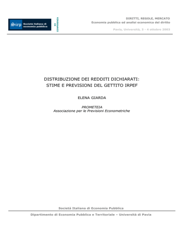 XV CONFERENZA DIRITTI, REGOLE, MERCATO Economia pubblica ed analisi economica del diritto Pavia, Università, 3 - 4 ottobre 2003 DISTRIBUZIONE DEI REDDITI DICHIARATI: STIME E PREVISIONI DEL GETTITO IRPEF ELENA GIARDA PROMETEIA Associazione per le Previsioni Econometriche Società Italiana di Economia Pubblica Dipartimento di Economia Pubblica e Territoriale – Università di Pavia DIRITTI, REGOLE, MERCATO Economia pubblica ed analisi economica del diritto XV Conferenza SIEP - Pavia, Università, 3 - 4 ottobre 2003 pubblicazione internet realizzata con contributo della società italiana di economia pubblica dipartimento di economia pubblica e territoriale – università di Pavia Distribuzione dei redditi dichiarati: stime e previsioni del gettito Irpef Elena Giarda 1 Versione provvisoria: settembre 2003 Abstract Lo scopo del lavoro è quello di stimare il gettito Irpef, utilizzando una funzione continua di distribuzione del reddito basata sui redditi dichiarati dai contribuenti. Il passaggio al continuo è necessario per trasformare le classi di reddito dei dati pubblicati dal Ministero dell’Economia in classi corrispondenti agli scaglioni Irpef, per effettuare stime del reddito per scaglioni ed ottenere il gettito d’imposta di un anno base (il 1995) ed infine per fare previsioni del gettito futuro in presenza di variazioni della base imponibile e di modifiche della legislazione tributaria. I redditi dichiarati sono stati suddivisi in tre categorie di percettori (lavoratori dipendenti, pensionati ed altri) ed interpolati con la funzione di probabilità di Dagum, una funzione non lineare in cui ognuno dei quattro parametri ha un’interpretazione economica. La funzione interpolante mostra un buon adattamento ai dati osservati. Ottenuto il reddito complessivo per scaglione sulla base della distribuzione stimata, vengono applicate le aliquote Irpef di competenza di ciascun anno per ottenere il gettito per scaglioni (e complessivo) dell’Irpef lorda. Il passaggio successivo consiste nella stima del costo fiscale delle detrazioni, utilizzando una procedura che consente di estrapolarne il valore almeno fino al 2002, tenendo conto dei mutamenti della legislazione occorsi nel periodo. L’Irpef netta così ottenuta può anch’essa essere proiettata ipotizzando l’invarianza della distribuzione e tenendo conto delle variazioni della base imponibile media e della legislazione tributaria. I risultati delle stime del gettito lordo e netto per l’anno base sono in linea con i dati delle dichiarazioni dei redditi; le proiezioni dell’Irpef netta sugli anni successivi, confrontabili solo con i dati di contabilità nazionale, sono in linea con il tasso di crescita di questi ultimi. 1 PROMETEIA, Via Marconi 43, 40122 Bologna. E-mail: [email protected]. Le appendici A, B e C, cui faccio riferimento nel testo, sono disponibili su richiesta. Ringrazio il Prof. Camilo Dagum per gli utili suggerimenti e per aver fornito il programma di stima EPID. Introduzione In tempi recenti, in relazione ad importanti cambiamenti nella legislazione tributaria, si sono sviluppate numerose analisi sulla misurazione degli effetti che tali interventi hanno avuto sul livello del gettito aggregato e per classi di reddito, con lo scopo di misurare i mutamenti nella distribuzione del reddito dopo le imposte. Di particolare rilievo sono gli effetti delle modifiche dell’imposta personale sui redditi a cui questo lavoro è principalmente diretto. Gli studi nei quali vengono valutati gli effetti dei mutamenti dei parametri strutturali dell’Irpef (aliquote, scaglioni, detrazioni ecc.) si basano per la maggior parte su modelli di microsimulazione che utilizzano per l’Italia i dati dell’indagine campionaria della Banca d’Italia. Come è noto, questi dati contengono informazioni sul reddito individuale al netto delle imposte: per effettuare stime degli effetti delle variazioni dei parametri tributari è quindi necessario ricostruire i corrispondenti redditi lordi. Tale ricostruzione richiede di fare ipotesi esplicite sul grado di evasione fiscale per i singoli individui. In un recente lavoro di Gastaldi e Liberati (2000), l’analisi degli effetti delle variazioni della normativa tributaria in materia di Irpef nel periodo dal 1978 al 1998 è stata effettuata mantenendo la struttura della distribuzione dei redditi del 1995 e correggendo per l’inflazione i parametri strutturali del sistema tributario (scaglioni, detrazioni d’imposta, detrazioni per lavoro dipendente, detrazioni per lavoro autonomo, oneri deducibili e detraibili e altri parametri) in tutti gli anni su cui è stato effettuato il confronto. Il presente lavoro segue una strada alternativa, già utilizzata in un precedente studio (Rimini, 1991), che si caratterizza per l’utilizzo dei dati ricavati dalle dichiarazioni dei redditi; tali dati sono disponibili, diversamente da quelli di Banca d’Italia, solo in forma aggregata per classi di reddito. Per il loro utilizzo si richiede dunque una metodologia che differisce in modo sostanziale dalla microsimulazione e che passa attraverso la stima di una funzione teorica e continua di distribuzione del reddito. La stima di questa funzione permette di calcolare il reddito complessivo incluso in classi di reddito definite da limiti diversi da quelli che caratterizzano i dati forniti dal Ministero dell’Economia. Per i nostri scopi è particolarmente importante il reddito incluso in classi corrispondenti agli scaglioni Irpef. Ciò consente, nell’ipotesi di invarianza della distribuzione di frequenze, di calcolare il reddito anche per gli scaglioni definiti dalla legislazione vigente negli anni successivi all’anno utilizzato per le stime. Questo approccio si rende necessario quando si voglia avere un modello di stima dell’Irpef dettagliato che possa essere inserito anche in un modello macroeconomico generale dell’economia. Un altro dei temi che ha dato luogo a grandi discussioni in ambito di analisi di dis