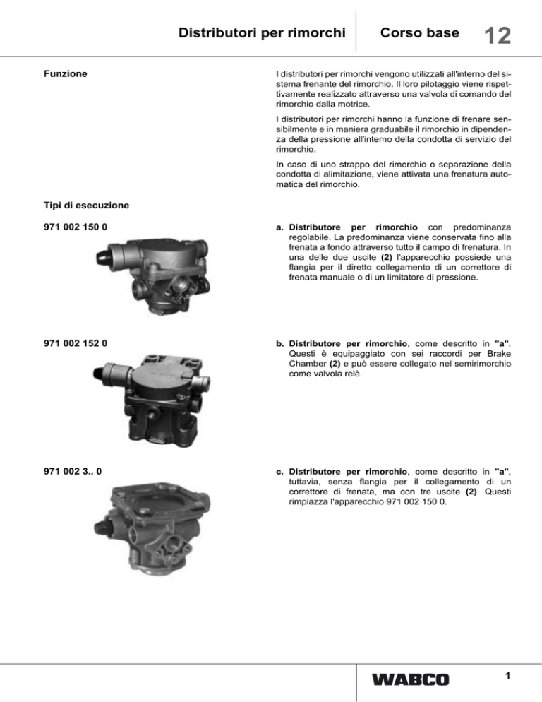 Distributori per rimorchi Funzione Corso base 12 I distributori per rimorchi vengono utilizzati all'interno del sistema frenante del rimorchio. Il loro pilotaggio viene rispettivamente realizzato attraverso una valvola di comando del rimorchio dalla motrice. I distributori per rimorchi hanno la funzione di frenare sensibilmente e in maniera graduabile il rimorchio in dipendenza della pressione all'interno della condotta di servizio del rimorchio. In caso di uno strappo del rimorchio o separazione della condotta di alimitazione, viene attivata una frenatura automatica del rimorchio. Tipi di esecuzione 971 002 150 0 a. Distributore per rimorchio con predominanza regolabile. La predominanza viene conservata fino alla frenata a fondo attraverso tutto il campo di frenatura. In una delle due uscite (2) l'apparecchio possiede una flangia per il diretto collegamento di un correttore di frenata manuale o di un limitatore di pressione. 971 002 152 0 b. Distributore per rimorchio, come descritto in "a". Questi è equipaggiato con sei raccordi per Brake Chamber (2) e può essere collegato nel semirimorchio come valvola relè. 971 002 3.. 0 c. Distributore per rimorchio, come descritto in "a", tuttavia, senza flangia per il collegamento di un correttore di frenata, ma con tre uscite (2). Questi rimpiazza l'apparecchio 971 002 150 0. 2 1 12 Corso base Distributori per rimorchi Principio di funzionamento del distributore per rimorchi 971 002 150 0 (con predominanza regolabile) a. Posizione di rifornimento (fino a 2,8 bar) Nella premessa che il raccordo (1 – 2) sia depressurizzato, la forza della molla (9) mantiene il pistone (8) nella posizione superiore. La pressione alimentata nel raccordo (1) dalla condotta d'alimentazione del rimorchio fluisce attraverso l'anello scanalato (11) in fase d'apertura nella camera (e). In tal modo l'aria compressa fluisce nel raccordo (1 – 2) e successivamente verso il serbatoio d'aria del rimorchio. La stessa pressione fluisce anche attraverso la valvola d'ingresso (6) aperta nella camera (c). Le Brake Chamber collegati al raccordo (2) vengono in tal modo immediatamente alimentati con aria. Il rimorchio viene frenato automaticamente. b. Posizione di marcia Questo ciclo di ferratura viene interrotto non appena all'interno della camera (d) si è creata una pressione di max. 2,8 bar. In quanto il pistone (8) supera la controforza della molla (9), viene premuto verso il basso. Successivamente il pistone (8) chiude la valvola di ingresso (6) in seguito al trascinamento del corpo della valvola (10). Allo stesso tempo la sede della valvola (13) si solleva dalla valvola di scarico (12) e apre in tal modo lo scarico (3). In seguito a ciò, le Brake Chamber collegate vengono nuovamente scaricate. 2 Distributori per rimorchi Corso base 12 c. Posizione di frenata parziale In seguito all'alimentazione del raccordo (4) viene generata pressione all'interno della camera (a). In tal modo il pistone di comando (5) viene premuto verso il basso e chiude di conseguenza la valvola di scarico (12) con la sua sede della valvola (13). Successivamente si apre la valvola d'ingresso (6). Dalla camera (e) a questo punto fluisce aria d'alimentazione nella camera (c) e attraverso i raccordi (2) verso i Brake Chamber. A causa della differenza superficiale del pistone (5) tra le camere (a) e (c), la pressione erogata dal raccordo (2) è più alta rispetto alla pressione alimentata nel raccordo (4). La predominanza Qui la differenza di pressione dipende sostanzialmente dalla predominanza regolata nella vite (14). Questa differenza si verifica in quanto la pressione all'interno della camera (c) perviene anche subito nella camera (g). La valvola (17) si apre quando viene superata la forza della molla (16). La pressione a questo punto alimentata nella camera (h) perviene allo stesso tempo attraverso il canale (f) nella camera anulare (b). La valvola (17) viene nuovamente chiusa quando all'interno della camera (c) è stata raggiunta predominanza di pressione regolata. Allo stesso tempo il pistone di comando (5) viene nuovamente sollevato fino alla chiusura della valvola d'ingresso (6). A questo punto è stata raggiunta la posizione finale di frenatura. 3 12 Corso base Distributori per rimorchi d. Frenatura a fondo In un ulteriore incremento di pressione nel raccordo (4) il distributore del rimorchio si commuta, come descritto in "c", e aumenta sensibilmente e in maniera graduabile la pressione nei raccordi (2), fino alla frenatura a fondo . A tal fine la valvola d'ingresso (6) rimane completamente aperta. La predominanza rispettivamente regolata rimane conservata su tutto il campo di frenatura. e. Posizione di rilascio In seguito allo scarico del raccordo (4) viene scaricata pressione dalla camera (a). L'aria compressa alimentata rispettivamente nelle camere (b) e (c) in tal modo è in grado di sollevare il pistone di comando (5). In quanto il corpo della valvola (10) segue il movimento ascendente a causa della forza della molla (7) e della pressione all'interno della camera (c), si chiude la valvola d'ingresso (6). Il pistone di comando (5) che si porta ulteriormente verso l'alto solleva successivamente la valvola di scarico (12) con la sua sede della valvola (13) e la apre. La pressione dominante nella camera (h) viene scaricata attraverso la valvola di ritenuta (18) in fase d'apertura all'interno della camera (c). I Brake Chamber collegati al raccordo (2) vengono in tal modo scaricati attraverso lo scarico (3). 4 Distributori per rimorchi f. Posizione di frenatura automatica Corso base 12 In uno strappo del rimorchio o scarico della pressione dal raccordo (1), la pressione si scarica nella camera (d). Poiché la pressione d'alimentazione dominante nella camera (e) non può rifluire attraverso l'anello scanalato (11), il pistone (8) viene spinto verso l'alto con l'ausilio della forza della molla (9). In tal modo il corpo della valvola (10) si appoggia sulla sede della valvola (13) del pistone (5) e c