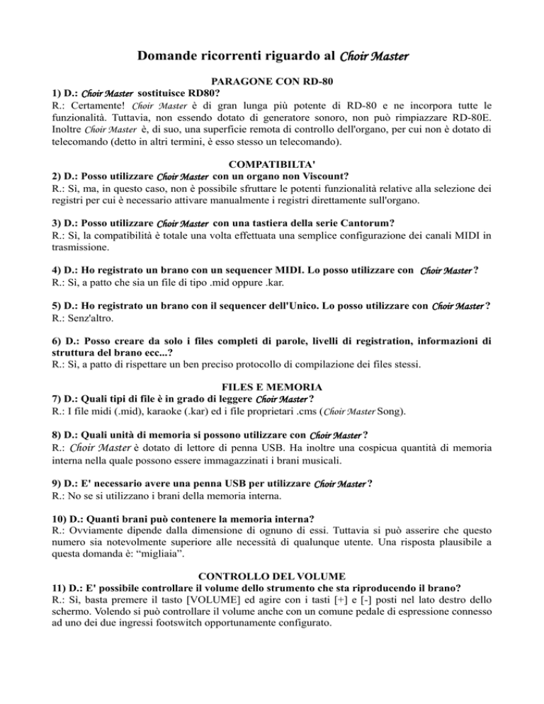 Domande ricorrenti riguardo al Choir Master PARAGONE CON RD-80 1) D.: Choir Master sostituisce RD80? R.: Certamente! Choir Master è di gran lunga più potente di RD-80 e ne incorpora tutte le funzionalità. Tuttavia, non essendo dotato di generatore sonoro, non può rimpiazzare RD-80E. Inoltre Choir Master è, di suo, una superficie remota di controllo dell'organo, per cui non è dotato di telecomando (detto in altri termini, è esso stesso un telecomando). COMPATIBILTA' 2) D.: Posso utilizzare Choir Master con un organo non Viscount? R.: Sì, ma, in questo caso, non è possibile sfruttare le potenti funzionalità relative alla selezione dei registri per cui è necessario attivare manualmente i registri direttamente sull'organo. 3) D.: Posso utilizzare Choir Master con una tastiera della serie Cantorum? R.: Sì, la compatibilità è totale una volta effettuata una semplice configurazione dei canali MIDI in trasmissione. 4) D.: Ho registrato un brano con un sequencer MIDI. Lo posso utilizzare con Choir Master ? R.: Sì, a patto che sia un file di tipo .mid oppure .kar. 5) D.: Ho registrato un brano con il sequencer dell'Unico. Lo posso utilizzare con Choir Master ? R.: Senz'altro. 6) D.: Posso creare da solo i files completi di parole, livelli di registration, informazioni di struttura del brano ecc...? R.: Sì, a patto di rispettare un ben preciso protocollo di compilazione dei files stessi. FILES E MEMORIA 7) D.: Quali tipi di file è in grado di leggere Choir Master ? R.: I file midi (.mid), karaoke (.kar) ed i file proprietari .cms (Choir Master Song). 8) D.: Quali unità di memoria si possono utilizzare con Choir Master ? R.: Choir Master è dotato di lettore di penna USB. Ha inoltre una cospicua quantità di memoria interna nella quale possono essere immagazzinati i brani musicali. 9) D.: E' necessario avere una penna USB per utilizzare Choir Master ? R.: No se si utilizzano i brani della memoria interna. 10) D.: Quanti brani può contenere la memoria interna? R.: Ovviamente dipende dalla dimensione di ognuno di essi. Tuttavia si può asserire che questo numero sia notevolmente superiore alle necessità di qualunque utente. Una risposta plausibile a questa domanda è: “migliaia”. CONTROLLO DEL VOLUME 11) D.: E' possibile controllare il volume dello strumento che sta riproducendo il brano? R.: Sì, basta premere il tasto [VOLUME] ed agire con i tasti [+] e [-] posti nel lato destro dello schermo. Volendo si può controllare il volume anche con un comune pedale di espressione connesso ad uno dei due ingressi footswitch opportunamente configurato. TRASPOSITORE DI TONALITÀ 12) D.: E' possibile cambiare la tonalità del brano in esecuzione? R.: Sì, basta premere il tasto [TRANSP.] ed agire con i tasti [+] e [-] posti nel lato destro dello schermo. Se il valore è diverso da 0, il tasto [TRANSP.] diviene rosso. ANNUNCIATOR PANEL 13) D.: Come si visualizza il numero del brano nel pannello? R.: Premendo il tasto [A.PANEL], sempreché il nome del brano in uso sia preceduto da un codice numerico a tre cifre più il carattere underscore (“_”). Se non è così non viene visualizzato alcun numero ed il tasto [A.PANEL] diviene giallo in attesa di avere un numero utile da visualizzare sul pannello esterno. 14) D.: Come può essere collegato il pannello numerico a Choir Master ? R.: In tre diversi, ed alternativi tra loro, modi: via cavo mediante connettore seriale RS-485 oppure Midi; via radio (dunque senza filo) tramite il trasmettitore interno. Per usufruire di questa feature bisogna montare l'antenna sul retro di Choir Master. 15) D.: Posso visualizzare un numero diverso da quello presente nel nome del brano (ad esempio il numero della pagina alla quale si trova nel libro dei cantori)? R.: Sì, è sufficiente premere per qualche istante il tasto [A.PANEL] e comporre il numero voluto sui tastini della zona Song Structure. Al rilascio questo numero sarà visibile nel pannello; il colore di [A.PANEL] è rosso ad indicare lo stato di “forzatura” del numero. Questo rimane visualizzato fino alla prossima pressione del tasto [A.PANEL]. 16) D.: Posso visualizzare un numero anche se il nome del brano non lo contiene? R.: Sì, con la stessa procedura descritta al punto precedente. LYRICS 17) D.: Come si visualizzano le parole del brano sullo schermo interno? R.: Premendo il tasto [LYRICS]. Se non sono disponibili questo diviene giallo fino a che non si carica un brano che le contenga. In questo caso diventerà verde. 18) D.: Le parole del brano possono essere visualizzate solo sul display interno? R.: No; basta connettere un televisore o un videoproiettore a Choir Master e selezionare correttamente l'ingresso del segnale video. 19) D.: Posso ingrandire la dimensione delle parole? R.: No ma posso fare in modo che tutte le lettere siano maiuscole migliorando così la visibilità delle stesse. E' importante dunque scegliere un televisore di dimensioni adeguate a quelle dell'ambiente nel quale verrà collocato. VELOCITA' DI ESECUZIONE 20) D.: Posso cambiare la velocità di esecuzione del brano? R.: Sì, premendo i tasti [SLOW] (rallenta) e [FAST] (accelera); sulla Main Page si può vedere il livello percentuale di variazione del tempo. 21) D.: Perché il tasto [SLOW] è diventato verde? R.: Perché il valore di tempo percentuale è inferiore a 100%; se invece è superiore si illumina di verde il tasto [FAST]. Con entrambi i tasti spenti il valore di tempo percentuale è 100%. 22) D.: Posso fare in modo che il brano non cambi mai velocità a meno che non lo voglia io? R.: Sì, premendo contemporaneamente [SLOW] e [FAST] diventano rossi ed il tempo viene bloccato a quello attuale. Questo stato è chiamato “Tempo lock”; sulla schermata principale compare un lucchetto vicino al valore di tempo. Per tornare alla modalità normale ripremere contemporaneamente [SLOW] e [FAST]. 23) D.: Posso ripristinare con immediatezza la velocità originale? R.: Sì, basta premere contemporaneamente e per qualc