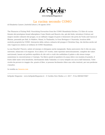 www.beSpokeMagazine.it La cucina secondo COMO di Elisabetta Canoro | beArt&Culture | 30 agosto 2016 The Pleasures of Eating Well: Nourishing Favourites from the COMO Shambhala Kitchen. È il libro di cucina firmato dal prestigioso brand alberghiero Como Hotels and Resorts che, già dal titolo, introduce il lettore nel magico mondo culinario del gruppo, in un raffinato viaggio di gusto e benessere che porta da Turks and Caicos al Bhutan, passando per Bali, le Maldive, Miami, la Thailandia, la Gran Bretagna e l’Australia, location delle esotiche proprietà by COMO. Interprete della cultura culinaria del gruppo è Christina Ong, che declina anche nel cibo l’approccio olistico al wellness di COMO Shambhala. La sua filosofia? Piacere, salute ed energia si ottengono anche mangiando. Basta assicurarsi che il cibo sia sano, nutriente, bilanciato e di stagione. Ecco allora 147 ricette, tutte riportate meticolosamente, complete dei valori nutrizionali, basate sul perfetto equilibrio di cibi cotti e crudi che soddisfano il palato e allo stesso tempo aumentano la concentrazione e l’energia. Via libera quindi al gambero di acqua dolce con insalata di pomelo, il frutto dalle tante virtù benefiche, direttamente dalla Tailandia o il curry tempeh con zucca dall’Indonesia. Tutte ricette da provare in viaggio che, grazie al libro, si possono facilmente rifare una volta rientrati, per non perderne i benefici. In vendita su Amazon.com beSpoke Magazine - www.beSpokeMagazine.it - © Gurkha New Media s.r.l. 2017 - P.Iva 08058470967
