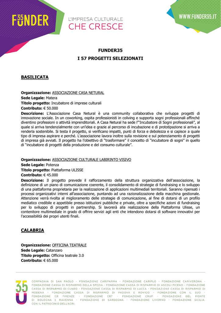 FUNDER35 I 57 PROGETTI SELEZIONATI BASILICATA Organizzazione: ASSOCIAZIONE CASA NETURAL Sede Legale: Matera Titolo progetto: Incubatore di imprese culturali Contributo: € 50.000 Descrizione: L'Associazione Casa Netural è una community collaborativa che sviluppa progetti di innovazione sociale. In un coworking, ospita professionisti in coliving e supporta sogni professionali affinché diventino professioni o attività imprenditoriali. A Casa Netural ha sede l'“Incubatore di Sogni professionali”, al quale si arriva tendenzialmente con un'idea e grazie al percorso di incubazione e di prototipazione si arriva a renderla sostenibile. Si testa il progetto, si verificano impatti, punti di forza e debolezza e si capisce a quale tipo di impresa aspirare e perché. L’associazione lavora inoltre sulla revisione e sul potenziamento di progetti di impresa già avviati. Il progetto ha l’obiettivo di “trasformare” il concetto di “incubatore di sogni” in quello di “incubatore di progetti della produzione e del consumo culturale”. Organizzazione: ASSOCIAZIONE CULTURALE LABIRINTO VISIVO Sede Legale: Potenza Titolo progetto: Piattaforma ULISSE Contributo: € 45.000 Descrizione: Il progetto prevede il rafforzamento della struttura organizzativa dell'associazione, la definizione di un piano di comunicazione coerente, il consolidamento di strategie di fundraising e lo sviluppo di una piattaforma proprietaria per la realizzazione di applicazioni multimediali territoriali. Saranno ripensati i processi organizzativi interni all'associazione, puntando ad una razionalizzazione della macchina gestionale. Attenzione verrà rivolta al miglioramento delle strategie di comunicazione, al fine di dotarsi di un profilo mediatico credibile e appetibile presso istituzioni pubbliche e private, oltre a specifiche azioni di fundraising per lo sviluppo di progetti in partnership. Si lavorerà alla realizzazione della Piattaforma Ulisse, un contenitore multimediale in grado di offrire servizi agli enti che intendono dotarsi di software innovativi per l'accessibilità dei propri utenti finali. CALABRIA Organizzazione: OFFICINA TEATRALE Sede Legale: Catanzaro Titolo progetto: Officina teatrale 3.0 Contributo: € 65.000 Descrizione: Il progetto ha l’obiettivo di favorire il rafforzamento e la sostenibilità delle attività dell’organizzazione. L'attuale fragilità operativa dell'impresa è legata ai finanziamenti occasionali della Regione Calabria, che non riescono a innescare processi in grado di garantire un'attività più costante. Sono previste nuove strategie per migliorare le capacità di affrontare il mercato nazionale, per la qualificazione delle componenti organizzativo-gestionali e tecniche che, tramite una corretta interazione con quelle artistiche, permettano all’organizzazione di operare per il rafforzamento e la diversificazione dell'offerta in senso innovativo. CAMPANIA Organizzazione: Associazione ARTE°GRADO Sede Legale: Napoli Titolo progetto: Altofest - Contemporary Live Arts Festival Contributo: € 40.000 Descrizione: Un progetto culturale internazionale, orizzontale e generativo, che si innesta nel tessuto sociourbano che lo ospita. Il Festival è costruito insieme ai cittadini di Napoli, che nelle loro case e/o spazi privati di altra natura (appartamenti, terrazzi, sotterranei, cortili, interi condomini, laboratori artigianali...) ospitano opere di artisti internazionali. In questo modo, stringono una relazione esclusiva con l'artista e un legame indissolubile con l'opera d'arte. EMILIA ROMAGNA Organizzazione: Amigdala Sede Legale: Modena Titolo progetto: Ovestlab - un community hub per la rigenerazione del Villaggio Artigiano di Modena Ovest Contributo: € 65.000 Descrizione: Il progetto intende trasformare OvestLab, una delle officine in disuso nel Villaggio Artigiano di Modena Ovest, in un Community Hub, ovvero un presidio locale partecipato dei processi di rigenerazione del territorio, promuovendo il dialogo tra campi disciplinari differenti: arte, impresa, urbanistica. Il progetto vede l'associazione Amigdala, attiva nell'ambito delle arti performative, in collaborazione con Associazione Archivio Cesare Leonardi (AACL) che opera negli ambiti dell'architettura e rigenerazione urbana, impegnata nella creazione di una possibile economia di scala che nasce dalle sinergie tra arte, impresa, urbanistica, partecipazione. In prospettiva, questa sperimentazione potrebbe garantire la sostenibilità dell'associazione e promuovere un processo di rigenerazione del quartiere. Organizzazione: BAM! Strategie Culturali Società Cooperativa Sede Legale: Bologna Titolo progetto: QUINTO BAM! - Il grado della conoscenza Contributo: € 50.000 Descrizione: Dal 2012 il contesto in cui opera BAM! è cambiato: temi come l'imprenditoria, l'innovazione culturale e l'audience development si sono spostati verso il mainstream culturale italiano e il mercato ha assistito contemporaneamente all'ingresso di nuovi player e al consolidamento di alcune posizioni dominanti. Al giro di boa del suo quinto anno, quindi, BAM! deve affrontare contemporaneamente crescita e cambiamento se vuole affermarsi definitivamente come una realtà centrale del panorama italiano: consolidare la propria struttura, stabilizzare e direzionare la propria crescita. Per fare questo, BAM! si propone di attraversare un processo di sostanziale rifondazione, a partire da competenze, organizzazione interna, strumenti di lavoro: l'obiettivo principale è rilanciare le attività della società attraverso una radicale innovazione della propria offerta, sostenuta da una nuova e più efficiente gestione della relazione col mercato. Organizzazione: Associazione QB Quanto Basta Sede Legale: Bologna Titolo progetto: Play/Listen: idee per mettere in gioco l'ascolto Contributo: € 45.000 Descrizione: Il progetto intende mettere a frutto l'esperienza pluriennale (dal 2009) dei laboratori educativi per bambini, ideati e condotti a Bologna dall’as