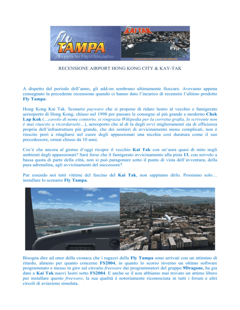 RECENSIONE AIRPORT HONG KONG CITY & KAY-TAK A dispetto del periodo dell’anno, gli add-on sembrano ultimamente fioccare. Avevamo appena consegnato la precedente recensione quando ci hanno dato l’incarico di recensire l’ultimo prodotto Fly Tampa. Hong Kong Kai Tak. Scenario payware che si propone di ridare lustro al vecchio e famigerato aereoporto di Hong Kong, chiuso nel 1998 per passare le consegne al più grande e moderno Chek Lap Kok (…cavolo di nome contorto, si ringrazia Wikipedia per la corretta grafia, lo scrivente non è mai riuscito a ricordarselo…), aereoporto che al di la degli ovvi miglioramenti sia di efficienza propria dell’infrastruttura più grande, che dei sentieri di avvicinamento meno complicati, non è riuscito però a ritagliarsi nel cuore degli appassionati una nicchia così duratura come il suo precedessore, ormai chiuso da 10 anni. Cos’è che ancora al giorno d’oggi ricopre il vecchio Kai Tak con un’aura quasi di mito negli ambienti degli appassionati? Sarà forse che il famigerato avvicinamento alla pista 13, con sorvolo a bassa quota di parte della città, non si può paragonare sotto il punto di vista dell’avventura, della pura adrenalina, agli avvicinamenti del successore? Pur essendo noi tutti vittime del fascino del Kai Tak, non sappiamo dirlo. Possiamo solo… installare lo scenario Fly Tampa. Bisogna dire ad onor della cronaca che i ragazzi della Fly Tampa sono arrivati con un attimino di ritardo, almeno per quanto concerne FS2004, in quanto lo scorso inverno un ottimo software programmato e messo in giro sul circuito freeware dai programmatori del gruppo 9Dragons, ha gia dato a Kai Tak nuovi lustri sotto FS2004. E anche se il non abbiamo mai trovato un attimo libero per installare questo freeware, la sua qualità è notoriamente riconosciuta in tutti i forum e altri circoli di aviazione simulata. Gia, a dispetto del fatto che Kai Tak è uno degli aereoporti che anche noi pensiamo pieni di fascino, per un motivo o per un altro non abbiamo mai trovato il tempo di installare lo scenario 9Dragons (quindi non aspettatevi paragoni tra i due scenari in questa sede), ma questo può essere incolpato al fatto che l’ultima volta che abbiamo simulvolato da quelle parti è stato più di un anno fa (occasione nella programmammo un robusto traffico AI custom, solo per FS2004, per VHHX visibile in alcune immagini qui esposte) per un motivo o per un altro, e davvero, se non si intende volare verso o da un dato aereoporto, perché mai installarvi uno scenario, per quanto ben fatto? Ovviamente il dovere alle volte fa andare dove per piacere non si intendeva passare per divertirsi, non che la cosa ovviamente spiaccia, e così procediamo a trovare un posticino al Kai Tak Fly Tampa sia sotto FS2004 che FSX, per paragonarne sia il look che il funzionamento. L’installazione per FS2004 parte e trova però subito un intoppo. Sul computer di prova sono installati entrambi FS2004 e FSX, ma sotto un percorso arbitrario non default. Entrambi I simulatori sono infatti installati su un molto più capienti Hard Disk differenti dal C, e l’installer del Kai tak per FS2004 fa subito notare che non è in grado di trovare il simulatore, quindi si dovranno installare le cartelle a mano dopo che l’installer le avrà estratte in una cartella provvisoria. Per noi questo non è un problema, ma ovviamente qualcun altro con meno esperienza potrebbe avere problemi eccome. Sicuramente uno strano problema, anche perché, inspiegabilmente, installando lo scenario per FSX, l’installer trova il simulatore senza problemi, a dispetto del fatto che FSX è stato anch’esso installato su altro Hard Disk (per di più USB2 esterno), e non sotto il percorso standard. Unica altra differenza tra i due installer è una maggior quantità di opzioni per quanto riguarda lo scenario per FSX, tra cui la possibilità di scegliere se il tipo delle texture per la pavimentazione dell’aereoporto debbano o meno seguire lo standard dettato dal SDK della Microsoft, o debbano essere invece texture custom programmate dalla Fly Tampa. Differenza tra queste due texture è che quelle personalizzate sono più realistiche, ma, per ammissione della stessa Fly Tampa, possono incidere parecchio sul FPS finale. Decidiamo per un’installazione standard per entrambi i simulatori, ma per FSX, vista la limitata potenza del sistema di prova, decidiamo di usare le texture che seguono lo standard del SDK di Microsoft. Una volta installati entrambi gli scenari si passa alla loro attivazione nella Libreria Scenari (da fare a mano per entrambe le versioni) e poi alla prova su strada. Gli scenari sono fondamentalmente uguali, lo stesso scenario sotto diverso sistema, e se delle differenze ci sono, non sono normalmente apprezzabili. La qualità dello scenario è la stessa sotto entrambi i simulatori. In entrambi I casi molto alta. Durante l’installazione è possibile scegliere, sia sotto FSX che FS2004, se visualizzare o meno il traffico automobilistico e navale attorno all’aeroporto, traffico che è fondamentalmente lo stesso in entrambi i simulatori. L’aeroporto è praticamente lo stesso in entrambi i simulatori. Le case, i palazzi e i grattacieli sono gli stessi, e perfino le zone boscose attorno sono le stesse in entrambi i simulatori. Infatti, l’unico modo per distinguerne le versioni negli screenshots qui pubblicati è guardare l’acqua del mare, gli aerei usati e la presenza di aerei AI sui piazzali. Tutto cio non toglie che lo scenario sia top class e eccezionalmente leggero. Sia sotto FS2004 (che sul sistema di prova ha il vantaggio/svantaggio di avere traffico AI, quindi è più pesante solo per via delle grandi quantità di aerei normalmente parcheggiati), sia sotto FSX (che essendo praticamente vuoto, siccome i TTools non sono mai stati aggiornati per codificare traffico AI per FSX, ha un certo vantaggio sulla versione per FSX) lo scenario è eccezionalmente leggero ed eccezionalmente ben fatto. An
