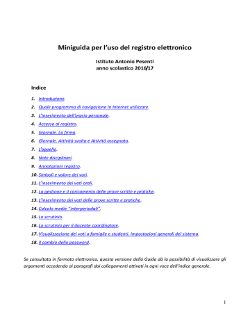 Miniguida per l’uso del registro elettronico Istituto Antonio Pesenti anno scolastico 2016/17 Indice 1. Introduzione. 2. Quale programma di navigazione in Internet utilizzare. 3. L’inserimento dell’orario personale. 4. Accesso al registro. 5. Giornale. La firma. 6. Giornale. Attività svolta e Attività assegnata. 7. L’appello. 8. Note disciplinari. 9. Annotazioni registro. 10. Simboli e valore dei voti. 11. L’inserimento dei voti orali. 12. La gestione e il caricamento delle prove scritte e pratiche. 13. L’inserimento dei voti delle prove scritte e pratiche. 14. Calcolo medie “interperiodali”. 15. Lo scrutinio. 16. Lo scrutinio per il docente coordinatore. 17. Visualizzazione dei voti a famiglie e studenti. Impostazioni generali del sistema. 18. Il cambio della password. Se consultata in formato elettronico, questa versione della Guida dà la possibilità di visualizzare gli argomenti accedendo ai paragrafi dai collegamenti attivati in ogni voce dell’indice generale. 1 1. Introduzione La guida punta a risolvere i problemi più ricorrenti per la compilazione del registro elettronico Argo. Si tratta soprattutto di indicazioni di base sugli aspetti più concreti dell'inserimento dei dati. In molti casi il sistema dà l’opportunità di eseguire le operazioni con percorsi diversi. Per evitare di confondere le idee è stato scelto un unico percorso (quello che sembrava più logico o, in termini informatici, più user friendly). Questo piccolo manuale, elaborato all'interno dell'istituto, serve a facilitare l'uso del registro in queste prime settimane di scuola. È aperto a suggerimenti e miglioramenti e potrà essere integrato con altre informazioni durante l'anno scolastico. In questa prima fase di adozione del registro la firma di presenza può essere inserita in qualsiasi giorno di scuola, dal 15 settembre a oggi. In futuro, con l'allestimento delle dotazioni necessarie in tutte le aule, l'inserimento sarà possibile solo per alcuni giorni successivi all'ora di lezione da firmare. 2. La scelta del browser di rete. Quale programma di navigazione in Internet utilizzare. Per una corretta visualizzazione del registro è bene utilizzare Google Chrome come browser di rete. Mozilla Firefox può dare piccoli problemi per l’inserimento di alcuni dati e la visualizzazione corretta di alcune finestre, mentre Internet Explorer è da evitare assolutamente. È possibile accedere alla pagina iniziale di Argo dalla Home Page del sito della scuola o digitando “portale argo” in Google e cliccando sul primo risultato della ricerca. La scelta di Argo DidUp o Argo ScuolaNext. Per l’inserimento dell’orario personale viene presentato il procedimento con Argo DidUp, mentre utilizziamo Argo ScuolaNext per la gestione del registro (firme di presenza, voti orali, scritti, attività svolta in aula, assegnazione dei compiti a casa, note disciplinari, etc…). Nome utente e password sono comuni per i diversi siti di Argo, anche se la password deve essere cambiata ogni sei mesi. 2 3. L’inserimento dell’orario personale. Per inserire l'orario personale è sufficiente cliccare sull'icona Argo DidUp, la quarta della pagina di apertura, e digitare i propri nome utente e password. Eseguito l'accesso si deve cliccare su Orario Personale (la terza icona della colonna sinistra del programma) e, nella nuova pagina, cliccare sul pulsante in alto a destra Nuovo orario. Prima di iniziare a inserire le ore di lezione è necessario indicare le date di inizio e di fine del nuovo orario e dare una descrizione (per esempio: Provvisorio 1, Provvisorio 2, Definitivo, Mio e solo mio, Pippo, etc...). Fornite queste indicazioni si clicca su Salva in alto a destra e si passa alla pagina dell'effettivo inserimento dell'orario. La pagina contiene una griglia con i giorni della settimana (colonne) e le ore (righe). È sufficiente cliccare sul “+” interno a ogni casella (per esempio: il “+” al centro della casella della seconda ora del lunedì) per avere la pagina in cui inserire la classe relativa all'ora selezionata. Dopo aver scelto la classe dobbiamo cliccare sul pulsante Salva in alto a destra. Questa operazione deve essere ripetuta per 18 volte, una per ogni ora di orario della cattedra (in caso di cattedra completa). In caso di errori si seleziona di nuovo l'ora e si clicca sul pulsante Rimuovi (sempre in alto a destra). Le ore a disposizione e le ore in sostituzione devono essere inserite giorno per giorno, non possono figurare in Orario Personale (dato che non c'è una classe determinata da selezionare in fase di compilazione dell'orario). 4. Accesso al registro. Le prime operazioni. Per iniziare a compilare e utilizzare il registro è sufficiente cliccare sull'icona Argo ScuolaNext, la terza della pagina di apertura, e digitare i propri nome utente e password. La gestione del registro parte sempre dalle icone nella colonna sinistra. Cliccando sulla prima icona in alto a sinistra (blu con una striscia rossa, Registro) si apre la finestra Selezione classe con l'orario delle lezioni della settimana (se l'orario è stato caricato) o il quadro orario vuoto. Se l'orario è stato caricato, è sufficiente cliccare sull'ora su cui ci interessa lavorare. In questo modo apriamo la nostra pagina del registro per la classe selezionata. Le ore caricate come Orario personale sono riconoscibili per un'icona (un piccolo orologio) presente nella riga dell'orario. Se l'orario non è stato caricato, si deve cliccare sull'etichetta Classi (in alto a sinistra della finestra) e abbandonare Orario delle lezioni. In Classi abbiamo la possibilità di selezionare una delle classi della nostra cattedra, cliccando sui diversi indirizzi che compaiono nel riquadro di sinistra della finestra (le classi compariranno nel riquadro di destra). Per selezionare la classe è sufficiente un doppio clic sul nome della classe o selezionare la classe con un clic e dare il secondo clic sul pulsante Conferma (in basso a destra). In questo 