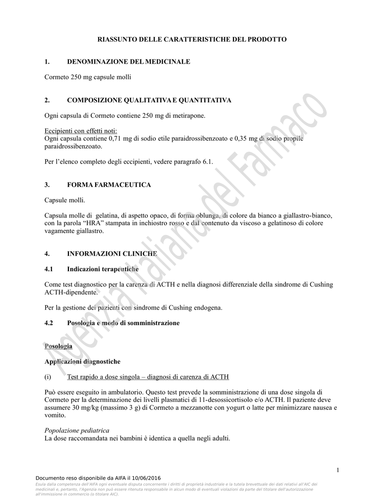 RIASSUNTO DELLE CARATTERISTICHE DEL PRODOTTO 1. DENOMINAZIONE DEL MEDICINALE Cormeto 250 mg capsule molli 2. COMPOSIZIONE QUALITATIVA E QUANTITATIVA Ogni capsula di Cormeto contiene 250 mg di metirapone. Eccipienti con effetti noti: Ogni capsula contiene 0,71 mg di sodio etile paraidrossibenzoato e 0,35 mg di sodio propile paraidrossibenzoato. Per l’elenco completo degli eccipienti, vedere paragrafo 6.1. 3. FORMA FARMACEUTICA Capsule molli. Capsula molle di gelatina, di aspetto opaco, di forma oblunga, di colore da bianco a giallastro-bianco, con la parola “HRA” stampata in inchiostro rosso e dal contenuto da viscoso a gelatinoso di colore vagamente giallastro. 4. INFORMAZIONI CLINICHE 4.1 Indicazioni terapeutiche Come test diagnostico per la carenza di ACTH e nella diagnosi differenziale della sindrome di Cushing ACTH-dipendente. Per la gestione dei pazienti con sindrome di Cushing endogena. 4.2 Posologia e modo di somministrazione Posologia Applicazioni diagnostiche (i) Test rapido a dose singola – diagnosi di carenza di ACTH Può essere eseguito in ambulatorio. Questo test prevede la somministrazione di una dose singola di Cormeto per la determinazione dei livelli plasmatici di 11-desossicortisolo e/o ACTH. Il paziente deve assumere 30 mg/kg (massimo 3 g) di Cormeto a mezzanotte con yogurt o latte per minimizzare nausea e vomito. Popolazione pediatrica La dose raccomandata nei bambini è identica a quella negli adulti. 1 Documento reso disponibile da AIFA il 10/06/2016 Esula dalla competenza dell’AIFA ogni eventuale disputa concernente i diritti di proprietà industriale e la tutela brevettuale dei dati relativi all’AIC dei medicinali e, pertanto, l’Agenzia non può essere ritenuta responsabile in alcun modo di eventuali violazioni da parte del titolare dell'autorizzazione all'immissione in commercio (o titolare AIC). Il campione di sangue per l’analisi viene prelevato la mattina presto (7:30 – 8:00). Il plasma deve essere congelato appena possibile. Quindi il paziente riceve una dose profilattica di 50 mg di cortisone acetato. Valutazione L’intervallo di normalità dei valori dipende dal metodo usato per la determinazione dei livelli di ACTH e 11-desossicortisolo. La presenza di una riserva intatta di ACTH è generalmente indicata da un aumento dei livelli plasmatici di ACTH ad almeno 44 pmol/L (200 ng/L) o da un aumento di 11-desossicortisolo a oltre 0,2 µmol/L (70 µg/L). I pazienti con sospetta insufficienza corticosurrenale devono essere ricoverati per la notte in via precauzionale. (ii) Test a dosi multiple – diagnosi di carenza di ACTH e diagnosi differenziale di ipercorticosurrenalismo nella sindrome di Cushing Il paziente deve essere ricoverato. Questo test misura i livelli degli steroidi nelle urine. Il primo giorno vengono determinati i valori basali per le 24 ore che precedono il test. Il secondo giorno, a intervalli di 4 ore per 24 ore, vengono somministrati 500-750 mg di Cormeto per una dose totale di 3,0-4,5 g. L’effetto è valutato su due campioni consecutivi di urine delle 24 ore. L’effetto massimo di Cormeto sui valori degli steroidi nelle urine dovrebbe essere raggiunto entro le 24 ore successive. Popolazione pediatrica: La dose raccomandata per la popolazione pediatrica si basa su dati limitati. Nei bambini la dose deve essere 15 mg/kg di peso corporeo, con una dose minima di 250 mg ogni 4 ore per 6 dosi. Si raccomanda l’assunzione delle capsule con latte o dopo i pasti per minimizzare nausea e vomito. Valutazione Carenza di ACTH: Se l’ipofisi anteriore funziona normalmente, Cormeto determina un aumento marcato (fino ad almeno due volte i valori basali) dei livelli urinari dei 17-idrossicorticosteroidi (17–OHCS) o degli steroidi 17chetogenici (17–KGS). L’assenza di risposta è indicativa di insufficienza corticosurrenale secondaria. Sindrome di Cushing: Un aumento eccessivo dei livelli urinari di 17–OHCS o 17–KGS in seguito all’assunzione di Cormeto è segno di un’iperproduzione di ACTH che ha determinato un quadro di iperplasia corticosurrenale (sindrome di Cushing). Tale aumento può essere considerato indicativo dell’assenza di tumori corticosurrenali secernenti cortisolo. Uso terapeutico Adulti La dose iniziale di metirapone per la gestione della sindrome di Cushing può variare da 250 a 1.000 mg/die, a seconda della gravità dell’ipercortisolismo e della causa della sindrome di Cushing. La terapia con metirapone può iniziare a dosi di 750 mg/die. Per i pazienti con sindrome di Cushing di grado severo le dosi iniziali possono essere superiori, fino a 1500 mg/die. Dosi iniziali più basse possono essere usate in caso di malattia di Cushing di grado lieve o di adenoma surrenale o iperplasia surrenale. La dose di metirapone deve essere aggiustata su base individuale a seconda delle esigenze del paziente e della tollerabilità del prodotto. La dose di mantenimento consueta è compresa tra 500 e 6.000 mg/die da somministrare in tre o quattro dosi refratte. 2 Documento reso disponibile da AIFA il 10/06/2016 Esula dalla competenza dell’AIFA ogni eventuale disputa concernente i diritti di proprietà industriale e la tutela brevettuale dei dati relativi all’AIC dei medicinali e, pertanto, l’Agenzia non può essere ritenuta responsabile in alcun modo di eventuali violazioni da parte del titolare dell'autorizzazione all'immissione in commercio (o titolare AIC). Dopo alcuni giorni la dose giornaliera deve essere aggiustata per abbassare i livelli medi di cortisolo plasmatico/sierico e/o i livelli di cortisolo libero nelle urine delle 24 ore a un valore target normale o fino a raggiungere la dose massima tollerata di metirapone. I livelli medi di cortisolo sierico/plasmatico possono essere calcolati sulla media di 5-6 campioni di plasma/siero ottenuti nell’arco di una giornata o sulla base dei livelli di cortisolo misurati appena prima della dose mattutina. Per apportare ulteriori modifiche della dose, se eventualmen