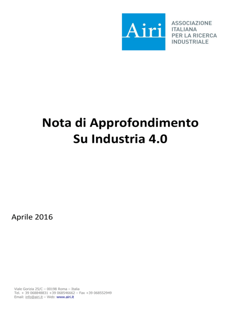 Nota di Approfondimento Su Industria 4.0 Aprile 2016 Viale Gorizia 25/C – 00198 Roma – Italia Tel. + 39 068848831 +39 068546662 – Fax +39 068552949 Email: [email protected] – Web: www.airi.it Aspetti Generali Livello Europeo L'Industria manifatturiera svolge un ruolo centrale nell’economica dell’Unione Europea in termini di ricerca, innovazione, produttività, occupazione ed esportazioni. Il suo fatturato aggegato pari a circa 7.000 Mld€ (dati Eurostat 2011) contribuisce attualmente alla crescita economica dell'Europa per circa il 15 % del PIL (rispetto al 12 % degli USA) , genera un valore aggiunto di circa 1.650 Mld€ (il 45% del valore aggiunto proviene dalle PMI), dà lavoro direttamente a oltre 30 milioni di persone e, sostiene un indotto di oltre 60 milioni di addetti. Il suo export, al di fuori dell’Unione, ammonta a oltre 1.500 Mld€ (più di Cina e Stati Uniti), con un mercato interno costituito da 500 milioni di consumatori ; nelle aree di R&I delle diverse realtà manifatturiere operano oltre 500.000 ricercatori e innovatori. L’Unione Europea sta lentamente emergendo da una delle recessioni più lunghe che abbia mai sperimentato e che ha determinato gravi ricadute sulle imprese, in termini di drastica riduzione della domanda interna ed estera e vertiginosa contrazione del credito : diretta conseguenza di ciò sono state il drammatico incremento della disoccupazione ed il repentino blocco di gran parte degli investimenti produttivi. La fase della ripresa, solo grazie alla presenza di alcuni fattori contingenti inequivocabilmente favorevoli (riduzione dei costo dei combustibili fossili, politica iper espansiva della BCE, svalutazione dell’euro), sta ora lentamente iniziando a manifestarsi, anche se con dinamiche molti diverse tra i diversi Paesi dell’Unione. ll rilancio della crescita e della competitività per sostenere e rafforzare la ripresa è quindi più che mai una priorità essenziale per l'Europa e ciò deve avvenire attraverso una politica di sostegno all’industria manifatturiera, fondata sulla ricerca, l’innovazione e la formazione per rafforzare, consolidare e sviluppare imprese altamente competitive e pienamente sostenibili. In tale quadro l’Europa intende sviluppare - attraverso attività di ricerca e innovazione, formazione - risposte altamente innovative, costituite da prodotti e servizi, processi e business 2 models, nuove imprese altamente competitive e sostenibili. Si tratta quindi di promuovere e rafforzare un nuovo Manifatturiero che, per la sua elevata sostenibilità e competitività fondata sull’innovazione, possa contribuire significativamente alla crescita di una nuova economia sociale, intelligente, sostenibile, inclusiva, che – tra l’altro - vede nelle grandi sfide nuovi mercati ad alto valore aggiunto. Attraverso la R&D, l’obiettivo generale di un Manifatturiero Innovativo sarà quello di realizzare: una sostenibilità economica, coniugando la qualità con la produttività e generando ricchezza; una sostenibilità sociale, integrando le capacità umane con la tecnologia e generando posti di lavoro ad alto valore aggiunto; una sostenibilità ambientale, riducendo il consumo di risorse e la generazione di rifiuti e favorendo la riciclabilità dei materiali (Economia Circolare). Questo processo, che si realizzerà a vari livelli, dovrà essere indirizzato e sostenuto da Policy Instruments che vanno dalle piattaforme tecnologiche (che sviluppano visioni, agende strategiche di ricerca e roadmaps) ai programmi di ricerca, innovazione e formazione, fondati su finanziamenti pubblici e privati, ed operando a livello regionale, nazionale, europeo, internazionale. E’ questo il contesto generale in cui si pone INDUSTRIA 4.0, caratterizzata dai “Cyber Physical Systems” che rappresenteranno l’integrazione estesa di produzione,sostenibilità e custome satisfaction, formando la base della rete intelligente di di sistemi e processi. E’ importante fare un raffronto tra il modello europeo e quello americano. Il modello americano prende forma attraverso l’attività di consorzi e coalizioni private che coinvolgono grandi imprese dell’ICT e delle telecomunicazioni (come Intel, Cisco Systems, IBM, General Electrics e AT&T), della grande industria manifatturiera e di processo (General Motors, General Electrics, Rockwell Automation) in collaborazione con prestigiose università (come UCLA e West Virginia). Sul piano tecnologico, fra le molte tecnologie si privilegia l’Internet of Things lavorando per favorire lo sviluppo di applicazioni, architetture di riferimento e standard aperti, utili a facilitarne la diffusione nell’industria e nei servizi. Le attività si sviluppano anche senza il 3 coinvolgimento delle amministrazioni pubbliche, grazie a investimenti del venture capital aziendale come GE Ventures, Siemens Venture Capital, Cisco Investments, Qualcomm Ventures e Intel Capital. Mentre nel modello europeo si preferisce enfatizzare il ruolo della Smart Factory, nel modello americano si privilegia la tecnologia Internet of Things: ne deriva che il modello europeo si propone di ottimizzare soprattutto il settore manifatturiero, mentre nel caso statunitense gli obiettivi di ricerca puntano a migliorare anche le attività dei servizi, ovvero il sistema economico nel suo complesso. Il modello europeo preferisce individuare uno standard comune, a cui tutte le imprese facciano riferimento per lo sviluppo delle tecnologie adeguate; il modello americano intende definire piattaforme aperte a tutti gli operatori. Infine, come accennato, il modello europeo prevede un intervento sostanziale da parte del pubblico, al contrario il modello americano è molto sostenuto dalle imprese private e dalle fondazioni di ricerca. Livello Nazionale Il Manifatturiero italiano riveste un ruolo rilevante in termini economici-sociali per il Sistema Paese. Esso, infatti - secondo i dati Eurostat 2011 - è costituito da 425.000 imprese, genera un fatt