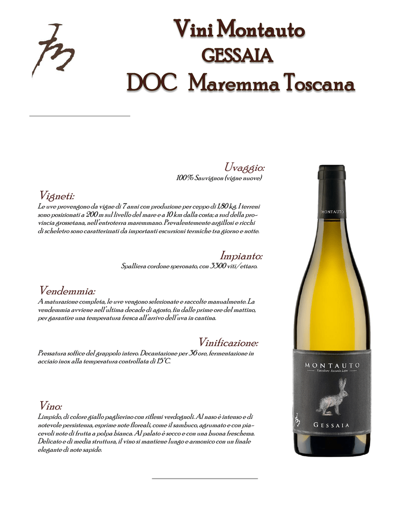 Uvaggio: 100% Sauvignon (vigne nuove) Vigneti: Le uve provengono da vigne di 7 anni con produzione per ceppo di 1,80 kg. I terreni sono posizionati a 200 m sul livello del mare e a 10 km dalla costa; a sud della provincia grossetana, nell’entroterra maremmano. Prevalentemente argillosi e ricchi di scheletro sono caratterizzati da importanti escursioni termiche tra giorno e notte. Impianto: Spalliera cordone speronato, con 3300 viti/ettaro. Vendemmia: A maturazione completa, le uve vengono selezionate e raccolte manualmente. La vendemmia avviene nell’ultima decade di agosto, fin dalle prime ore del mattino, per garantire una temperatura fresca all’arrivo dell’uva in cantina. Vinificazione: Pressatura soffice del grappolo intero. Decantazione per 36 ore, fermentazione in acciaio inox alla temperatura controllata di 15°C. Vino: Limpido, di colore giallo paglierino con riflessi verdognoli. Al naso è intenso e di notevole persistenza, esprime note floreali, come il sambuco, agrumato e con piacevoli note di frutta a polpa bianca. Al palato è secco e con una buona freschezza. Delicato e di media struttura, il vino si mantiene lungo e armonico con un finale elegante di note sapide.