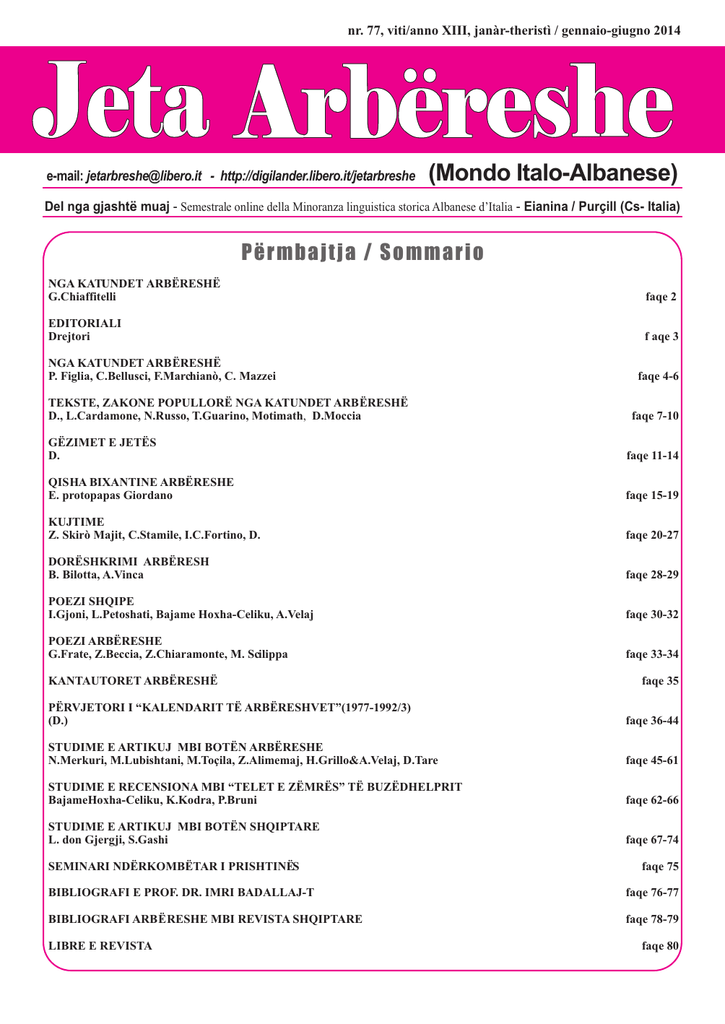 nr. 77, viti/anno XIII, janàr-theristì / gennaio-giugno 2014 e-mail: [email protected] - http://digilander.libero.it/jetarbreshe (Mondo Italo-Albanese) Del nga gjashtë muaj - Semestrale online della Minoranza linguistica storica Albanese d’Italia - Eianina / Purçill (Cs- Italia) NGA KATUNDET ARBËRESHË G.Chiaffitelli Pë rmbajtja / S o mmario EDITORIALI Drejtori NGA KATUNDET ARBËRESHË P. Figlia, C.Bellusci, F.Marchianò, C. Mazzei TEKSTE, ZAKONE POPULLORË NGA KATUNDET ARBËRESHË D., L.Cardamone, N.Russo, T.Guarino, Motimath, D.Moccia GËZIMET E JETËS D. QISHA BIXANTINE ARBËRESHE E. protopapas Giordano KUJTIME Z. Skirò Majit, C.Stamile, I.C.Fortino, D. DORËSHKRIMI ARBËRESH B. Bilotta, A.Vinca POEZI SHQIPE I.Gjoni, L.Petoshati, Bajame Hoxha-Celiku, A.Velaj faqe 2 f aqe 3 faqe 4-6 faqe 7-10 faqe 11-14 faqe 15-19 faqe 20-27 faqe 28-29 faqe 30-32 POEZI ARBËRESHE G.Frate, Z.Beccia, Z.Chiaramonte, M. Scilippa faqe 33-34 PËRVJETORI I “KALENDARIT TË ARBËRESHVET”(1977-1992/3) (D.) faqe 36-44 KANTAUTORET ARBËRESHË STUDIME E ARTIKUJ MBI BOTËN ARBËRESHE N.Merkuri, M.Lubishtani, M.Toçila, Z.Alimemaj, H.Grillo&A.Velaj, D.Tare STUDIME E RECENSIONA MBI “TELET E ZËMRËS” TË BUZËDHELPRIT BajameHoxha-Celiku, K.Kodra, P.Bruni STUDIME E ARTIKUJ MBI BOTËN SHQIPTARE L. don Gjergji, S.Gashi SEMINARI NDËRKOMBËTAR I PRISHTINËS BIBLIOGRAFI E PROF. DR. IMRI BADALLAJ-T BIBLIOGRAFI ARBËRESHE MBI REVISTA SHQIPTARE LIBRE E REVISTA faqe 35 faqe 45-61 faqe 62-66 faqe 67-74 faqe 75 faqe 76-77 faqe 78-79 faqe 80 NGA KATUNDET ARBËRESHË Ta k s a f o k à t i k , M a s h q i t ë Taksa çë Aragonezat e Spanjollat kërkojan ish “fokàtiku”, thënur ashtu nga fjala “focus” (zjarr, vatër) çë nga fëmilë kish të paguaj. Ndër 17 të majit të vitit 1507, zoti don Konsalvi i Kordovas, më parë sa të lëj Napulin, i dha Llaxarit Mattes kazalin Mashqitë, çë ish pa fare gjënd e i lëshoj sa arbëreshet nëng kish paguajën mosnjë taks, kaq ordinarë sa straordinarë. Të parat çë zunë vend klenë suldètrat e Llaxarit Mattes e prana arrunë tjetrat arbëreshë nga katundat lëtirë pranë. Po më të shumët klenë, më se një qënd fëmilë, Koronètë, çë arrunë Mashqitë tek viti 1534 pas çë ra Korone, e Karli V bëri paqen me Solimanin I. At’hera ishan zotra dherëvet të Mashqitës Peshpëku Vënozës e Priorati Shën Sepullkrit të Barit, çë i shitëtin ta viti 1539 zotit don Giovanni-t de Icis. Arbëreshet (Mashqitanet), të shprishura ndër dherat, ndë kalidha e pa shpi guri, vejan tura vjedhur e tura bënë shumë dëma, kaq sa “viçerrègji”, don Pedro de Toledo urdhërojti të rrijan mblidhur e të rrojan ndë shpi guri të redhura e të mbillura nga mura ma një derë. Adhè sot thomi “Dalmi jasht nga Porta”. Don Giovanni de Icis te viti 1541 stisi shpitë guri, po kërkojti fokàtikun: një dukàt nga fëmilë. Mashqitanet u zunë me zotin de Icis se, tura vënë këtë taksë, nëng nderoj dhuratan e don Konsalvit de Kordova, çë i lëshoj “in perpetuo” të mos paguajan mosnjë taksë. Zoti de Icis kle ashtu shtrënguar të nxirriej këtë taksë e ta viti 1544 arrunë Mashqitë 24 fëmilë arbëreshë nga Trivigno e nga San Chirico Nuovo; ta viti 1647 erdhtin shumë Majnotë çë iktin nga Majna. Koronetë ishan “stratiòtes”, bulara; e adhe sod, pas kaq mot, kur na do thomi sa një burr isht bular, thomi:”Ish dreq një Koronè”. Ta viti 1627, pë ftesë të monxinjòrit Diodato Scaglia, peshpëku i Melfës, dhëbuartim ritin bixantinë, gjëmsan a shpirtit arbresh, po mbami adhe shtrënguar fort gluhan, besan e nderin, çë na la loshi i madh Skanderbegu. dy Giuseppe Chiaffitelli ka Mashqita (Pz) LA TASSA DEL FOCATICO, A MASCHITO - La tassa che gli Aragonesi e gli Spagnoli esigevano era il “focatico”, detto così da “focus”(fuoco, focolare) che ogni famiglia era obbligata a pagare. Il 17 di maggio del 1507, Don Consalvo de Cordova, prima di lasciare Napoli, concedeva all’albanese Lazzaro Mattes il casale di Maschito disabitato e concedeva anche che gli albanesi non dovessero pagare nessuna tassa, sia ordinaria che straordinaria. Per primi si stabilirono il soldati di Lazzaro Mattes, in seguito giunsero altri albanesi dai paesi latini vicini. Ma i più numerosi furono i Coronei, più di cento famiglie, che arrivarono a Maschito nell’anno 1534, dopo la caduta di Corone e la pace che Carlo V fece con Solimano I. Allora possedevano il territorio di Maschito il Vescovo di Venosa ed il Priorato del Santo Sepolcro, i quali lo vendettero, nell’anno 1539, a don Giovanni de Icis. Gli albanesi (Maschitani), sparsi nel territorio in pagliai e senza case di pietra, andavano rubando e commettendo ogni danno, tanto che il vicerè don Pedro de Toledo ordinò che vivessero raccolti in case di pietra circondate chiuse da mura con una Porta. Don Giovanni de Icis costruì le case, ma pretese il “focatico”: un ducato per ciascun nucleo familiare. I maschitani fecero reclamo contro il signor de Icis, poichè, imponendo questa tassa, non onorava la donazione di don Consalvo di Cordova, che aveva concesso “in perpetuo” che non pagassero nessuna tassa. Il signor de Icis fu costretto a togliere questa tassa e nell’anno 1544 arrivarono a Maschito 24 famiglie albanesi da Trivigno e San Chirico Nuovo; nell’anno 1647 vennero molti Mainotti, che fuggirono da Maina. I Coronei erano “stratiòtes”, nobili, ed ancora oggi, dopo tanto tempo, quando vogliamo dire che un uomo è nobile, diciamo:”E’ davvero un Coroneo!”. Nell’anno 1627, per colpa di monsignor Diodato Scaglia, vescovo di Melfi, abbiamo perduto il rito bizantino; però conserviamo ancora forte la lingua, la fede e l’onore, che ci lasciò in eredità il nostro grande avo Skanderbeg. Ndëse do të shkruash arbërisht mbi Jeta Arbëreshe (+39) 0981-32539 / [email protected] Jeta Arbëreshe, 77 / janar-theristì 2014 2 EDITORIALI Në ‘Kosovën e pavarur’ s