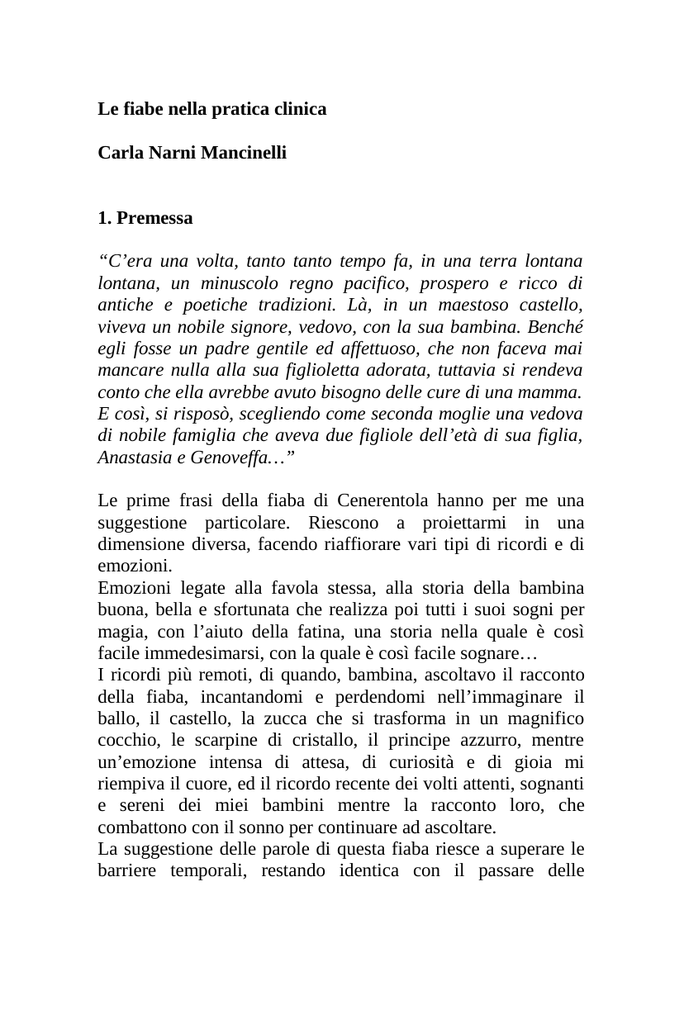 Le fiabe nella pratica clinica Carla Narni Mancinelli 1. Premessa “C’era una volta, tanto tanto tempo fa, in una terra lontana lontana, un minuscolo regno pacifico, prospero e ricco di antiche e poetiche tradizioni. Là, in un maestoso castello, viveva un nobile signore, vedovo, con la sua bambina. Benché egli fosse un padre gentile ed affettuoso, che non faceva mai mancare nulla alla sua figlioletta adorata, tuttavia si rendeva conto che ella avrebbe avuto bisogno delle cure di una mamma. E così, si risposò, scegliendo come seconda moglie una vedova di nobile famiglia che aveva due figliole dell’età di sua figlia, Anastasia e Genoveffa…” Le prime frasi della fiaba di Cenerentola hanno per me una suggestione particolare. Riescono a proiettarmi in una dimensione diversa, facendo riaffiorare vari tipi di ricordi e di emozioni. Emozioni legate alla favola stessa, alla storia della bambina buona, bella e sfortunata che realizza poi tutti i suoi sogni per magia, con l’aiuto della fatina, una storia nella quale è così facile immedesimarsi, con la quale è così facile sognare… I ricordi più remoti, di quando, bambina, ascoltavo il racconto della fiaba, incantandomi e perdendomi nell’immaginare il ballo, il castello, la zucca che si trasforma in un magnifico cocchio, le scarpine di cristallo, il principe azzurro, mentre un’emozione intensa di attesa, di curiosità e di gioia mi riempiva il cuore, ed il ricordo recente dei volti attenti, sognanti e sereni dei miei bambini mentre la racconto loro, che combattono con il sonno per continuare ad ascoltare. La suggestione delle parole di questa fiaba riesce a superare le barriere temporali, restando identica con il passare delle generazioni, e riesce a superare, anche, le barriere sociali e culturali. Una delle esperienze per me più forti, è quando, a sedici anni, mi trovai a fare l’animatrice in una colonia estiva per bambini con grave disagio sociale, provenienti dall’interland napoletano. E’ superfluo descrivere il loro modo di rapportarsi tra di loro e con gli adulti, e non c’è, credo, bisogno di sottolineare la situazione di carenza affettiva vissuta dai più. La prima sera che passai con loro, ricordo che li accompagnai nella camerata e mi venne l’idea di raccontargli una fiaba. I quindici bambini si fiondarono nei letti e si misero ad ascoltare. I loro volti stupiti, attenti, sognanti e sereni, il silenzio che mi regalarono nell’ascoltare la favola, il loro scivolare, dolcemente, nel sonno, io non l’ho più dimenticato. Per questo, e per altri motivi, credo che le fiabe siano uno strumento eccezionale per mettersi in comunicazione con le altre persone, uno strumento adatto anche ad essere usato per promuovere il cambiamento, nella psicoterapia come nelle attività psico-educative. E’ uno strumento, la fiaba, che io amo molto, e che nella mia personale esperienza clinica ho utilizzato tante e tante volte, sia con i bambini che con gli adulti. 2. Pratica clinica. La psicoterapia come narrazione Parlare di fiabe nella pratica clinica vuol dire aprire il discorso su cosa si intende come pratica clinica e, quindi, su come poter utilizzare le fiabe come strumento terapeutico. Per “pratica clinica” qui intendiamo sia la psicoterapia, con il suo setting individuale, di coppia, familiare, di gruppo, sia altri tipi di intervento volti a modificare delle situazioni esistenziali, quali l’intervento clinico in classe, la conduzione di gruppi di confronto con insegnanti ed alunni, la messa in atto di tecniche di cambiamento, quali il problem solving o il role playing. Ciascuna di queste possibilità presuppone, per poter essere considerata terapeutica, la costituzione, alla base, di un contesto relazionale che giustifichi e connoti l’intervento come terapeutico, e, soprattutto, la creazione di una relazione terapeutica. L’intervento clinico richiede, per essere considerato tale, un riconoscimento da entrambe le parti che entrano in gioco, riconoscimento che dia senso a quello che avviene in quel contesto, definendone, quindi, i significati. La definizione del contesto è quindi il primo elemento da considerare affinché una serie di azioni possano essere considerate o meno terapia. Non sono, infatti, le azioni in sé, le tecniche, a definire il contesto dell’intervento, ma viceversa. Ai fini della promozione del movimento, e quindi del cambiamento, possono essere utilizzate svariate metodiche, che vanno dal gioco alla discussione, dall’espressione di associazioni libere allo psicodramma, dal colloquio clinico alla musicoterapia o alla danzaterapia. Quello che rende terapeutiche le tecniche, utilizzabili peraltro in mille altre situazioni, sono principalmente due aspetti: la definizione del contesto come terapeutico la relazione tra terapeuta e paziente. La considerazione di questi due aspetti ci consente di stabilire, quindi, chi è il terapeuta, e quali obiettivi può – e dovrebbe – perseguire. Il rischio comune, per chi fa questo lavoro, è di ergersi in cattedra, di porsi su un piedistallo, forte delle teorie epistemologiche di cui è a conoscenza e delle spiegazioni della psicopatologia, che somigliano tanto alla verità, ma ne detengono in realtà solo una parte. Ma il terapeuta non è un maestro, non è una guida, non è uno che indica la strada. Mi è stato insegnato a pensare al terapeuta come ad un tassista, che guida l’auto che conduce il passeggero a destinazione. Non è il tassista che stabilisce dove andare, né perché. Il tassista non giudica, non si intromette con la scelta del passeggero di andare in un tal posto, ma sceglie per lui il percorso più adatto, e lo accompagna. Il terapeuta deve quindi “solo traghettare individui, coppie, famiglie, allievi da una sponda all’altra, mettendoci anche noi al “servizio del bambino”, rinunciando “al conforto delle verità ultime e non lasciandoci mai guidare da ciò che possiamo sapere della follia. Nessun concetto della psicop