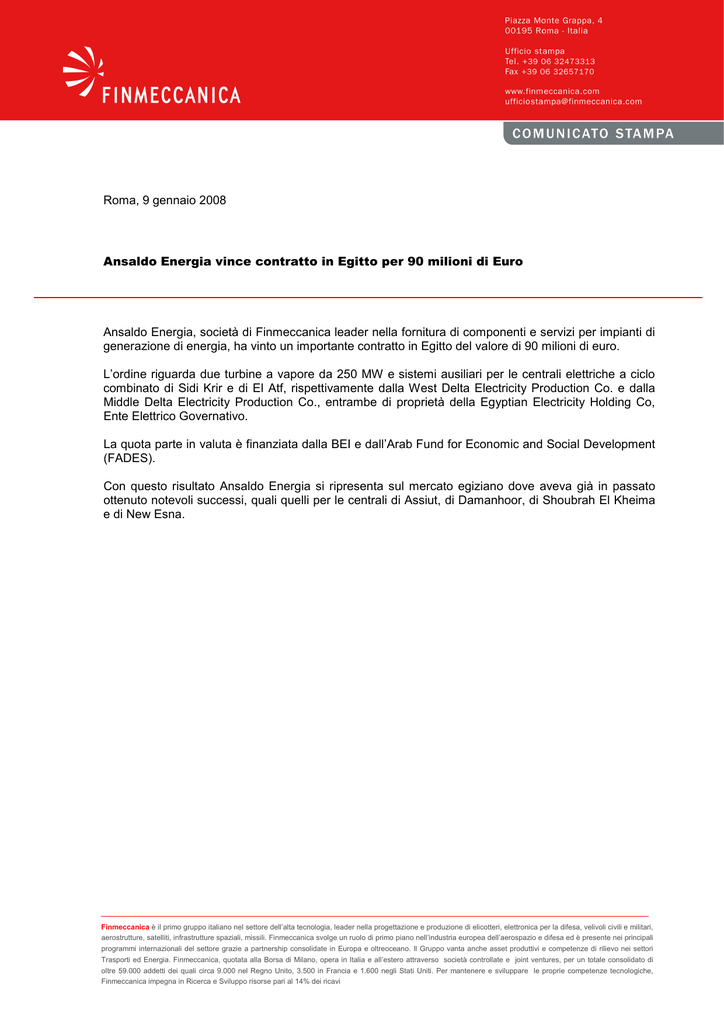 Roma, 9 gennaio 2008 Ansaldo Energia vince contratto in Egitto per 90 milioni di Euro Ansaldo Energia, società di Finmeccanica leader nella fornitura di componenti e servizi per impianti di generazione di energia, ha vinto un importante contratto in Egitto del valore di 90 milioni di euro. L’ordine riguarda due turbine a vapore da 250 MW e sistemi ausiliari per le centrali elettriche a ciclo combinato di Sidi Krir e di El Atf, rispettivamente dalla West Delta Electricity Production Co. e dalla Middle Delta Electricity Production Co., entrambe di proprietà della Egyptian Electricity Holding Co, Ente Elettrico Governativo. La quota parte in valuta è finanziata dalla BEI e dall’Arab Fund for Economic and Social Development (FADES). Con questo risultato Ansaldo Energia si ripresenta sul mercato egiziano dove aveva già in passato ottenuto notevoli successi, quali quelli per le centrali di Assiut, di Damanhoor, di Shoubrah El Kheima e di New Esna. Finmeccanica è il primo gruppo italiano nel settore dell’alta tecnologia, leader nella progettazione e produzione di elicotteri, elettronica per la difesa, velivoli civili e militari, aerostrutture, satelliti, infrastrutture spaziali, missili. Finmeccanica svolge un ruolo di primo piano nell’industria europea dell’aerospazio e difesa ed è presente nei principali programmi internazionali del settore grazie a partnership consolidate in Europa e oltreoceano. Il Gruppo vanta anche asset produttivi e competenze di rilievo nei settori Trasporti ed Energia. Finmeccanica, quotata alla Borsa di Milano, opera in Italia e all’estero attraverso società controllate e joint ventures, per un totale consolidato di oltre 59.000 addetti dei quali circa 9.000 nel Regno Unito, 3.500 in Francia e 1.600 negli Stati Uniti. Per mantenere e sviluppare le proprie competenze tecnologiche, Finmeccanica impegna in Ricerca e Sviluppo risorse pari al 14% dei ricavi