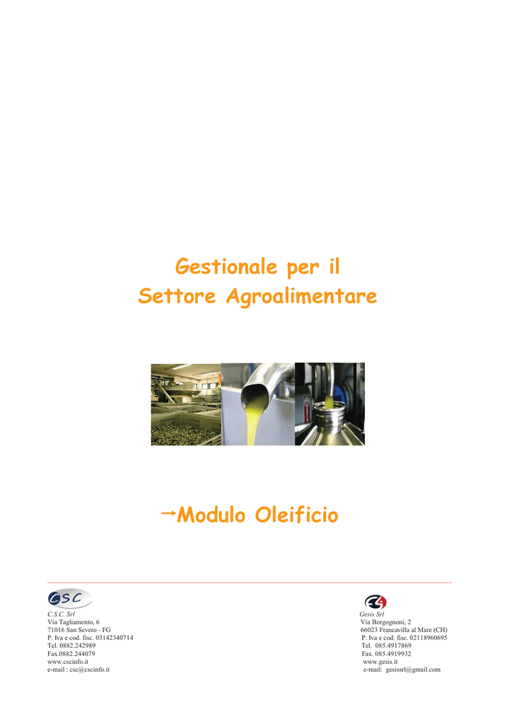 *HVWLRQDOHSHULO 6HWWRUH$JURDOLPHQWDUH 0RGXOR2OHLILFLR __________________________________________________________________________________________________________ C.S.C. Srl Via Tagliamento, 6 71016 San Severo - FG P. Iva e cod. fisc. 03142340714 Tel. 0882.242989 Fax.0882.244079 www.cscinfo.it e-mail : [email protected] Gesis Srl Via Borgognoni, 2 66023 Francavilla al Mare (CH) P. Iva e cod. fisc. 02118960695 Tel. 085.4917869 Fax. 085.4919932 www.gesis.it e-mail: [email protected] MODULO OLEIFICIO REGISTRI E DOCUMENTI FISCALI ARCHIVI DI BASE • • • • • • • • Anagrafica Prodotti Anagrafica Caratteristiche prodotti Anagrafica Associazione prodotti-Caratteristiche Anagrafica Qualificazione prodotti Anagrafica Registri oli Archivio Acconti e liquidazione Archivio Listino Archivio Condizioni di pagamento GESTIONE CONFERIMENTI/ACQUISTI • Gestione contenitori olive • Conferimento/acquisto prodotti ed emissione relativi documenti di entrata • Conferimento prodotti in c/lavorazione • Interrogazioni e stampe conferimenti • Statistiche PRODUZIONE • Pianificazione per la molitura • Lavorazione c/proprio • Lavorazione c/terzi – gestione olio ritirato, olio ceduto e olio in c/deposito. • Gestione fasi di lavorazione • Distinta Base • Imbottigliamento • Costi dell’imbottigliamento • Gestione recipienti in prestito d’uso • Gestione distinte per la lavorazione • Gestione distinte per la vendita • Gestione distinte per acquisto olive da terzi • • • • Registro giornaliero della molitura Registro degli oli di oliva Registro carico/scarico File per l’invio telematico al SIAN del registro di carico e scarico degli oli LABORATORIO ANALISI • • • • Anagrafica recipienti Gestione analisi Gestione recipienti e lotti Gestione campionature GESTIONE PAGAMENTI • Scadenziari pagamenti • Pagamenti acconti/liquidazioni/riliquidazioni con emissione automatica della fattura/autofattura, dell’assegno bancario o disposizione di bonifico e della reversale/mandato. Nel caso il fornitore sia anche cliente può essere richiesta la generazione automatica di movimenti di compensazione clienti/fornitori. • Interrogazioni e stampe dei pagamenti TRACCIABILITÀ E RINTRACCIABILITÀ • Tracciabilità: gestione delle informazioni e dei documenti per tracciare la storia del prodotto finito da monte a valle. • Rintracciabilità: ricerca dei lotti al fine di risalire all’origine del prodotto, quindi alla sua composizione e ai lotti delle materie prime utilizzate. __________________________________________________________________________________________________________ C.S.C. Srl Via Tagliamento, 6 71016 San Severo - FG P. Iva e cod. fisc. 03142340714 Tel. 0882.242989 Fax.0882.244079 www.cscinfo.it e-mail : [email protected] Gesis Srl Via Borgognoni, 2 66023 Francavilla al Mare (CH) P. Iva e cod. fisc. 02118960695 Tel. 085.4917869 Fax. 085.4919932 www.gesis.it e-mail: [email protected] Tracciabilità - Rintracciabilità Indice Cosa si intende per rintracciabilità Cosa è possibile rintracciare Motivazioni che impongono la rintracciabilità Il dilemma: rintracciabilità informatizzata o manuale La soluzioni CSC per la tracciabilità __________________________________________________________________________________________________ C.S.C. Srl Via Tagliamento, 6 71016 San Severo - FG P. Iva e cod. fisc. 03142340714 Tel. 0882.242989 Fax.0882.244079 www.cscinfo.it e-mail : [email protected] Gesis Srl Via Borgognoni, 2 66023 Francavilla al Mare (CH) P. Iva e cod. fisc. 02118960695 Tel. 085.4917869 Fax. 085.4919932 www.gesis.it e-mail: [email protected] Cosa si intende per rintracciabilità Molti utilizzano come sinonimi i termini tracciabilità e rintracciabilità; in realtà, questi due termini identificano due processi inversi: la tracciabilità (tracking) identifica il percorso di un prodotto da monte a valle dell’azienda lasciando, ad ogni stadio di questo percorso, opportune informazioni; la rintracciabilità (tracing) è il processo inverso, che cioè permette di raccogliere le informazioni “scritte” precedentemente. Più è precisa la tracciabilità, meno onerosa è la rintracciabilità a posteriori, cioè il richiamo in caso di emergenza, in quanto più facilmente circoscrivibile al lotto specifico di produzione o di spedizione. È evidente come i due processi siano fortemente legati e basati su uno stesso sistema, che chiameremo di tracciabilità. Cosa è possibile rintracciare Cosa è possibile tracciare e, perché no, rintracciare? Un pallet, un lotto, un articolo, una bottiglia, un vestito, un barattolo, un bullone, un vetro, un documento, un’attività, un componente, un paziente, una sacca di plasma, un ingrediente e molto altro ancora. __________________________________________________________________________________________________ C.S.C. Srl Via Tagliamento, 6 71016 San Severo - FG P. Iva e cod. fisc. 03142340714 Tel. 0882.242989 Fax.0882.244079 www.cscinfo.it e-mail : [email protected] Gesis Srl Via Borgognoni, 2 66023 Francavilla al Mare (CH) P. Iva e cod. fisc. 02118960695 Tel. 085.4917869 Fax. 085.4919932 www.gesis.it e-mail: [email protected] Motivazioni che impongono la rintracciabilità Sia che lo impongano le normative, sia che lo imponga il mercato, sia che lo impongano i clienti, sia che lo imponga l’organizzazione aziendale, è oramai divenuta indispensabile la possibilità di costruire le informazioni man mano che vengono prodotte, per poterle poi ricostruire in qualsiasi momento, al fine di trarre delle conclusioni sull’efficienza, sulla redditività, sull’efficacia, di ciò che sta facendo la nostra organizzazione. Il dilemma: rintracciabilità informatizzata o manuale? A questo punto il dilemma è: come costruire queste informazioni e come ricostruirle? Con strumenti automatici o con strumenti cartacei? Per rispondere a questa domanda basta chiedersi: ha più valore una notizia “fresca” o una notizia datata? Nessuno le