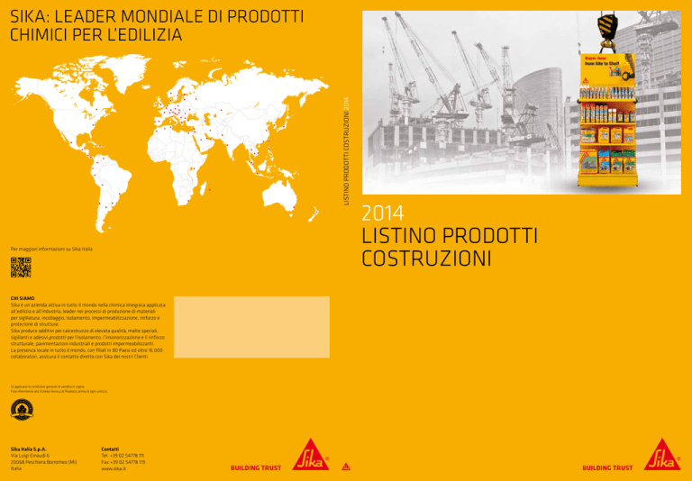 Listino prodotti costruzioni 2014 Sika: leader mondiale di prodotti chimici per l’edilizia Per maggiori informazioni su Sika Italia CHI SIAMO Sika è un’azienda attiva in tutto il mondo nella chimica integrata applicata all’edilizia e all’industria, leader nei processi di produzione di materiali per sigillatura, incollaggio, isolamento, impermeabilizzazione, rinforzo e protezione di strutture. Sika produce additivi per calcestruzzo di elevata qualità, malte speciali, sigillanti e adesivi,prodotti per l’isolamento, l’insonorizzazione e il rinforzo strutturale, pavimentazioni industriali e prodotti impermeabilizzanti. La presenza locale in tutto il mondo, con filiali in 80 Paesi ed oltre 16.000 collaboratori, assicura il contatto diretto con Sika dei nostri Clienti. Si applicano le condizioni generali di vendita in vigore. Fare riferimento alla Scheda Tecnica di Prodotto prima di ogni utilizzo. Sika Italia S.p.A. Via Luigi Einaudi 6 20068 Peschiera Borromeo (Mi) Italia Contatti Tel. +39 02 54778 111 Fax +39 02 54778 119 www.sika.it 2014 listino prodotti costruzioni i target market sika Sika sviluppa prodotti, sistemi, soluzioni e servizi per il mercato dell’industria e delle costruzioni, rivolgendosi a specifici target market. Concrete Waterproofing Refurbishment Roofing Sealing and Bonding Flooring Industry I Sika nel mercato della Distribuzione Edile 70 anni di esperienza La storia di Sika nel settore della Distribuzione iniziò negli anni ‘40 in Europa e in America latina, come risposta spontanea all’esigenza dei clienti di poter disporre di confezioni più piccole e sempre reperibili presso le rivendite in cui venivano acquistati gli altri prodotti. Nel tempo, questo trend si espanse gradualmente in altri Paesi e negli anni ‘90 Sika sviluppò la sua presenza nelle rivendite a livello mondiale. Oggi Sika Distribuzione è presente in oltre 80 Paesi, con una rete di oltre 110.000 distributori. Rivendita Sika in Colombia – 40 anni fa Know-how dal cantiere allo scaffale Sika fornisce prodotti altamente performanti, sperimentati e applicati nei più grandi cantieri del mondo. La qualità dei prodotti e delle tecnologie, sviluppata in 100 anni di esperienza, è a disposizione di tutti, professionisti e non, grazie ad un’ampia rete distributiva. I prodotti Sika sono disponibili presso rivendite qualificate in materiali edili, ferramenta professionali, punti vendita parquet, colorifici e lattonerie, centri per gli appassionati di bricolage, punti vendita dei più qualificati Home Centers e catene del Fai da te. I prodotti Sika per edilizia hanno lo stesso elevato standard qualitativo in tutto il mondo, e rendono Sika un partner affidabile e qualificato per tutti i nostri clienti, ovunque. II Puoi fidarti di Sika Ricerca e sviluppo Sika pone grande attenzione al cliente, dedicandosi costantemente alla ricerca e allo sviluppo di prodotti di elevata qualità, nel rispetto delle norme più elevate UNI EN ISO 9001 e UNI EN ISO 14001. Dalla sua fondazione, nel 1910, Sika ha più volte dimostrato la propria capacità di innovare. Gli investimenti nel campo della ricerca sono mirati proprio a perseguire lo sviluppo di prodotti, soluzioni e tecnologie applicative innovative. A vantaggio del cliente. Soluzioni sostenibili e rispetto per l’ambiente In qualità di membro dell’U.S. Green Building Council (USGBC) e di GBC Italia, Sika è coinvolta in processi decisionali chiave che hanno un impatto sul futuro del settore dell’edilizia sostenibile. Sika contribuisce con i propri sistemi all’ottenimento di punti per la certificazione LEED® e quindi allo sviluppo sostenibile, grazie ai propri prodotti, al know-how applicativo ed al proprio impegno fornendo: sistemi adesivi e di rivestimento a bassa emissione per la qualità ambientale in ambienti chiusi (tecnologia I-Cure) impermeabilizzazioni di coperture con sistema Energy Smart Roof, che riducono gli effetti isola di calore e ottimizzano le prestazioni energetiche soluzioni impermeabili per tetti verdi che ripristinano l’habitat e riducono il deflusso delle acque meteoriche sistemi traspiranti per sottotetto e pareti, che migliorano l’efficienza energetica dell’edificio Collaborazione attiva con il Cliente I prodotti Sika sono la componente più importante di un’ottima soluzione, ed i migliori risultati si ottengono quando il capitolato e l’installazione sono realizzati in modo professionale. Sika collabora attivamente con il Cliente per rendere sempre più semplici e più affidabili l’applicazione dei prodotti ed i lavori di dettaglio. Mettiamo a disposizione il nostro know-how tecnologico e offriamo il nostro supporto tecnico con seminari, corsi di formazione periodici e dimostrazioni pratiche. Facciamo tesoro dell’esperienza di cantiere dei nostri Partners e dei loro suggerimenti, per sviluppare nuovi prodotti e migliorare quelli esistenti. III Indice Alfabetico A Antigelo OC Antisol® S 79 80 B Bandella rl 80 s Bandella rl 120 Bussola preforata Bussola retinata 29 29 90 90 C Cartella colori stucchi Conservado®-5 Plus 77 10 D Diluente B Diluente C Diluente EG Diluente K Diluente S Dursiquar® N Dursiquar® T 87 88 88 88 88 62 62 E EpoCem® Modulo 61 Ethafoam53 I Igol®-229 Intraplast® EP 4 K Kit SikaFix®-350 20 M Miscelatore statico 90 P Pistola aria compressa Pistola base 280-310 ml Pistola manuale 280-310 ml Pistola manuale 380 ml Pistola manuale tubo Pistola manuale tubo cart.+ unipack 400 ml Pistola modello base per schiuma PU Pistola per Sika® AnchorFix-3+ Pistola professionale per schiuma PU Plastocrete® N Profilato tipo AR Profilato tipo DR Profilato tipo M Profilato tipo nitrilico Tc Tricomer D320 Profilato tipo O Profilato tipo V Pulitore per pistola schiuma PU Purigo® I-100 86 86 86 86 86 87 87 87 87 80 34 34 34 34 35 35 88 58 R Rete SikaTop® Seal-107 27 S Sabbia di quarzo 62-89 Sanisil®49 Separol® FV Plus 81 Separol® LE Plus 81 Stellmittel T 90 Sika Sika®-126-82 T Tabella colori Sika® 