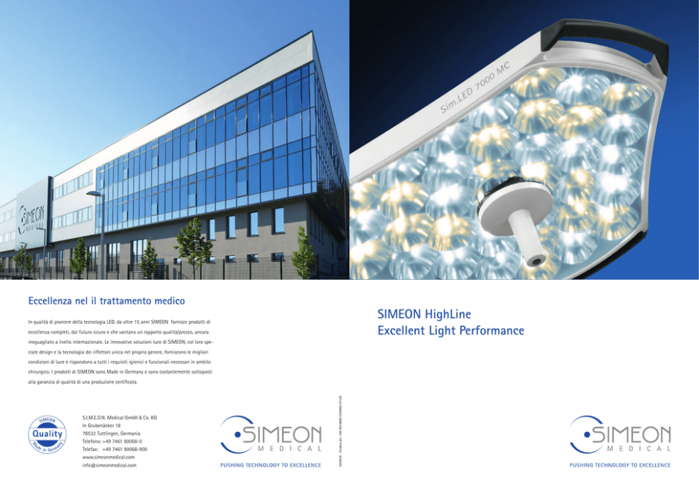 Eccellenza nel il trattamento medico SIMEON HighLine Excellent Light Performance In qualità di pioniere della tecnologia LED, da oltre 15 anni SIMEON fornisce prodotti di eccellenza completi, dal futuro sicuro e che vantano un rapporto qualità/prezzo, ancora ineguagliato a livello internazionale. Le innovative soluzioni luce di SIMEON, col loro speciale design e la tecnologia dei riflettori unica nel proprio genere, forniscono le migliori condizioni di luce e rispondono a tutti i requisiti igienici e funzionali necessari in ambito chirurgico. I prodotti di SIMEON sono Made in Germany e sono costantemente sottoposti S.I.M.E.O.N. Medical GmbH & Co. KG In Grubenäcker 18 78532 Tuttlingen, Germania Telefono:+49 7461 90068-0 Telefax: +49 7461 90068-900 www.simeonmedical.com [email protected] 03/2016 Codice art. 100-0013856 CO#003-01125 alla garanzia di qualità di una produzione certificata. SIMEON HighLine Sim.LED 7000, 5000 Elemento di spicco fra la lampade operatorie I compiti ardui richiedono soluzioni particolari. Le innovative lampade operatorie ●●Con le lampade HighLine Multicolor SIMEON è riuscita a sviluppare lampade ope- SIMEON HighLine offrono tutti i vantaggi della modernissima tecnologia LED in una ratorie con resa cromatica a valore costante ad ogni temperatura di colore. Ad una modalità dall’efficacia unica. Multicolour o singlecolour, il risultato è un riflettore temperatura di colore di 3.500, 4.000, 4.500, 5.000 o 5.500 kelvin, con la HighLine dalla tecnologia unica, dotato della massima potenza e delle migliori caratteristiche. Multicolour otterrete un Ra > 96 costante in ogni impostazione della temperatura SIMEON, fra i leader tecnologici in materia di LED per sala operatoria, è fra i produt- di colore tori più flessibili del mercato mondiale. L’eccezionale know-how della produzione di lampade operatorie viene coniugato all’innovazione. SIMEON è dunque in grado di fornire soluzioni di illuminazione e sistemi che si impongono come nuovo punto di riferimento e che presso gli altri produttori sono ancora in fase di studio. Ma guardate voi stessi. ●●Le lampade HighLine Singlecolor dotate dei nuovissimi LED monocromatici a luce bianca, forniscono la condizione di luce ideale in ogni situazione operatoria SIMEON HighLine – vantaggi lampanti Multicolor Selezionando una temperatura di colore di 3.500, 4.000, 4.500, 5.000 o 5.500 kelvin, con una SIMEON HighLine Multicolor otterrete in ogni impostazione un indice di resa cromatica costante di Ra > 96. Con la tecnologia sun.LED disporrete della luce migliore in ogni situazione. Illuminazione ottimale: campo luminoso ottimale e illuminazione a 360° rispettivamente con 108 e 72 LED, per un assorbimento di potenza minimo. 1.200 mm Massima efficienza energetica e gestione otti- Vetro di sicurezza ESG antigraffio resi- male del calore stente alla luce rendimento luminoso ideale con pochi LED e un garantisce una trasparenza della luce di colore: tutte regolabili con la massima semplicità attraverso il riflettore in alluminio; dissipazione termica ottima- ottimale per tutto il ciclo di vita della comando cardanico. L’impostazione preferita dal chirurgo può essere le grazie al supporto LED in alluminio, dissipazione lampada e condizioni igieniche ideali. facilmente salvata mediante la funzione di comando my.LED ed è immediata dei minimi sviluppi di calore nel corpo lampada in alluminio, al fine di minimizzare lo sviluppo di calore. Comando cardanico Intensità luminosa, dimensioni del campo luminoso e temperatura richiamabile premendo semplicemente un pulsante. Nuovissima tecnologia LED Design rivoluzionario. Assolutamente straordinaria. I nuovissimi LED Multicolor o Singlecolor, la tecnologia del riflettore brevettata e la disposizione dei LED secondo un design unico consentono di ottenere più luce senza ombra. Le lampade HighLine garantiscono alle operazioni l’illuminazione ottimale. Il minimo sviluppo di calore, la lunga durata utile ed il basso consumo energetico di queste lampade operatorie risultano accattivanti quanto la loro facilità di manutenzione. Anche per quanto riguarda l’igiene e la pulizia, le lampade HighLine stabiliscono nuovi standard grazie alla loro configurazione chiusa, senza soluzione di continuità, nonché al vetro di sicurezza ESG antigraffio facile da pulire. 5 anni di garanzia su Sim.POD Tecnologia del riflettore brevettata ● Sim.POD: tre LED SC o MC ad elevata intensità luminosa di ● Massima efficienza energetica e gestione ottimale del calore: nuovissima generazione al centro di un riflettore in alluminio rendimento luminoso ideale con pochi LED e un riflettore in ad alta specularità alluminio; dissipazione termica ottimale grazie al supporto ● Reflector Shadow Resolution System (RSRS) per una qualità LED in alluminio, dissipazione immediata dei minimi sviluppi della luce unica: l’ampia superficie di emissione della luce, il di calore nel corpo lampada in alluminio, al fine di minimiz- raggruppamento e la sovrapposizione ottimali dei fasci di luce zare lo sviluppo di calore consentono un’illuminazione ideale senza sistema di sensori né adattamento automatico del valore della luce ● Eccellenti valori di flusso laminare: grazie alla luce estremamente fredda, le turbolenze sul lato superiore ed inferiore del corpo lampada vengono ridotte al minimo ● Ra > 96 costante in ogni impostazione della temperatura di colore, grazie alla tecnologia sun.LED ● Controllo semplice di tutte le opzioni mediante comando cardanico Flessibilità dal futuro sicuro Design rivoluzionario ● Agevole implementazione in sistemi integrati mediante ● Il design a triangolo di SIMEON offre la massima superficie di Sim.INTERFACE ● Lunghissima durata utile ● Concetto intuitivo my.LED ● Ampliamento del sistema mediante telecamera Sim.CAM e sistemi a bracci porta monitor Sim.SCREEN ● Possibilità di successivi ampliamenti con Sim.FLEX ● Ecosostenibile in virtù della massima effi