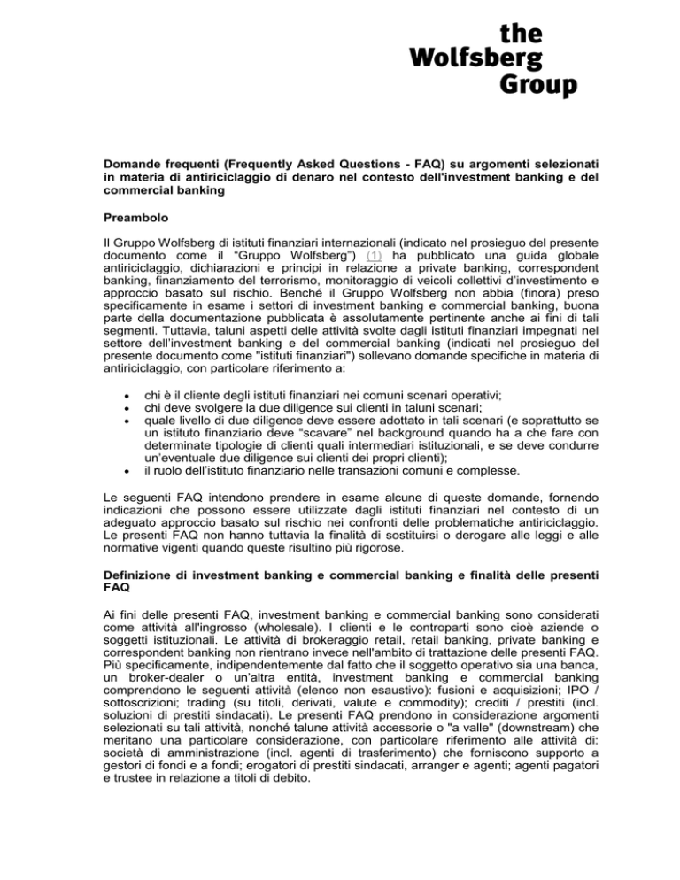Domande frequenti (Frequently Asked Questions - FAQ) su argomenti selezionati in materia di antiriciclaggio di denaro nel contesto dell'investment banking e del commercial banking Preambolo Il Gruppo Wolfsberg di istituti finanziari internazionali (indicato nel prosieguo del presente documento come il “Gruppo Wolfsberg”) (1) ha pubblicato una guida globale antiriciclaggio, dichiarazioni e principi in relazione a private banking, correspondent banking, finanziamento del terrorismo, monitoraggio di veicoli collettivi d’investimento e approccio basato sul rischio. Benché il Gruppo Wolfsberg non abbia (finora) preso specificamente in esame i settori di investment banking e commercial banking, buona parte della documentazione pubblicata è assolutamente pertinente anche ai fini di tali segmenti. Tuttavia, taluni aspetti delle attività svolte dagli istituti finanziari impegnati nel settore dell’investment banking e del commercial banking (indicati nel prosieguo del presente documento come "istituti finanziari") sollevano domande specifiche in materia di antiriciclaggio, con particolare riferimento a: • • • • chi è il cliente degli istituti finanziari nei comuni scenari operativi; chi deve svolgere la due diligence sui clienti in taluni scenari; quale livello di due diligence deve essere adottato in tali scenari (e soprattutto se un istituto finanziario deve “scavare” nel background quando ha a che fare con determinate tipologie di clienti quali intermediari istituzionali, e se deve condurre un’eventuale due diligence sui clienti dei propri clienti); il ruolo dell’istituto finanziario nelle transazioni comuni e complesse. Le seguenti FAQ intendono prendere in esame alcune di queste domande, fornendo indicazioni che possono essere utilizzate dagli istituti finanziari nel contesto di un adeguato approccio basato sul rischio nei confronti delle problematiche antiriciclaggio. Le presenti FAQ non hanno tuttavia la finalità di sostituirsi o derogare alle leggi e alle normative vigenti quando queste risultino più rigorose. Definizione di investment banking e commercial banking e finalità delle presenti FAQ Ai fini delle presenti FAQ, investment banking e commercial banking sono considerati come attività all'ingrosso (wholesale). I clienti e le controparti sono cioè aziende o soggetti istituzionali. Le attività di brokeraggio retail, retail banking, private banking e correspondent banking non rientrano invece nell'ambito di trattazione delle presenti FAQ. Più specificamente, indipendentemente dal fatto che il soggetto operativo sia una banca, un broker-dealer o un’altra entità, investment banking e commercial banking comprendono le seguenti attività (elenco non esaustivo): fusioni e acquisizioni; IPO / sottoscrizioni; trading (su titoli, derivati, valute e commodity); crediti / prestiti (incl. soluzioni di prestiti sindacati). Le presenti FAQ prendono in considerazione argomenti selezionati su tali attività, nonché talune attività accessorie o "a valle" (downstream) che meritano una particolare considerazione, con particolare riferimento alle attività di: società di amministrazione (incl. agenti di trasferimento) che forniscono supporto a gestori di fondi e a fondi; erogatori di prestiti sindacati, arranger e agenti; agenti pagatori e trustee in relazione a titoli di debito. Le FAQ di seguito riportate sono raggruppate sotto diversi punti: A. Beneficiari economici, intermediari istituzionali e fondi privati B. Transazioni generali di investment banking e commercial banking C. Prestiti sindacati, partecipazioni e trading D. Lettere di credito E. Altro: custodia, agenti pagatori e corporate trustee; agenti di escrow. Un approccio basato sul rischio Si prega di notare che, sebbene storicamente investment banking e commercial banking non siano stati considerati associati a rischi di riciclaggio, un istituto finanziario è tenuto comunque a valutare i propri clienti in termini di attività antiriciclaggio avvalendosi di un approccio basato sul rischio al fine di determinare il livello appropriato e il grado di due diligence (2) da applicare; le presenti FAQ sono incentrate sull’applicazione di un approccio basato sul rischio alle relazioni con i clienti, all’interazione con altre parti terze e alle transazioni eseguite dagli istituti finanziari. I fattori generalmente rilevanti per la valutazione del rischio dei clienti sono presi in esame nella Guida del Gruppo Wolfsberg ad un approccio basato sul rischio per la gestione dei rischi correlati al riciclaggio di denaro. Aspetti generali della gestione e del monitoraggio delle relazioni con i clienti Un istituto finanziario è tenuto a prendere in considerazione il ruolo dei propri relationship manager ai fini del processo di accettazione dei clienti. Un relationship manager può essere responsabile per il processo di accettazione di un particolare cliente ma non sempre può risultare opportuno che egli continui comunque ad essere responsabile per tale cliente se le attività che costui svolge con l’istituto finanziario cambiano nel corso del tempo. Inoltre, un cliente potrebbe essere presentato alla banca d’investimento o alla banca commerciale da un’altra unità operativa che ne ha originariamente già effettuato l’accettazione, e/o il relationship manager responsabile per un determinato aspetto delle attività del cliente potrebbe assumere un’altra funzione o posizione all’interno della banca. Peraltro, appare irrealistico ritenere che un singolo relationship manager possa monitorare tutte le attività che un cliente particolarmente grande o attivo a livello mondiale svolge attraverso un istituto internazionale o comunque di notevoli dimensioni. Piuttosto, in tali casi è probabile che vi siano diversi relationship manager che seguono contemporaneamente le attività di un singolo cliente all’interno di diverse unità operative o di prodotto della banca. L’istituto finanziario è chiamato a prend