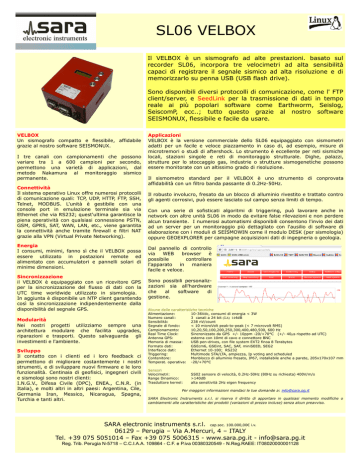 SL06 VELBOX Il VELBOX è un sismografo ad alte prestazioni. basato sul recorder SL06, incorpora tre velocimetri ad alta sensibilità capaci di registrare il segnale sismico ad alta risoluzione e di memorizzarlo su penna USB (USB flash drive). Sono disponibili diversi protocolli di comunicazione, come l' FTP client/server, e SeedLink per la trasmissione di dati in tempo reale ai più popolari software come Earthworm, Seislog, SeiscomP, ecc..; tutto questo grazie al nostro software SEISMONUX, flessibile e facile da usare. VELBOX Un sismografo compatto e flessibile, affidabile grazie al nostro software SEISMONUX. I tre canali con campionamenti che possono variare tra 1 a 600 campioni per secondo, permettono una varietà di applicazioni, dal metodo Nakamura al monitoraggio sismico permanente. Connettività Il sistema operativo Linux offre numerosi protocolli di comunicazione quali: TCP, UDP, HTTP, FTP, SSH, Telnet, MODBUS. L'unità è gestibile con una console port in emulazione terminale sia via Ethernet che via RS232; quest'ultima garantisce la piena operatività con qualsiasi connessione PSTN, GSM, GPRS, SAT, WAN, LAN, etc., viene garantita la connettività anche tramite firewall e filtri NAT grazie alla VPN (Virtual Private Networking). Energia I consumi, minimi, fanno sì che il VELBOX possa essere utilizzato in postazioni remote ed alimentato con accumulatori e pannelli solari di minime dimensioni. Sincronizzazione il VELBOX è equipaggiato con un ricevitore GPS per la sincronizzazione del flusso di dati con la UTC time worldwide utilizzato in sismologia. In aggiunta è disponibile un NTP client garantendo così la sincronizzazione indipendentemente dalla disponibilità del segnale GPS. Modularità Nei nostri progetti utilizziamo sempre una architettura modulare che facilita upgrades, riparazioni e trasporti. Questo salvaguarda gli investimenti e l'ambiente. Sviluppo Il contatto con i clienti ed i loro feedback ci permettono di migliorare costantemente i nostri strumenti, e di sviluppare nuovi firmware e le loro funzionalità. Centinaia di geofisici, ingegneri civili e sismologi sono nostri clienti: I.N.G.V., Difesa Civile (DPC), ENEA., C.N.R. (in Italia), e molti altri in altri paesi: Argentina, Cile, Germania Iran, Messico, Nicaragua, Spagna, Turchia e tanti altri. Applicazioni VELBOX è la versione commerciale dello SL06 equipaggiato con sismometri adatti per un facile e veloce piazzamento in caso di, ad esempio, misure di microtremori o studi di aftershock. Lo strumento è eccellente per reti sismiche locali, stazioni singole e reti di monitoraggio strutturale. Dighe, palazzi, strutture per lo stoccaggio gas, industrie o strutture sismogenetiche possono essere monitorate con un altissimo grado di risoluzione. Il sismometro standard per il VELBOX è uno strumento di conprovata affidabilità con un filtro banda passante di 0.2Hz-50Hz. Il robusto involucro, fresato da un blocco di alluminio rivestito e trattato contro gli agenti corrosivi, può essere lasciato sul campo senza limiti di tempo. Con una serie di sofisticati algoritmi di triggering, può lavorare anche in network con altre unità SL06 in modo da evitare false rilevazioni e non perdere alcun transiente. I numerosi automatismi disponibili consentono l'invio dei dati ad un server per un monitoraggio più dettagliato con l'ausilio di software di elaborazione con i moduli di SEISMOWIN come il modulo DESK (per sismologia) oppure GEOEXPLORER per campagne acquisizioni dati di ingegneria o geologia. Dal pannello di controllo via WEB browser è possibile controllare l'apparato in maniera facile e veloce. Sono possibili personalizzazioni sia all'hardware che al software di gestione. Alcune delle caratteristiche tecniche Alimentazione: 10-36Vdc, consumi di energia < 3W Numero canali: 3 canali a 24 bit (SD) 144dB Sensibilità: 238 nV/count Segnale di fondo: < 10 microVolt peak-to-peak (< 7 microvolt RMS) Campionamento: 10,20,50,100,200,250,300,400,480,500, 600 Hz Real Time Clock: Sincronizzato da GPS +/- 10ppm -20/+70°C (+/- 40ms rispetto ad UTC) Antenna GPS: esterna con 10mt di cavo e connettore BNC Memoria di massa: USB pen-drives, con file system EXT2 finoa 8 Terabytes Formato dati: GSEcm6, GSEint, SAC, SAF, miniSEED, SEG2 Interfacce dati: Ethernet 10-100; RS232 Triggering: Multimode STA/LTA, ampiezza, Ip voting and scheduled Contenitore: Monblocco di alluminio fresato, IP67, installabile anche a parete, 205x170x107 mm Temperat. operativa: -20/+70°C Sensori Velocimetri: Range Dinamico: Trasduttore kernel: SS02 sensore di velocità, 0.2Hz-50Hz (80Hz su richiesta) 400V/m/s >140dB alta sensitività 2Hz eigen frequency Per maggiori informazioni mandaci le tue domande a: [email protected] SARA Electronic Instruments s.r.l. si riserva il diritto di apportare in qualsiasi momento modifiche o cambiamenti alle caratteristiche dei prodotti (variazioni di prezzo incluse) senza alcun preavviso. SARA electronic instruments s.r.l. cap.soc. 100.000,00€ i.v. 06129 – Perugia – Via A.Mercuri, 4 – ITALY Tel. +39 075 5051014 – Fax +39 075 5006315 - www.sara.pg.it - [email protected] Reg. Trib. Perugia N-5718 – C.C.I.A.A. 109864 - C.F. e P.iva 00380320549 - N.Reg.RAEE: IT08020000001128