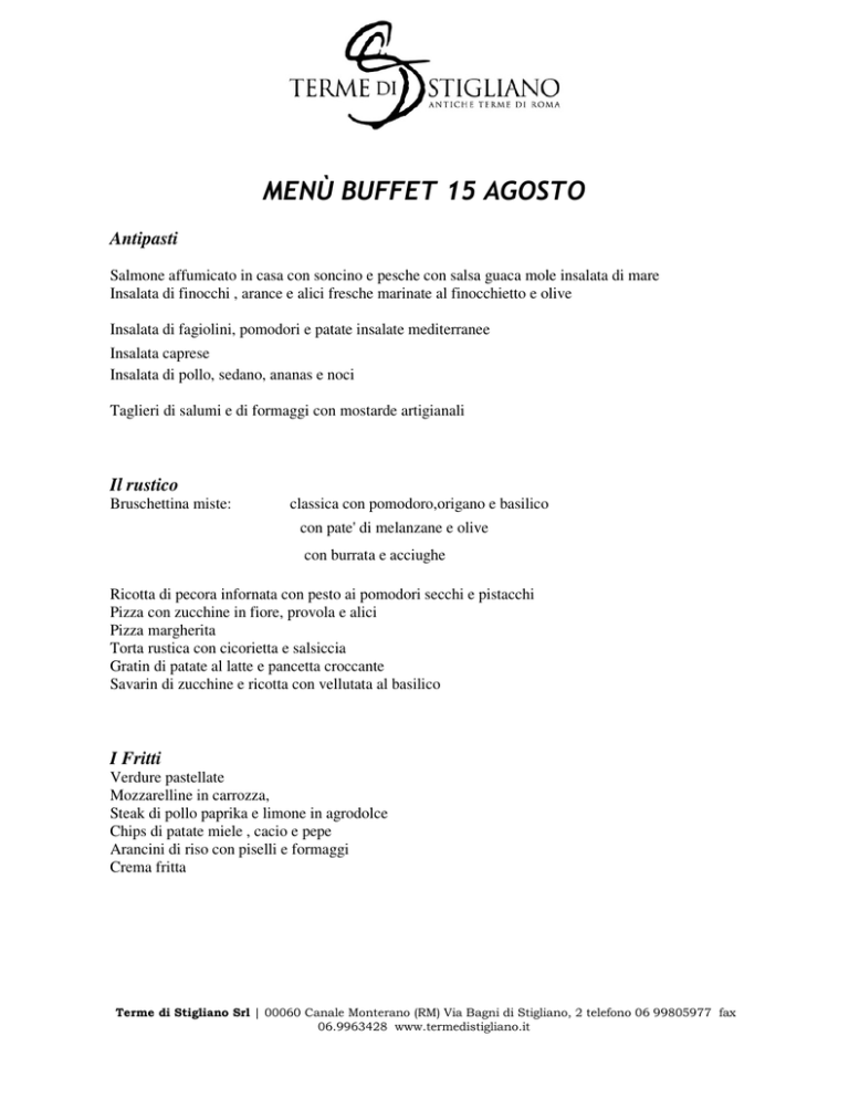 MENÙ BUFFET 15 AGOSTO Antipasti Salmone affumicato in casa con soncino e pesche con salsa guaca mole insalata di mare Insalata di finocchi , arance e alici fresche marinate al finocchietto e olive Insalata di fagiolini, pomodori e patate insalate mediterranee Insalata caprese Insalata di pollo, sedano, ananas e noci Taglieri di salumi e di formaggi con mostarde artigianali Il rustico Bruschettina miste: classica con pomodoro,origano e basilico con pate' di melanzane e olive con burrata e acciughe Ricotta di pecora infornata con pesto ai pomodori secchi e pistacchi Pizza con zucchine in fiore, provola e alici Pizza margherita Torta rustica con cicorietta e salsiccia Gratin di patate al latte e pancetta croccante Savarin di zucchine e ricotta con vellutata al basilico I Fritti Verdure pastellate Mozzarelline in carrozza, Steak di pollo paprika e limone in agrodolce Chips di patate miele , cacio e pepe Arancini di riso con piselli e formaggi Crema fritta Terme di Stigliano Srl | 00060 Canale Monterano (RM) Via Bagni di Stigliano, 2 telefono 06 99805977 fax 06.9963428 www.termedistigliano.it I Primi Gazpacho ghiacciato con le sue guarnizioni Lasagnetta vegetariano al pesto , provola e pomodorini Stringozzi con rugu' bianco, funghi e tartufo nero fresco Paccheri ,cozze e pecorino I Secondi Parmigiana di pesce Filetto di cernia con verdurine e salmoriglio caldo Arista di maiale steccata con albicocche fresche e pomodoro con salsa allo zenzero Roast beef con rucola, e parmigiano I Dolci Charlotte con crema chantilly, fragole e cioccolato Mousse di cioccolato con granella di nocciole Profiterole al caffe Cheese-Cake con gelatina di frutti di bosco Biscotteria tradizionale Frutta fresca Caffè €. 38,00 per persona iva inclusa bambini fino a 10 anni €. 25,00 p.p i.i. Terme di Stigliano Srl | 00060 Canale Monterano (RM) Via Bagni di Stigliano, 2 telefono 06 99805977 fax 06.9963428 www.termedistigliano.it