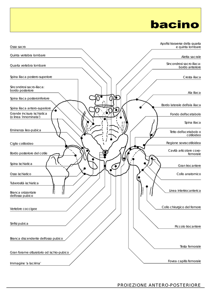 Osso sacro Apofisi trasverse della quarta e quinta lombare Quinta vertebra lombare Aletta sacrale Quarta vertebra lombare Sincondrosi sacro-iliaca: bordo anteriore Spina iliaca postero-superiore Sincondrosi sacro-iliaca: bordo posteriore Cresta iliaca Ala iliaca Spina iliaca posteroinferiore Spina iliaca antero-superiore Grande incisura ischiatica (o linea ‘innominata’) Bordo laterale dell'ala iliaca Fondo dell'acetabolo Spina iliaca Eminenza ileo-pubica Ciglio cotiloideo Bordo posteriore del cotile Spina ischiatica Osso ischiatico Tetto dell'acetabolo o cotiloideo Regione sovracotiloidea Cavità articolare coxofemorale Gran trocantere Collo anatomico Tuberosità ischiatica Branca orizzontale dell'osso pubico Vertebre coccigee Sinfisi pubica Linea intertrocanterica Collo chirurgico del femore Piccolo trocantere Branca discendente dell'osso pubico Testa femorale Gran forame otturatorio od ischio-pubico Immagine ‘a lacrima’ Fovea capitis femorale PROIEZIONE ANTERO-POSTERIORE Arco cervicootturatorio PROIEZIONE ANTERO-POSTERIORE