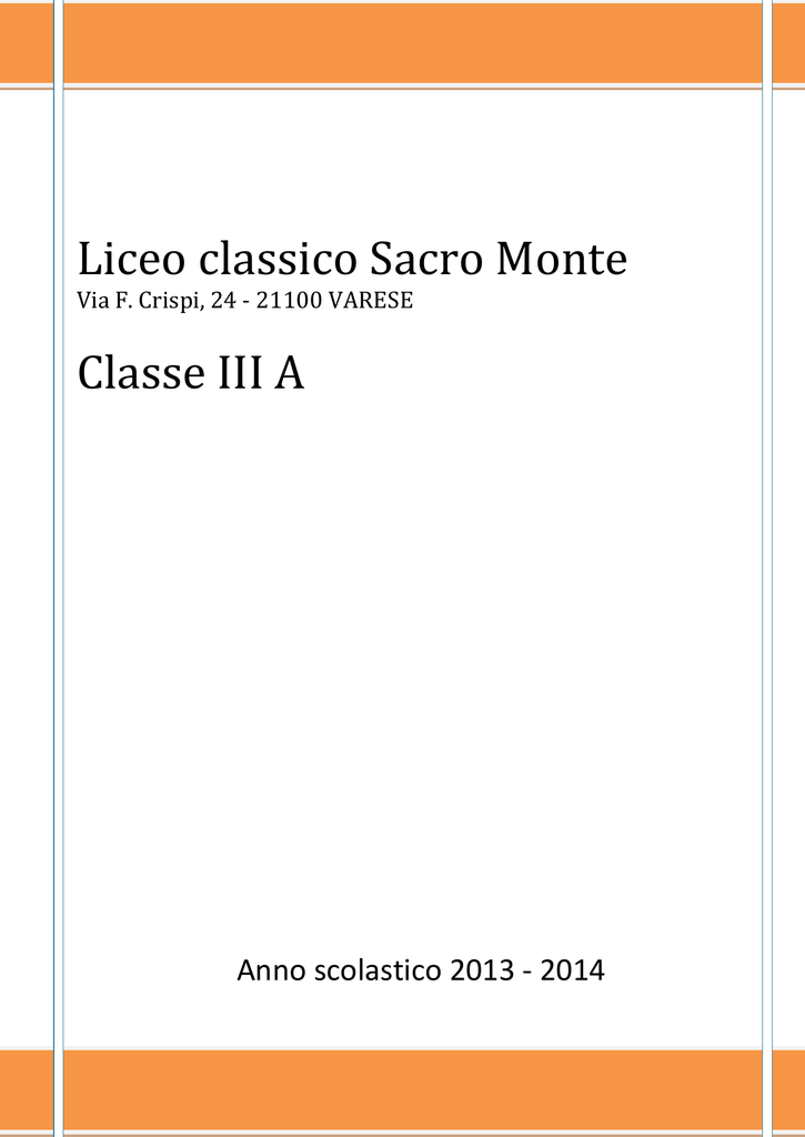Liceo classico Sacro Monte Via F. Crispi, 24 - 21100 VARESE Classe III A Anno scolastico 2013 - 2014 1 INDICE DEI CONTENUTI SEZIONE I: PARTE GENERALE Composizione del Consiglio di Classe pag. 3 Elenco dei Candidati pag. 4 Contesto educativo pag. 5 Profilo ed evoluzione della Classe dal punto di vista formativo pag. 6 Obiettivi comportamentali pag. 7 Obiettivi didattico-cognitivi pag. 7 Interdisciplinarità pag. 8 Attività integrative ed approfondimenti pag. 8 Orientamento postdiploma ed universitario pag. 9 Recupero e sostegno pag. 9 Criteri di attribuzione del credito formativo pag. 10 Criteri di valutazione (Griglie per Prove Scritte ed Orali) pag. 11 Attività in preparazione all'Esame di Stato pag. 14 Griglie di valutazione specifiche per le prove d'Esame pag. 15 SEZIONE II: PROGRAMMI SVOLTI DELLE SINGOLE DISCIPLINE Italiano pag. 17 Latino pag. 23 Greco pag. 26 Inglese pag. 29 Storia pag. 32 Filosofia pag. 34 Storia dell'Arte pag. 36 Matematica pag. 39 Fisica pag. 41 Scienze pag. 42 Educazione Fisica pag. 45 Religione pag. 46 2 COMPOSIZIONE DEL CONSIGLIO DI CLASSE COGNOME E NOME Prof. NOTE Musco Martina (italiano) Prof. Cervini Daniela (lat. e greco) _________________________ (M. Interno) Prof. Villa Paolo (Storia e Filosofia) Prof. Madeddu Stefania (Inglese) Prof. _________________________ _________________________ (M. Interno) Fraccaro Erika (Matematica e Fisica) _________________________ _________________________ Prof. Pozzi Camilla (Scienze) Prof. Bardelli Raffaella (Storia dell’arte) FIRMA _________________________ (M. Interno) _________________________ Prof. Basilico Nicola (Educazione fisica) _________________________ Prof. Riva don Simone (IRC) _________________________ 3 ELENCO DEI CANDIDATI OMISSIS 4 CONTESTO EDUCATIVO (dal POF) LA COOPERATIVA “SACRO MONTE” Il 12 gennaio 1993, in Varese, dodici insegnanti hanno dato vita alla Cooperativa “Sacro Monte”,con lo scopo di “organizzare e gestire corsi di istruzione secondaria, assumendo la veste di istituto legalmente riconosciuto” (art. 3 dello Statuto). Questa iniziativa è nata dalla passione per la propria professione e dalla volontà di mettere in comune ideali educativi, obiettivi e metodi didattici, al fine di realizzare una Scuola media superiore ispirata ai valori della religione cattolica. ISTITUZIONE DEI LICEI E STATUS DI SCUOLE PARITARIE Con l’anno scolastico 1993/1994 ha preso avvio la prima classe del Liceo Scientifico, comprendente un indirizzo linguistico (inglese e tedesco) e uno economico-aziendale. A partire dall’anno scolastico 1994/1995 è stata aperta una sezione di Liceo Classico. A decorrere dall’anno scolastico 2000/2001 il Liceo Scientifico ha ottenuto lo status di scuola paritaria (decreto M.P.I. del 26 gennaio 2001). Lo stesso è avvenuto per il Liceo Classico nell’anno scolastico 2002/2003 (decreto M.I.U.R. del 6 febbraio 2003). Attualmente sono in funzione il Liceo Classico e il Liceo Scientifico, quest’ultimo comprensivo dell’opzione delle Scienze applicate. PRINCIPI EDUCATIVI La proposta educativa del Liceo “Sacro Monte” si richiama a due centri ispiratori. Si tratta della Costituzione Italiana, con la sua proposta di valori universalmente condivisibili, e del modello etico-pedagogico di ispirazione cristiana. Dei principi che sono entrati a costituire la legge fondamentale dello Stato italiano, si condivide particolarmente il filone personalista. La presenza dei ragazzi costringe a proporre loro qualcosa di positivo e, per questo, ci sentiamo grati nei confronti della tradizione cristiana, grazie alla quale possiamo dire che la vita ha senso, e che questo senso è qualcosa da cercare personalmente e insieme, una ricerca che non è mai finita... IL LICEO CLASSICO Il Liceo Classico è la scuola della memoria e della cultura, in cui si apprende il piacere del sapere ed il gusto della lettura, una scuola tesa a conoscere la densità e la ricchezza del passato per meglio comprendere la complessità del presente. Attraverso uno studio particolarmente approfondito delle opere letterarie e figurative, dal mondo greco-romano fino ad oggi - che nella loro complessità documentano i grandi interrogativi sempre attuali posti dagli uomini d’ogni tempo riguardo il destino individuale e collettivo -, il Liceo Classico si propone di condurre lo studente alla scoperta del “bello”, delle proprie radici e dell’identità culturale del mondo occidentale, così da favorire la formulazione di una personale ipotesi esplicativa del reale, assieme alla capacità di approccio critico e di confronto con l’“altro”. Lo studente del Liceo Classico, in special modo, è condotto a far propri temi e problemi, approfondendo nessi e significati, traducendo così in senso stretto e in senso lato -, in modo corretto e personale, ciò che la tradizione gli offre attraverso le diverse discipline. Di seguito è riportato il quadro orario delle discipline nell'ultimo anno di corso: MATERIA ORE MATERIA ORE MATERIA ORE Religione 1 Inglese 3 Matematica 2 Italiano 4 Storia 3 Fisica 3 Latino 4 Filosofia 3 Scienze 2 Greco 3 Storia dell'Arte 2 Educazione Fisica 2 Totale: 32 ore settimanali 5 PROFILO ED EVOLUZIONE DELLA CLASSE DAL PUNTO DI VISTA FORMATIVO OMISSIS 6 OBIETTIVI COMPORTAMENTALI In conformità con quanto stabilito dal Collegio Docenti e contenuto nella Scheda di programmazione delle attività educative e didattiche, il consiglio di Classe ha stabilito i seguenti obiettivi: consolidare un atteggiamento personale di apertura alla realtà, senza pregiudizi e preconcetti; imparare a cogliere il punto di vista altrui; consolidare il processo di formazione di personalità coerenti ed equilibrate, dinamiche e aperte al nuovo, all’imprevisto; consolidare la presa di coscienza (e la prassi) dei propri diritti e dei propri doveri, come dell’impegno personale in funzione di un bene comune; rispettare le regole per quanto riguarda: comportamento (rispetto dei compagni, del personale della scuola, d