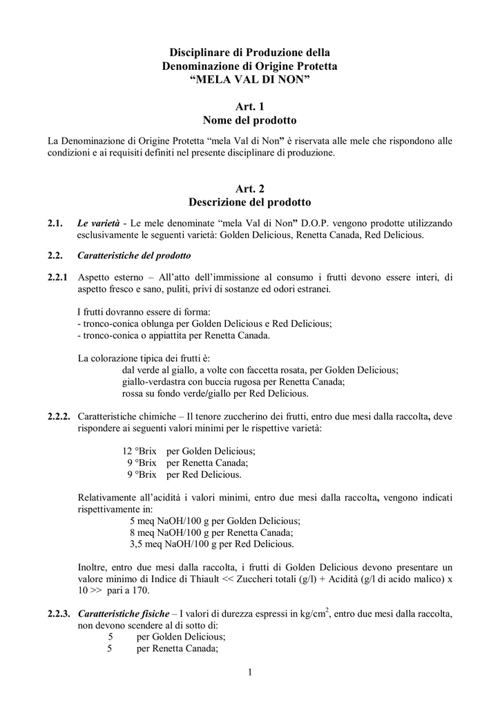 Disciplinare di Produzione della Denominazione di Origine Protetta “MELA VAL DI NON” Art. 1 Nome del prodotto La Denominazione di Origine Protetta “mela Val di Non” è riservata alle mele che rispondono alle condizioni e ai requisiti definiti nel presente disciplinare di produzione. Art. 2 Descrizione del prodotto 2.1. Le varietà - Le mele denominate “mela Val di Non” D.O.P. vengono prodotte utilizzando esclusivamente le seguenti varietà: Golden Delicious, Renetta Canada, Red Delicious. 2.2. Caratteristiche del prodotto 2.2.1 Aspetto esterno – All’atto dell’immissione al consumo i frutti devono essere interi, di aspetto fresco e sano, puliti, privi di sostanze ed odori estranei. I frutti dovranno essere di forma: - tronco-conica oblunga per Golden Delicious e Red Delicious; - tronco-conica o appiattita per Renetta Canada. La colorazione tipica dei frutti è: dal verde al giallo, a volte con faccetta rosata, per Golden Delicious; giallo-verdastra con buccia rugosa per Renetta Canada; rossa su fondo verde/giallo per Red Delicious. 2.2.2. Caratteristiche chimiche – Il tenore zuccherino dei frutti, entro due mesi dalla raccolta, deve rispondere ai seguenti valori minimi per le rispettive varietà: 12 °Brix per Golden Delicious; 9 °Brix per Renetta Canada; 9 °Brix per Red Delicious. Relativamente all’acidità i valori minimi, entro due mesi dalla raccolta, vengono indicati rispettivamente in: 5 meq NaOH/100 g per Golden Delicious; 8 meq NaOH/100 g per Renetta Canada; 3,5 meq NaOH/100 g per Red Delicious. Inoltre, entro due mesi dalla raccolta, i frutti di Golden Delicious devono presentare un valore minimo di Indice di Thiault << Zuccheri totali (g/l) + Acidità (g/l di acido malico) x 10 >> pari a 170. 2.2.3. Caratteristiche fisiche – I valori di durezza espressi in kg/cm2, entro due mesi dalla raccolta, non devono scendere al di sotto di: 5 per Golden Delicious; 5 per Renetta Canada; 1 5,5 per Red Delicious. 2.2.4. Calibro e categoria - La DOP "mela Val di Non" è riservata alle mele appartenenti alle categorie commerciali Extra e I^. Le caratteristiche minime di calibro sono indicate in 65 mm. I requisiti qualitativi minimi richiesti relativi alle diverse varietà, categorie, sono quelli stabiliti dalla normativa comunitaria, ai sensi del Reg. (CE) 920/1989 e successive modifiche. 2.2.5. Caratteristiche organolettiche – Le pregevoli caratteristiche organolettiche delle mele denominate “mela Val di Non” derivano dal giusto equilibrio dei parametri fisico-chimici sopra descritti. In particolare: - la Golden Delicious si distingue per la croccantezza e la succosità della polpa e per il peculiare sapore dolce-acidulo; - la Renetta Canada assume diversa consistenza e differenti sapori a seconda dell’epoca del consumo, passando da polpa croccante e decisamente acidula fino a polpa pastosa e dolce, mantenendo comunque forti connotati di specifica peculiarità organolettica; - la Red Delicious è caratterizzata da una polpa più pastosa e presenta un gusto prevalentemente dolciastro. Si riportano sinteticamente nella seguente tabella i parametri qualitativi per le mele denominate “mela Val di Non”, entro due mesi dalla raccolta. VARIETA’ Golden Delicious Renetta Canada Red Delicious ZUCCHERI ACIDITA’ °Brix (val. min.) meq NaOH/100 g (val. min.) Kg/cm2 (val. min.) Dal verde al giallo, a volte con 12 faccetta rosata 5 5 Giallo-verdastro rugginoso 8 5 3,5 5,5 COLORE 9 Rosso su fondo verde/giallo 9 DUREZZA Art. 3 Zona di produzione La zona di produzione della D.O.P. “mela Val di Non”, corrispondente al bacino idrografico del Torrente Noce ricadente nella Val di Sole e Val di Non, altrimenti chiamate Valli del Noce o Anaunia, è situata nella Provincia Autonoma di Trento. Tale zona, riferita alle relative Valli, come risulta dalla cartografia di riferimento, comprende l’intero territorio dei seguenti Comuni: Andalo, Amblar, Bresimo, Brez, Cagnò, Caldes, Campodenno, Castelfondo, Cavareno, Cavedago, Cavizzana, Cis, Cles, Cloz, Commezzadura, Coredo, Croviana, Cunevo, Dambel, Denno, Dimaro, Don, Flavon, Fondo, Livo, Malè, Malosco, Mezzana, Monclassico, Nanno, Ossana, Peio, Pellizzano, Rabbi, Revò, Romallo, Romeno, Ronzone, Ruffrè, Rumo, Sanzeno, Sarnonico, Sfruz, Smarano, Spormaggiore, Sporminore, Taio, Tassullo, Terres, Terzolas, Ton, Tres, Tuenno, Vermiglio, Vervò. 2 Art. 4 Elementi che comprovano l’origine 4.1. Riferimenti storici - Gli elementi che comprovano l’origine del prodotto sono costituiti da riferimenti storici che attestano la lunga tradizione frutticola di questo territorio. Questa si fa risalire a tempi molto antichi, come dimostrato anche dalla toponomastica (Malè deriva il suo nome dal latino Maletum, cioé “posto delle mele”, così come Malosco), oltre che dalle autorevoli fonti storiche (Carta di Regola del 1564 della Villa di Dardine e Carta di Regola di Cles del 1641). In una lettera del 1739 una nobile famiglia viene richiesta dell’invio a Vienna di un cesto di “pomi rosmarini”, già allora rinomati per l’eccellente qualità fin nella Capitale dell’Impero Asburgico. Dall’inizio del 1800 le fonti si fanno numerose e nella seconda metà del secolo i frutticoltori acquisiscono una nutrita serie di riconoscimenti e premi per la qualità della frutta portata alle esposizioni internazionali di quell’epoca. 4.2. Riferimenti culturali – Nella zona di produzione esistono numerose testimonianze pittoriche ed artistiche anche risalenti ad epoche pre-rinascimentali, che attestano l’importanza della mela nel contesto del territorio. Nutrita anche la produzione di forme poetiche dialettali dedicate alla mela ed alla produzione frutticola della valle. 4.3. Riferimenti sociali ed economici – Gli oltre 5000 produttori di “mela Val di Non”, organizzati prevalentemente nelle strutture cooperative di conservazione, lavorazione e vendita, insieme al cospicuo indotto economico derivante dalla gestione dei trasporti,