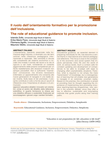 2016, VOL 12, N. 27, 14-28 CONTRIBUTO TEORICO Il ruolo dell’orientamento formativo per la promozione dell’inclusione. The role of educational guidance to promote inclusion. Iolanda Zollo, Università degli Studi di Salerno Erika Marie Pace, Università degli Studi di Salerno Filomena Agrillo, Università degli Studi di Salerno Maurizio Sibilio, Università degli Studi di Salerno ABSTRACT ITALIANO L’orientamento, elemento essenziale nella formazione degli individui, è diventato uno dei temi centrali nella riflessione pedagogica internazionale e nazionale. Tale centralità è dovuta alla complessità del sistema economico e sociale che investe il mondo del lavoro e la vita di ognuno a vari livelli, richiedendo un costante aggiornamento delle proprie competenze per un facile riadattamento alle situazioni mutevoli non sempre prevedibili. Non è sufficiente “trasmettere” conoscenze, ma diviene necessario (ri)fondare un apprendimento che consenta alle nuove generazioni di navigare in una realtà assai incerta. Sulla base di tali premesse, il presente contributo è volto a fornire alcuni spunti di riflessione circa l’importanza di attuare e di promuovere approcci educativo-didattici innovativi ed orientativi, ormai al centro del dibattito della letteratura scientifica, in quanto forniscono la chiave per una didattica efficace e sostenibile finalizzata ad accompagnare i giovani ungo i sentieri formativi. ABSTRACT INGLESE Educational guidance, an essential element in preparing individuals for life, has become a central theme in international and national pedagogical reflections. This focus is due to the complexity of the economic and social system that impacts pervasively one’s life and the world of work, at various levels. Such a context calls for constant updating and development of competences to be able to re-adapt with ease to changing, often unpredictable, situations. Therefore, what is required is not simply the mere "transmission" of knowledge, but a (re)organisation of learning that will enable new generations to navigate in an extremely uncertain reality. Based on this premise, this contribution is aimed at providing food for thought regarding the importance of implementing and promoting innovative teaching-learning programmes, now central in the scientific debate, since they offer a key to effective, sustainable and long-lasting methods that guide youths along their training paths. Parole chiave: Orientamento, Inclusione, Empowerment, Didattica, Semplessità Keywords: Educational Guidance, Inclusion, Empowerment, Didactics, Simplexity “Education is not preparation for life: education is life itself” John Dewey (1859-1952) Autore per la Corrispondenza: Iolanda Zollo, Dipartimento di Scienze Umane, Filosofiche e della Formazione (DISUFF),Università degli Studi di Salerno, via Giovanni Paolo II, 132, 84084 Fisciano (Salerno). E.mail: [email protected] 14 ZOLLO, PACE, AGRILLO E SIBILIO Introduzione Il punto di partenza del presente contributo è rappresentato da un’analisi dei principali documenti internazionali in tema di inclusione sociale; quest’ultima, a partire dal XXI secolo, è stata individuata dai policy maker come uno degli obiettivi prioritari per garantire uno sviluppo ed una crescita economica, sociale e ambientale sostenibile a livello globale (United Nations [UN], 2000; 2015) e per realizzare una società più sicura, più stabile e più giusta (Atkinson & Marlier, 2010). Difatti, il documento “Transforming Our World: The 2030 Agenda for Sustainable Development”(UN, 2015), riprendendo gli obiettivi di sviluppo del millennio fissati nel 2000 e stabilendone diciassette da raggiungere entro il 2030, fa riferimento al fatto che sradicare la povertà estrema ovunque e in tutte le sue forme, combattere le disuguaglianze tra e all’interno dei Paesi, preservare il pianeta, incentivare una crescita economica, duratura e sostenibile, promuovere l’inclusione sociale costituiscono strategie strettamente interconnesse e interdipendenti che necessitano di soluzioni integrate (UN, 2015). Tali obiettivi, rintracciabili nelle comunicazioni e nei piani d’azione delle politiche economiche, educative e sociali internazionali, europee e nazionali (Commissione delle Comunità Europee [CCE], 2005, 2006; European Commission [EC], 2010; European Parliament [EP], 2000; Ministero del Lavoro e delle Politiche Sociali [MLPS], 2003; Organisation for Economic Cooperation and Development [OECD], 2005, 2015), mirano ad assicurare ad ogni cittadino il raggiungimento di una migliore qualità della vita e di un benessere a livello individuale e comunitario (OECD, 2005; UN, 2015; World Health Organisation [WHO], 1986). Sulla base di quanto esplicitato finora e come emerge dall’analisi dei documenti presi in considerazione, l’educazione, in una società e in un’economia della conoscenza caratterizzate da una complessità che lascia poco spazio alla previsione e all’individuazione delle conoscenze necessarie ed indispensabili per il futuro (Morin, 1999a), ricopre un ruolo centrale. Sviluppare nelle generazioni più giovani il concetto di un apprendimento che perduri lungo tutto l’arco della vita (lifelong learning) è diventato un principio chiave (C.M. 15 aprile 2009 n. 43; EC, EACEA & Eurydice, 2012; OECD, 2005, 2015; The EP and the Council of the European Union, 2006;) per dare a tutti e a ciascuno la possibilità di prendere il controllo sulla propria vita e sulle proprie scelte, assicurando, in questo modo, che nessuno venga lasciato indietro. Anche se a livello nazionale, europeo e internazionale, grazie a considerevoli stanziamenti di risorse per vari progetti (1), si è fatta molta strada per favorire il lifelong learning, i livelli di abbandono scolastico, la percentuale di laureati in età tra i 30 e 34 anni e l’incidenza dei NEET (2), che sono gli indicatori ai quali si fa maggiormente riferimento per monitorare il benessere economico e sociale delle giovan