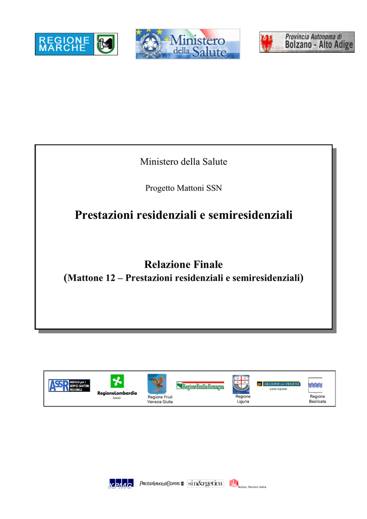 Ministero della Salute Progetto Mattoni SSN Prestazioni residenziali e semiresidenziali Relazione Finale (Mattone 12 – Prestazioni residenziali e semiresidenziali) RegioneFriuli VeneziaGiulia Regione Liguria Nolan, Norton Italia Regione Basilicata Mattoni SSN – Mattone 12 – Prestazioni Residenziali e Semiresidenziali RIFERIMENTI Redatto da: Società: Verificato da: Società: Approvato da: Data Gruppo di Lavoro Ristretto Enrico Brizioli Regione Marche Cabina di Regia 21 Febbraio 2007 Pag.2/80 Mattoni SSN – Mattone 12 – Prestazioni Residenziali e Semiresidenziali INDICE 1 INTRODUZIONE .................................................................................................................... 5 2 PRESTAZIONI RESIDENZIALI E SEMIRESIDENZIALI PER ANZIANI................... 6 2.1 DEFINIZIONE DI PRESTAZIONI RESIDENZIALI PER ANZIANI............................. 9 2.2 CRITERI DI ACCESSO E PERCORSI........................................................................... 10 2.3 CARATTERISTICHE TEMPORALI DELLA EROGAZIONE DELLE PRESTAZIONI......................................................................................................................... 10 2.3.1 Unità di misura .......................................................................................................... 10 2.3.2 Cadenza delle valutazioni .......................................................................................... 11 2.3.3 Durata del trattamento............................................................................................... 11 2.4 CARATTERISTICHE TECNICO-ORGANIZZATIVE DELLE STRUTTURE EROGATRICI .......................................................................................................................... 12 2.5 IL FLUSSO INFORMATIVO SUL “CASO TRATTATO”: I DATI RELATIVI ALLA PERSONA..................................................................................................................... 13 2.6 I LIVELLI DEL DEBITO INFORMATIVO ................................................................... 14 2.7 LA VALIDAZIONE DELLA FAR.................................................................................. 14 3 PRESTAZIONI RESIDENZIALI E SEMIRESINDENZIALI PER DISABILI ............. 15 3.1 PRESTAZIONI RESIDENZIALI DI RIABILITAZIONE ESTENSIVA ....................... 16 3.2 PRESTAZIONI RESIDENZIALI PER DISABILI.......................................................... 16 3.3 IL FLUSSO INFORMATIVO.......................................................................................... 17 4 PRESTAZIONI RESIDENZIALI E SEMIRESINDENZIALI PSICHIATRICHE........ 19 4.1 CLASSIFICAZIONE DELLE PRESTAZIONI RESIDENZIALI PSICHIATRICHE.... 20 4.2 FLUSSO INFORMATIVO E STRUMENTI DI RILEVAZIONE E DI VALUTAZIONE ...................................................................................................................... 21 5 BIBLIOGRAFIA.................................................................................................................... 22 6 ALLEGATI............................................................................................................................. 24 6.1 PRESTAZIONI RESIDENZIALI : CODICI DI ATTIVITÀ (DISCIPLINA)................. 24 6.2 SCHEDA INDIVIDUALE FLUSSO ASSISTENZA RESIDENZIALE (FAR) PER ANZIANI .................................................................................................................................. 27 6.2.1 Guida alla compilazione della scheda individuale FAR per anziani......................... 30 6.2.2 Specifiche per l’implementazione del flusso informativo della scheda FAR per anziani 32 6.3 SCHEDA INDIVIDUALE FLUSSO ASSISTENZA RESIDENZIALE E SEMIRESIDENZIALE PER DISABILI .................................................................................. 73 6.3.1 Guida alla compilazione della scheda individuale per disabili................................. 74 6.4 SCHEDA INDIVIDUALE FLUSSO ASSISTENZA RESIDENZIALE E SEMIRESIDENZIALE PER PERSONE CON PATOLOGIE PSICHIATRICHE.................. 76 6.4.1 Guida alla compilazione della scheda individuale per persone con patologie psichiatriche............................................................................................................................... 77 6.5 SCHEDA RUG CON MANUALE .................................................................................. 80 6.6 SCHEDA SOSIA CON MANUALE ............................................................................... 80 Pag.3/80 Mattoni SSN – Mattone 12 – Prestazioni Residenziali e Semiresidenziali 6.7 SCHEDA SVAMA CON MANUALE ............................................................................ 80 6.8 SCHEDA AGED CON MANUALE................................................................................ 80 Pag.4/80 Mattoni SSN – Mattone 12 – Prestazioni Residenziali e Semiresidenziali 1 INTRODUZIONE Il mandato assegnato al Mattone 12 è riferito allo costruzione di un flusso informativo delle prestazioni residenziali e semiresidenziali, adeguato ad alimentare in modo coerente il NSIS. La costruzione di un flusso informativo unitario e coerente presuppone la individuazione di modelli organizzativi uniformi, ai quali siano riferibili le singole prestazioni e/o attività. Nel settore residenziale si registra invece nelle diverse regioni una marcata variabilità dei modelli autorizzativi ed organizzativi, nonché delle modalità di erogazione del servizio, tali da imporre una ricognizione delle diverse tipologie di prestazioni e la loro riconduzione ad un modello unitario condiviso. E’ apparso inoltre necessario costruire un modello di correlazione tra prestazioni, livelli assistenziali, remunerazione degli erogatori, al fine di definire criteri omogenei di valutazione degli ambiti prestazionali. Sono stati quindi definiti i seguenti obiettivi: Definizione di un sistema di classificazione delle prestazioni e degli ambiti di erogazione; Definizione dei con