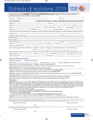 VS15_30-52_Layout 1 05/11/14 16:54 Pagina 49 Scheda di iscrizione 2015 Prenota e paga online! Vai su www.schoolandvacation.it – iscrizione online. Oppure compila la presente scheda di iscrizione in ogni sua parte e trasmettila per fax al numero 02/739.600.31 o via email a [email protected]. Allega la ricevuta di pagamento dell’acconto. La presente scheda di iscrizione costituisce contratto di viaggio. Spazio riservato WK .................................. DATI PERSONALI F ................................... Spazio riservato DA COMPILARE IN STAMPATELLO - INSERIRE I NOMI COMPLETI COME DA DOCUMENTO D’IDENTITÀ Cognome................................................................................................................. Nome.... Indirizzo ..................................................................................................................................................................... Città................................................................................. Prov.............. Sesso: F ❏ M ❏.... Tel casa. . N°..................... CAP Età ....................Data di nascita Cell. studente.............................................................Codice Fiscale Indicare malattie, allergie, diete speciali e/o problemi di salute in genere (è necessario allegare un certificato medico in presenza di serie patologie) Cognome e nome di un genitore.................................................................................................................. Tel uff. o cell E-mail studente E-mail genitore..................................................................................................................... Scuola frequentata.................................................................................................................................. Tel. scuola Indirizzo .......................................................................................N°........... CAP Città Nome insegnante di lingua ....................................................................... Come hai conosciuto School and Vacation? ❏ Internet ❏ Amici ❏ Scuola ❏ Insegnante di lingua ❏ Già partecipato ❏ Altro Dati documento di viaggio: è necessario indicare i dati del documento di viaggio che si utilizzerà per il viaggio al fine dell’emissione del biglietto aereo. Tipo documento: N° doc. Paese di emissione VACANZA STUDIO Data rilascio Data scadenza Nazionalità: PRESCELTA Partenza di gruppo ❏ Partenza individuale ❏ Destinazione............................................................................ Data partenza......................... Durata ❏ 2 settimane ❏ 3 settimane Sistemazione scelta: ❏ College/Residence ❏ Famiglia ❏ Int. Village/Villaggio/Hotel ❏ Desidero partire in gruppo dall’aeroporto di ❏ Milano ❏ Roma (cfr. Informazioni Pratiche a pag. 51 del presente catalogo) SERVIZI AGGIUNTIVI cfr. Informazioni Pratiche a pag. 51 del presente catalogo ❏ Desidero sottoscrivere la garanzia annullamento per malattia o bocciatura facoltativa al costo di € 90 ❏ Desidero sottoscrivere la garanzia annullamento facoltativa per debiti scolastici al costo di € 40 ❏ Desidero sostenere il Trinity Oral Examination / TIE (servizio disponibile previo raggiungimento del numero minimo di partecipanti) al costo di € 120 ❏ Desidero alloggiare con un amico/a (indicare il nome).... ❏ In famiglia desidero alloggiare con uno/a studente/ssa straniero/a (richiesta gratuita e soggetta a disponibilità) ❏ Desidero richiedere la dieta speciale (senza glutine/vegetariana). Per eventuale supplemento, contattare l’ufficio. PAGAMENTI ACCONTO: l’iscrizione alla vacanza studio SCHOOL and VACATION è ritenuta valida soltanto se accompagnata dal versamento dell’importo di 500 €, così composto: 390 € quale acconto; 110 € quali spese di apertura pratica. Per chi prenota entro il 20/12/2014 l’acconto può essere versato in due rate: 300 € entro il 20/12/2014, 200 € entro il 31/01/2015. Chi desidera sottoscrivere la garanzia annullamento per malattia o bocciatura (90 €) e/o la garanzia annullamento per debiti scolastici (40 €) dovrà corrispondere l’importo dell’acconto di € 500 o di € 300 maggiorato del costo di una o di entrambe le garanzie annullamento facoltative. Il pagamento, di cui si allega ricevuta, è stato effettuato tramite: ❏ pagamento online nella mia area riservata ❏ c/c postale n° 38111225 intestato a SCHOOL and VACATION s.r.l. ❏ Bonifico su c/c n° 8800 intestato a SCHOOL and VACATION s.r.l., presso Credito Valtellinese Sede Stelline: IT 86 R 052 16 01614 0000 0000 8800 N.B.: nella causale del pagamento dovrà essere obbligatoriamente indicato il nome dello studente partecipante e la destinazione prescelta. ❏ Assegno bancario o assegno circolare intestato a SCHOOL and VACATION s.r.l. consegnato a mano SALDO: il pagamento del saldo dovrà essere effettuato entro e non oltre trenta giorni prima della data stabilita per la partenza. Il sottoscritto dichiara di aver preso conoscenza delle condizioni generali riportate a pagina 50 del catalogo che costituiscono oggetto di trattativa privata e di approvare specificatamente le seguenti clausole: art. 3, art. 4, art. 5, art. 6, art. 7, art. 8, art. 11, art. 12, art. 13, art. 14, art. 15, art. 16, art. 17, art. 18, art. 19, art. 20 e art. 23. Ai sensi del D.lgs.196/03 acconsente al trattamento dei propri dati personali comuni e sensibili, il cui trattamento si dovesse rendere necessario per l'erogazione dei servizi concordati, compreso il loro trasferimento all’estero, anche verso paesi non appartenenti all’U.E. e secondo le indicazioni fornite nella ns. “Informativa al Trattamento Dati” riportata nelle “Condizioni Generali” del contratto, art. 26. FIRMA DEL PARTECIPANTE .............................................................. FIRMA DEL GENITORE DATA..........................................................