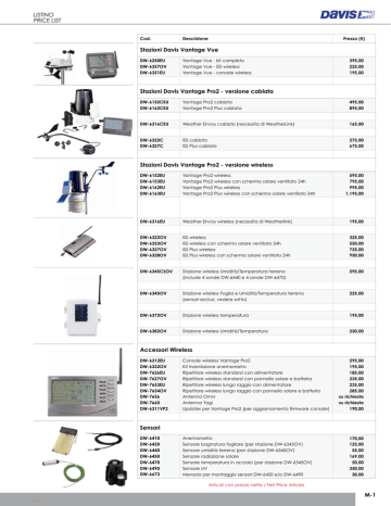 LISTINO PRICE LIST Cod. Descrizione Prezzo (€) Stazioni Davis Vantage Vue DW-6250EU DW-6357OV DW-6351EU Vantage Vue - kit completo Vantage Vue - ISS wireless Vantage Vue - console wireless 395,00 225,00 195,00 Stazioni Davis Vantage Pro2 - versione cablata DW-6152CEU DW-6162CEU Vantage Pro2 cablata Vantage Pro2 Plus cablata 495,00 895,00 DW-6316CEU Weather Envoy cablato (necessita di WeatherLink) 165,00 DW-6322C DW-6327C ISS cablato ISS Plus cablato 275,00 675,00 Stazioni Davis Vantage Pro2 - versione wireless DW-6152EU DW-6153EU DW-6162EU DW-6163EU Vantage Pro2 wireless Vantage Pro2 wireless con schermo solare ventilato 24h Vantage Pro2 Plus wireless Vantage Pro2 Plus wireless con schermo solare ventilato 24h DW-6316EU Weather Envoy wireless (necessita di Weatherlink) 195,00 DW-6322OV DW-6323OV DW-6327OV DW-6328OV ISS wireless ISS wireless con schermo solare ventilato 24h ISS Plus wireless ISS Plus wireless con schermo solare ventilato 24h 325,00 550,00 725,00 950,00 DW-6345CSOV Stazione wireless Umidità/Temperatura terreno (include 4 sonde DW-6440 e 4 sonde DW-6470) 595,00 DW-6345OV Stazione wireless Foglia e Umidità/Temperatura terreno (sensori esclusi, vedere sotto) 225,00 DW-6372OV Stazione wireless temperatura 195,00 DW-6382OV Stazione wireless Umidità/Temperatura 250,00 595,00 795,00 995,00 1.195,00 Accessori Wireless DW-6312EU DW-6332OV DW-7626EU DW-7627OV DW-7653EU DW-7654OV DW-7656 DW-7660 DW-6311VP2 Console wireless Vantage Pro2 Kit trasmissione anemometro Ripetitore wireless standard con alimentatore Ripetitore wireless standard con pannello solare e batteria Ripetitore wireless lungo raggio con alimentatore Ripetitore wireless lungo raggio con pannello solare e batteria Antenna Omni Antenna Yagi Updater per Vantage Pro2 (per aggiornamento firmware console) 295,00 195,00 185,00 235,00 235,00 285,00 su richiesta su richiesta 190,00 Sensori DW-6410 DW-6420 DW-6440 DW-6450 DW-6470 DW-6490 DW-6673 Anemometro Sensore bagnatura fogliare (per stazione DW-6345OV) Sensore umidità terreno (per stazione DW-6345OV) Sensore radiazione solare Sensore temperatura in acciaio (per stazione DW-6345OV) Sensore UV Mensola per montaggio sensori DW-6450 e/o DW-6490 170,00 125,00 55,00 169,00 50,00 350,00 30,00 Articoli con prezzo netto / Net Price Articles M-1 01-10 LISTINO PRICE LIST Cod. Descrizione Prezzo (€) Datalogger e Software DW-6555 WeatherLink IP (datalogger per invio dati su internet senza PC) 295,00 DW-6510SER DW-6510USB DW-6510X WeatherLink per Vantage Pro2, (per Windows, porta seriale) WeatherLink per Vantage Pro2, (per Windows, porta USB) Licenza aggiuntiva per Windows, valida per tutte le versioni 165,00 165,00 25,00 DW-6520C DW-6520X WeatherLink per Vantage Pro2, (per Mac OS X, porta USB) Licenza aggiuntiva per Mac OS X 165,00 25,00 DW-6540 WeatherLink per APRS con streaming datalogger (versione per Windows, porta seriale) 195,00 DW-6544 WeatherLink con Modulo Allarmi (versione per Windows, porta seriale) 295,00 DW-6550 WeatherLink per Emergenze con streaming datalogger (versione per Windows, porta seriale) 295,00 DW-6560 WeatherLink per controllo irrigazione con streaming datalogger (versione per Windows, porta seriale) 295,00 DW-6511 Modulo software per Agricoltura (richiede WeatherLink) 95,00 DW-6512 Modulo software allarme email/telefonico (richiede Weatherlink) 35,00 DW-6533 Adattatore modem telefonico per Vantage Pro2 10,00 DW-6510P SDK - Kit per sviluppo software su richiesta Altre stazioni Davis cablate e accessori DW-7400EU DW-7425EU Perception II Weather Wizard III 200,00 280,00 DW-7817 DW-7852 DW-7911 Sensore temperatura per Weather Wizard III Pluviometro per Weather Wizard III Anemometro per Weather Wizard III 26,00 95,00 170,00 DW-7862 WeatherLink per Perception II e Weather Wizard III (per Windows, porta seriale) Licenza aggiuntiva 165,00 WeatherLink per Perception II e Weather Wizard III (per Mac) Licenza aggiuntiva 165,00 DW-7862X DW-7855 DW-7855X Articoli con prezzo netto / Net Price Articles M-2 25,00 25,00 LISTINO PRICE LIST Cod. Descrizione Prezzo (€) Accessori di installazione DW-7720EU DW-7716 DW-7717 DW-7724 DW-7728 Riscaldatore per pluviometro Treppiede con palo di montaggio Palo di montaggio Box alloggiamento grande con staffe di montaggio e serratura (può contenere console, modem GSM, batteria) Box alloggiamento piccolo con staffe di montaggio e serratura (può contenere Weather Envoy e datalogger) 195,00 80,00 35,00 255,00 Schermo solare passivo Kit per trasf. in schermo ventilato ore diurne per Vantage Pro 2 85,00 135,00 95,00 Schermi Solari DW-7714 DW-7747 Kit alimentazione solare DW-6610 DW-7707 DW-7708 Kit alim. solare per Vantage Pro2 wireless o W.Envoy wireless Kit alim. solare per Vantage Pro2 cablata o W.Envoy cablato Kit alim. solare per sistemi integrati Vantage Pro2 + modem GSM 225,00 395,00 470,00 Protezioni Sovratensione DW-7767 DW-7768 Protezione da sovratensione (uno per coppia di conduttori) Box alloggiamento per protezione sovratensione 18,00 28,00 Modem GSM DW-W0165 DW-W0166 Kit Modem GSM con antenna, supporti e adattatore per WeatherLink Alimentatore di rete per Modem GSM 300,00 30,00 Radio UHF - Coppia radiomodem UHF Antenne per radiomodem su richiesta su richiesta Cavi di estensione standard DW-7876-008 DW-7876-040 DW-7876-100 DW-7876-200 DW-7880-025 DW-7880-050 DW-7880-100 DW-7959 Cavo standard a 4 conduttori, 2.4 m Cavo standard a 4 conduttori, 12 m Cavo standard a 4 conduttori, 30 m Cavo standard a 4 conduttori, 61 m Cavo standard a 8 conduttori, 7.5 m Cavo standard a 8 conduttori, 15 m Cavo standard a 8 conduttori, 30 m Connettore per cavo a 8 conduttori 15,00 25,00 50,00 90,00 22,00 37,00 65,00 7,00 Cavi di estensione schermati DW-7895-050 DW-7895-100 Cavo schermato a 4 conduttori, 15 m Cavo schermato a 4 conduttori, 30 m 36,00 66,00 Altri prodotti DW-131 DW-271 DW-271C DW-276 DW-281 DW-LD1000 Carta meteo-didattica Davis Turbo Meter Davis Turbo Meter con certificazione NIST Davis WindScribe Davis Wind Wizard Strike Al