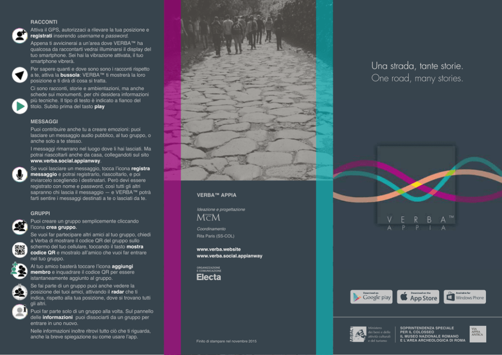 RACCONTI Attiva il GPS, autorizzaci a rilevare la tua posizione e registrati inserendo username e password. Appena ti avvicinerai a un’area dove VERBA™ ha qualcosa da raccontarti vedrai illuminarsi il display del tuo smartphone. Sei hai la vibrazione attivata, il tuo smartphone vibrerà. Una strada, tante storie. One road, many stories. Per sapere quanti e dove sono sono i racconti rispetto a te, attiva la bussola: VERBA™ ti mostrerà la loro posizione e ti dirà di cosa si tratta. Ci sono racconti, storie e ambientazioni, ma anche schede sui monumenti, per chi desidera informazioni più tecniche. Il tipo di testo è indicato a fianco del titolo. Subito prima del tasto play MESSAGGI Puoi contribuire anche tu a creare emozioni: puoi lasciare un messaggio audio pubblico, al tuo gruppo, o anche solo a te stesso. I messaggi rimarrano nel luogo dove li hai lasciati. Ma potrai riascoltarli anche da casa, collegandoti sul sito www.verba.social.appianway. Se vuoi lasciare un messaggio, tocca l’icona registra messaggio e potrai registrarlo, riascoltarlo, e poi inviarcelo scegliendo i destinatari. Però devi essere registrato con nome e password, così tutti gli altri sapranno chi lascia il messaggio ― e VERBA™ potrà farti sentire i messaggi destinati a te o lasciati da te. GRUPPI Puoi creare un gruppo semplicemente cliccando l’icona crea gruppo. Se vuoi far partecipare altri amici al tuo gruppo, chiedi a Verba di mostrare il codice QR del gruppo sullo schermo del tuo cellulare, toccando il tasto mostra codice QR e mostralo all’amico che vuoi far entrare nel tuo gruppo. Al tuo amico basterà toccare l’icona aggiungi membro e inquadrare il codice QR per essere istantaneamente aggiunto al gruppo. VERBA™ APPIA Ideazione e progettazione McM Studio ™ Coordinamento Rita Paris (SS-COL) www.verba.website www.verba.social.appianway ORGANIZZAZIONE E COMUNICAZIONE Se fai parte di un gruppo puoi anche vedere la posizione dei tuoi amici, attivando il radar che ti indica, rispetto alla tua posizione, dove si trovano tutti gli altri. Puoi far parte solo di un gruppo alla volta. Sul pannello delle informazioni puoi dissociarti da un gruppo per entrare in uno nuovo. Nelle informazioni inoltre ritrovi tutto ciò che ti riguarda, anche la breve spiegazione su come usare l’app. Finito di stampare nel novembre 2015 Ministero dei beni e delle attività culturali e del turismo SOPRINTENDENZA SPECIALE PER IL COLOSSEO IL MUSEO NAZIONALE ROMANO E L’AREA ARCHEOLOGICA DI ROMA VIA APPIA ANTICA LA VIA APPIA VERBA™ VERBA™ è una app per smartphone e tablet che ti immergerà in un universo di racconti audio localizzati sul territorio. Nasce per raccontare, in maniera semplice e coinvolgente, uno dei luoghi più straordinari al mondo: la Via Appia Antica. I sensori GPS localizzano la tua posizione, e trasmettono al tuo dispositivo le storie del luogo in cui ti trovi. E allora inizia il racconto. Puoi scegliere quale tipo di racconto ascoltare: non solo le descrizioni dei monumenti, ma anche storie di luoghi, eventi e personaggi legati alla Via Appia, dialoghi, fonti e testi d’autore. Ma c’è di più, molto di più. VERBA™ trasforma i luoghi in social network. Anche tu puoi lasciare un commento, un’emozione, o un suggerimento. E anche questi sono localizzati. Possono essere pubblici, condivisi con un gruppo, o privati. Si possono ascoltare quando si è vicini al punto dove sono stati lasciati. Torre Selce Mausoleo di Casal Rotondo Villa dei Quintili Santa Maria Nova Tumuli degli Orazi e dei Curiazii Sepolcro di Tiberio Claudio Secondo Sepolcro Dorico VERBA™ is an app for smartphones and tablets that will immerse you in a universe of audio stories localised to specific spots along the tour. VERBA™ has been created to offer a simple and fascinating way to discover one of the world’s most extraordinary places: the Appian Way. Capo di Bove Archivio Cederna GPS sensors determine your position and transmit stories to your mobile device about the place where you happened to be. And then the narration begins. With VERBA™ you are both the listener and the author, the protagonist of your visiting experience. For the first time in the world, a piece of cultural heritage has become a social network. For the first time in the world, a 2000-year-old stratification of events, adventures and stories merges with the impressions and emotions of visitors. The screen of your device will light up as soon as you approach an area where VERBA™ has something to tell you. Your smartphone or tablet will also vibrate if you have this function switched on. There are accounts, stories and scenic descriptions, but also info briefs on the monuments for those who want more technical information. The type of audio is shown next to the title, just before the play button. MESSAGES Per la prima volta al mondo, un bene culturale diventa un social network. Per la prima volta al mondo, una stratificazione bimillenaria di episodi, eventi e racconti si fonde con le impressioni e con le emozioni dei visitatori. VERBA™ also turns places into social networks. You, too, can leave a comment, emotion or suggestion. And these contributions are also localised. They can be public, private or shared with a group, and listened to when near the spot where they were recorded. Activate the GPS, allow us to determine your location and register by entering your username and password. Activate the compass to find out where and how many stories there are around your current position. VERBA™ will show you their location and tell you what they are about. Con VERBA™ sei ascoltatore e autore allo stesso tempo, protagonista della tua esperienza di visita. You can choose what type of story to listen to. Along with descriptions of the monuments, there are also stories about the places, events and characters connected to the Appian Way, as well as dialogues, sources and exclusive pieces by well-known authors. But that’s not all. STORIES Maus