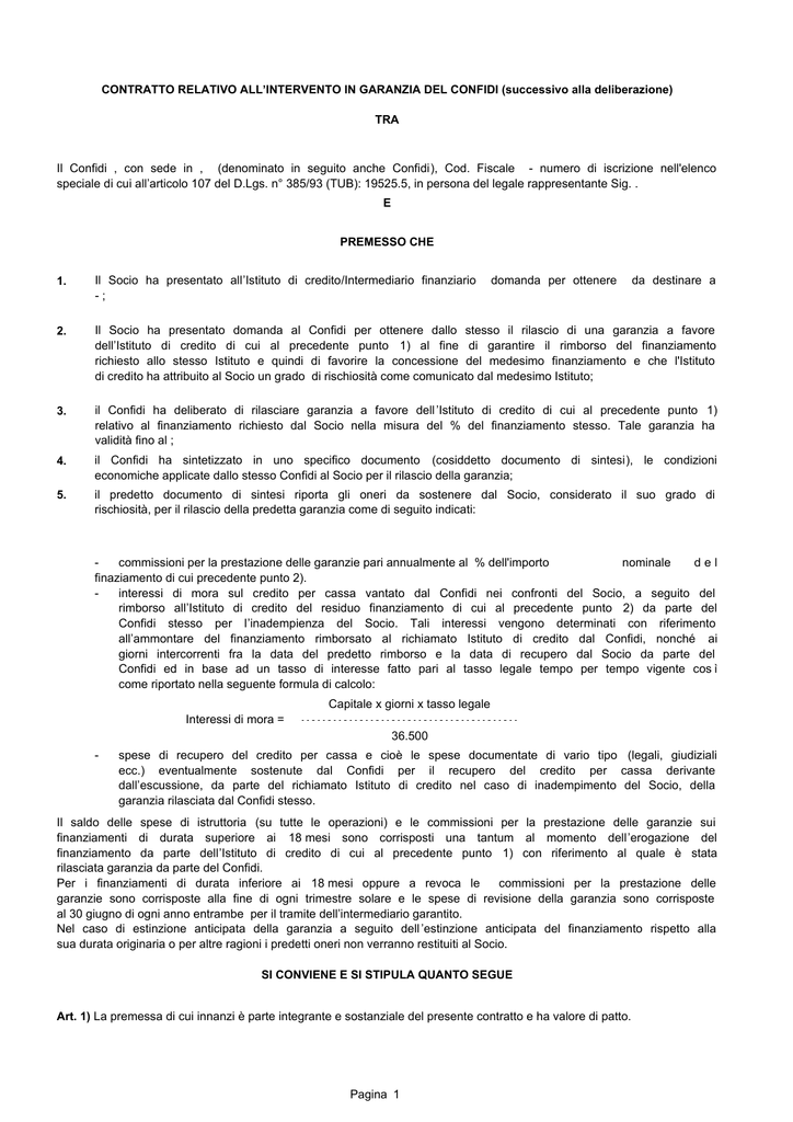 CONTRATTO RELATIVO ALL’INTERVENTO IN GARANZIA DEL CONFIDI (successivo alla deliberazione) TRA Il Confidi , con sede in , (denominato in seguito anche Confidi), Cod. Fiscale - numero di iscrizione nell'elenco speciale di cui all’articolo 107 del D.Lgs. n° 385/93 (TUB): 19525.5, in persona del legale rappresentante Sig. . E PREMESSO CHE 1. Il Socio ha presentato all’Istituto di credito/Intermediario finanziario -; domanda per ottenere da destinare a 2. Il Socio ha presentato domanda al Confidi per ottenere dallo stesso il rilascio di una garanzia a favore dell’Istituto di credito di cui al precedente punto 1) al fine di garantire il rimborso del finanziamento richiesto allo stesso Istituto e quindi di favorire la concessione del medesimo finanziamento e che l'Istituto di credito ha attribuito al Socio un grado di rischiosità come comunicato dal medesimo Istituto; 3. il Confidi ha deliberato di rilasciare garanzia a favore dell ’Istituto di credito di cui al precedente punto 1) relativo al finanziamento richiesto dal Socio nella misura del % del finanziamento stesso. Tale garanzia ha validità fino al ; 4. il Confidi ha sintetizzato in uno specifico documento (cosiddetto documento di sintesi), le condizioni economiche applicate dallo stesso Confidi al Socio per il rilascio della garanzia; 5. il predetto documento di sintesi riporta gli oneri da sostenere dal Socio, considerato il suo grado di rischiosità, per il rilascio della predetta garanzia come di seguito indicati: commissioni per la prestazione delle garanzie pari annualmente al % dell'importo nominale del finaziamento di cui precedente punto 2). interessi di mora sul credito per cassa vantato dal Confidi nei confronti del Socio, a seguito del rimborso all’Istituto di credito del residuo finanziamento di cui al precedente punto 2) da parte del Confidi stesso per l’inadempienza del Socio. Tali interessi vengono determinati con riferimento all’ammontare del finanziamento rimborsato al richiamato Istituto di credito dal Confidi, nonché ai giorni intercorrenti fra la data del predetto rimborso e la data di recupero dal Socio da parte del Confidi ed in base ad un tasso di interesse fatto pari al tasso legale tempo per tempo vigente cos ì come riportato nella seguente formula di calcolo: Capitale x giorni x tasso legale Interessi di mora = 36.500 - spese di recupero del credito per cassa e cioè le spese documentate di vario tipo (legali, giudiziali ecc.) eventualmente sostenute dal Confidi per il recupero del credito per cassa derivante dall’escussione, da parte del richiamato Istituto di credito nel caso di inadempimento del Socio, della garanzia rilasciata dal Confidi stesso. Il saldo delle spese di istruttoria (su tutte le operazioni) e le commissioni per la prestazione delle garanzie sui finanziamenti di durata superiore ai 18 mesi sono corrisposti una tantum al momento dell’erogazione del finanziamento da parte dell’Istituto di credito di cui al precedente punto 1) con riferimento al quale è stata rilasciata garanzia da parte del Confidi. Per i finanziamenti di durata inferiore ai 18 mesi oppure a revoca le commissioni per la prestazione delle garanzie sono corrisposte alla fine di ogni trimestre solare e le spese di revisione della garanzia sono corrisposte al 30 giugno di ogni anno entrambe per il tramite dell’intermediario garantito. Nel caso di estinzione anticipata della garanzia a seguito dell ’estinzione anticipata del finanziamento rispetto alla sua durata originaria o per altre ragioni i predetti oneri non verranno restituiti al Socio. SI CONVIENE E SI STIPULA QUANTO SEGUE Art. 1) La premessa di cui innanzi è parte integrante e sostanziale del presente contratto e ha valore di patto. Pagina 1 Art. 2) Il Confidi, una volta sottoscritto il presente contratto, provvederà a rilasciare all ’Istituto di credito di cui al precedente punto 1) della premessa la garanzia stessa nelle forme convenute con il medesimo Istituto di credito, che avrà efficacia solo se lo stesso Istituto di credito erogherà il finanziamento richiesto dal Socio. Il Confidi provvederà ad informare il Socio del rilascio della predetta garanzia. Art. 3) Il Socio provvederà a dare disposizione fin d'ora all'istituto di credito di cui al precedente punto 1) della premessa affinchè lo stesso provveda a dedurre al momento dell'erogazione del finanziamento, l'importo da riconoscere al Confidi relativamente agli oneri indicati al punto 5. Art. 4) Nel caso in cui l’Istituto di credito non dovesse, per qualsiasi ragione, erogare il finanziamento richiesto dal Socio, nonostante il rilascio della garanzia del Confidi, il Socio non sarà tenuto a riconoscere al Confidi le commissioni per la prestazione della garanzia. Art. 5) - - Per tutta la durata della garanzia prestata dal Confidi il Socio ha diritto: a ricevere comunicazioni sull’andamento della garanzia prestata dal Confidi almeno una volta l ’anno, mediante un rendiconto ed il documento di sintesi; a ottenere, a proprie spese, entro 90 giorni dalla richiesta e anche dopo la chiusura dell ’operazione digaranzia, copia della documentazione sugli interventi in garanzia effettuati dal Confidi degli ultimi dieci anni a favore del Socio stesso. Art. 6) Alla scadenza della garanzia prestata dal Confidi il Socio deve ricevere il rendiconto che attesta l’estinzione della garanzia e riepiloga l’evoluzione registrata dalla stessa dalla concessione all’estinzione. Art. 7) Il Socio ha diritto di recedere dal contratto previa liberatoria del Confidi stesso rilasciata dall ’Istituto di credito di cui al precedente punto 1) della premessa. In caso di recesso o di perdita di efficacia della garanzia rilasciata dal Confidi per estinzione anticipata del finanziamento garantito (sempre previa liberatoria del Confidi stesso rilasciata dal suddetto Istituto di credito) non è previsto alcun rimborso degli importi versati dal Socio al Confidi per spese di Istruttoria ed a titolo di c