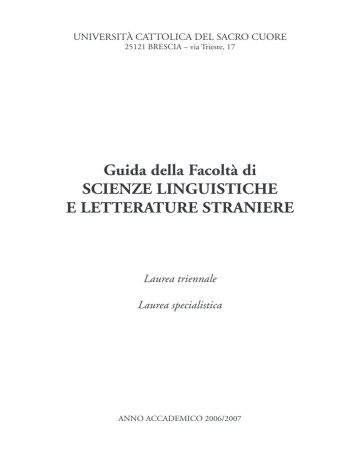 UNIVERSITÀ CATTOLICA DEL SACRO CUORE 25121 BRESCIA – via Trieste, 17 Guida della Facoltà di SCIENZE LINGUISTICHE E LETTERATURE STRANIERE Laurea triennale Laurea specialistica ANNO ACCADEMICO 2006/2007 INDICE Introduzione del Rettore ................................................................................pag. 9 Finalità e struttura dell’Università Cattolica del Sacro Cuore ......................... pag. 11 I percorsi di studio dopo la Riforma Universitaria .......................................... pag. 15 PRESENTAZIONE DELLA FACOLTÀ DI SCIENZE LINGUISTICHE E LETTERATURE STRANIERE ................. pag. 19 Laurea triennale in Scienze linguistiche Articolazione ..................................................................................................pag. Caratteri ......................................................................................................... pag. Piani di studio ................................................................................................ pag. Avvertenze ...................................................................................................... pag. Appendice I (piani di studio anteriori all’a.a. 2006/07) ................................... pag. 24 26 29 38 42 Laurea specialistica in Scienze linguistiche Modalità di accesso e articolazione ................................................................. pag. Piani di studio ................................................................................................ pag. Avvertenze ...................................................................................................... pag. Appendice II (piani di studio dall’a.a. 2005/06) ............................................. pag. 49 50 53 56 Elenco alfabetico degli insegnamenti dei corsi di laurea triennale e specialistica con relativo codice di settore scientifico disciplinare ......................................... pag. 58 Programmi dei corsi Laurea triennale 1.Lingua e letteratura francese - propedeutico (1° e 2° anno): Prof. Giuseppe Bernardelli ...................................................................... pag. 2.Lingua e letteratura francese – progredito (3° anno): Prof. Giuseppe Bernardelli ...................................................................... pag. 3.Lingua e linguistica francese (1° ELI, RI): Prof.ssa Simonetta Valenti .... pag. 4.Lingua e linguistica francese (2° ELI): Prof.ssa Maria Teresa Zanola ...... pag. 5.Lingua e linguistica francese (3° ELI): Prof.ssa Maria Teresa Zanola ...... pag. 6.Linguistica francese (annualisti): Prof.ssa Maria Teresa Zanola .............. pag. 7.Lingua e cultura cinese (1° ELI, RI): Proff. Chiara Piccinini, Pier Francesco Fumagalli ................................ pag. 8. Lingua e linguistica cinese (1° ELI, RI): Prof.ssa Chiara Piccinini ........... pag. 62 62 63 64 65 66 68 70 9.Lingua e letteratura inglese – propedeutico (1° e 2° anno): Prof. Francesco Rognoni ........................................................................ pag. 10.Lingua e letteratura inglese - progredito (3° anno): Prof. Francesco Rognoni ........................................................................ pag. 11.Lingua e linguistica inglese (1° ELI, RI): Prof.ssa Annalisa Zanola Macola ........................................................... pag. 12.Lingua e linguistica inglese (2° ELI): Prof.ssa Sonia Rachele Piotti ........ pag. 13.Lingua e linguistica inglese (3° ELI): Prof.ssa Sonia Rachele Piotti ........ pag. 14.Linguistica inglese (annualisti): Prof.ssa Mirella Agorni ......................... pag. 15.Lingua e letteratura russa: Prof. Adriano Dell’Asta ................................. pag. 16.Linguistica russa (annualisti, 1°, 2°, 3° ELI, RI): Prof.ssa Anna Bonola .............................................................................. pag. 17.Lingua e letteratura spagnola – propedeutico (1° e 2° anno): Prof. Ignacio Rodríguez de Arce ............................................................ pag. 18.Lingua e letteratura spagnola - progredito (3° anno) Prof. Ignacio Rodríguez de Arce ............................................................ pag. 19.Lingua e linguistica spagnola (1° ELI, RI): Prof.ssa Barbara Calafiore ....................................................................... pag. 20.Linguistica spagnola (annualisti, 2°, 3° ELI): Prof.ssa Sonia Bailini .......... pag. 21.Lingua e letteratura tedesca - propedeutico (1° e 2° anno): Prof.ssa Lucia Mor .................................................................................. pag. 22.Lingua e letteratura tedesca - progredito (3° anno): Prof.ssa Elena Raponi ............................................................................... pag. 23.Lingua e linguistica tedesca (1° ELI, RI): Prof.ssa Erika Nardon-Schmid ... pag. 24.Linguistica tedesca (annualisti, 2°, 3° ELI): Prof.ssa Alessandra Lombardi .................................................................. pag. 71 73 74 74 75 76 77 78 79 81 82 84 86 87 88 89 25.Diritto dell’economia: Prof. Roberto Belotti .......................................... pag. 90 26.Drammaturgia: Prof.ssa Laura Peja .......................................................... pag. 92 27.Economia aziendale: Prof. Paolo Bogarelli ............................................. pag. 93 28.Economia e gestione delle imprese turistiche: Prof. Giacomo Bailetti ............................................................................ pag. 95 29.Economia politica (Economia industriale): Prof.ssa Tiziana Tagliaferri ..................................................................... pag. 96 30.Filmologia: Prof. Francesco Casetti ....................................................... pag. 97 31.Fonetica e fonologia: Prof. Mario Baggio ................................................ pag. 98 32.Glottodidattica: Prof.ssa Erika Nardon-Schmid ...................................... pag. 99 33.