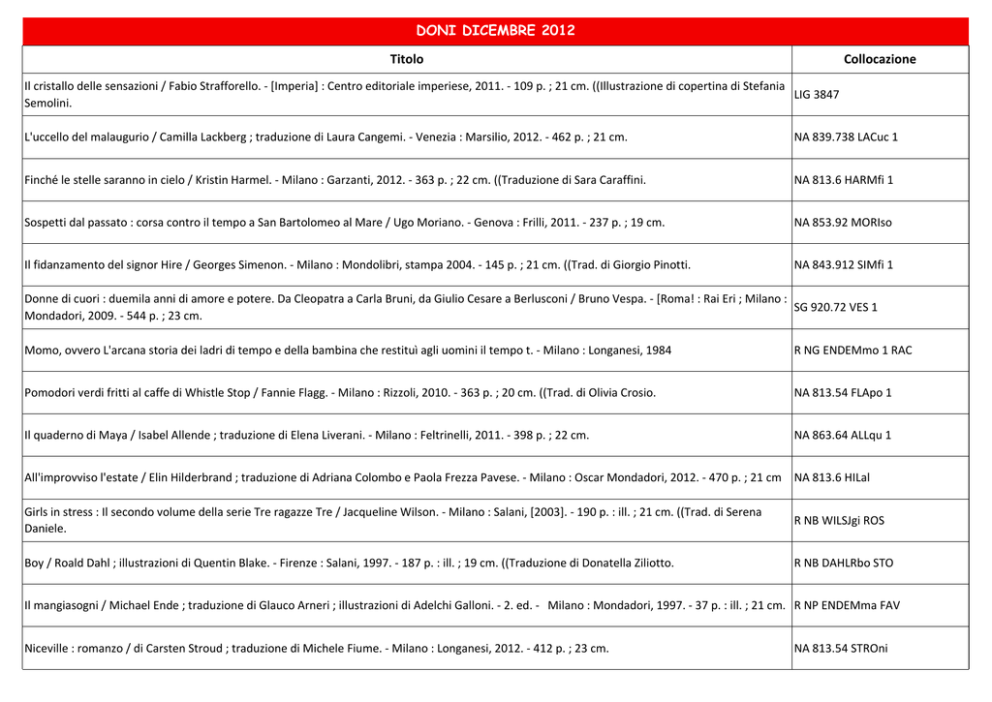 DONI DICEMBRE 2012 Titolo Collocazione Il cristallo delle sensazioni / Fabio Strafforello. - [Imperia] : Centro editoriale imperiese, 2011. - 109 p. ; 21 cm. ((Illustrazione di copertina di Stefania LIG 3847 Semolini. L'uccello del malaugurio / Camilla Lackberg ; traduzione di Laura Cangemi. - Venezia : Marsilio, 2012. - 462 p. ; 21 cm. NA 839.738 LACuc 1 Finché le stelle saranno in cielo / Kristin Harmel. - Milano : Garzanti, 2012. - 363 p. ; 22 cm. ((Traduzione di Sara Caraffini. NA 813.6 HARMfi 1 Sospetti dal passato : corsa contro il tempo a San Bartolomeo al Mare / Ugo Moriano. - Genova : Frilli, 2011. - 237 p. ; 19 cm. NA 853.92 MORIso Il fidanzamento del signor Hire / Georges Simenon. - Milano : Mondolibri, stampa 2004. - 145 p. ; 21 cm. ((Trad. di Giorgio Pinotti. NA 843.912 SIMfi 1 Donne di cuori : duemila anni di amore e potere. Da Cleopatra a Carla Bruni, da Giulio Cesare a Berlusconi / Bruno Vespa. - [Roma! : Rai Eri ; Milano : SG 920.72 VES 1 Mondadori, 2009. - 544 p. ; 23 cm. Momo, ovvero L'arcana storia dei ladri di tempo e della bambina che restituì agli uomini il tempo t. - Milano : Longanesi, 1984 R NG ENDEMmo 1 RAC Pomodori verdi fritti al caffe di Whistle Stop / Fannie Flagg. - Milano : Rizzoli, 2010. - 363 p. ; 20 cm. ((Trad. di Olivia Crosio. NA 813.54 FLApo 1 Il quaderno di Maya / Isabel Allende ; traduzione di Elena Liverani. - Milano : Feltrinelli, 2011. - 398 p. ; 22 cm. NA 863.64 ALLqu 1 All'improvviso l'estate / Elin Hilderbrand ; traduzione di Adriana Colombo e Paola Frezza Pavese. - Milano : Oscar Mondadori, 2012. - 470 p. ; 21 cm NA 813.6 HILal Girls in stress : Il secondo volume della serie Tre ragazze Tre / Jacqueline Wilson. - Milano : Salani, [2003]. - 190 p. : ill. ; 21 cm. ((Trad. di Serena Daniele. R NB WILSJgi ROS Boy / Roald Dahl ; illustrazioni di Quentin Blake. - Firenze : Salani, 1997. - 187 p. : ill. ; 19 cm. ((Traduzione di Donatella Ziliotto. R NB DAHLRbo STO Il mangiasogni / Michael Ende ; traduzione di Glauco Arneri ; illustrazioni di Adelchi Galloni. - 2. ed. - Milano : Mondadori, 1997. - 37 p. : ill. ; 21 cm. R NP ENDEMma FAV Niceville : romanzo / di Carsten Stroud ; traduzione di Michele Fiume. - Milano : Longanesi, 2012. - 412 p. ; 23 cm. NA 813.54 STROni Titolo Collocazione La bambina pericolosa / Silvana La Spina. - Milano : Mondadori, 2008. - 334 p. ; 23 cm. NA 853.914 LASba La favola di un sogno / Romano Battaglia. - Milano : Biblioteca universale Rizzoli, 2003. - 137 p. : ill. ; 22 cm. NA 853.914 BATfa Speciale Violante, ovvero L'orfana di Merignac / Bianca Pitzorno. - Milano : A. Mondadori, 1989. - 189 p. ; 21 cm. R NB PITZBsp ROS La foto di Adam / Myron Levoy ; traduzione di Francesca Crisigiovanni e Vittoria Viscardi. - Milano : A. Mondadori, 1992. - 163 p. ; 21 cm R NG LEVOMfo RAC Le sorelle della libertà / Roger J. Green ; traduzione di Ilva Tron. - Milano : A. Mondadori, 1994. - 142 p. ; 21 cm. R NB GREERJso RAC L'estate del soldato tedesco / Bette Greene ; traduzione di Chiara Arnone. - Milano : A. Mondadori, 1992. - 166 p. ; 21 cm R NB GREEBes ROS Una casa per Maggie / Robert Westall ; traduzione di Francesca Crisigiovanni e Vittoria Viscardi. - Milano : A. Mondadori, 1992. - 176 p. ; 21 cm. R NB WESTRca AVV Shiva / J. H. Brennan ; traduzione di Laura Cangemi. - Milano : A. Mondadori, 1991. - 139 p. ; 21 cm. R NB BRENJHsh ROS Capelli viola / Sandra Scoppettone ; traduzione di Chiara Belliti. - Milano : A. Mondadori, 1993. - 178 p. ; 21 cm. R NG SCOPSca ROS La canzone di Regina / Sally M. Keehn ; traduzione di Chiara Arnone. - Milano : A. Mondadori, 1993. - 174 p. ; 21 cm. R NB KEEHSMca MIT Il ritratto / Vivien Alcock ; traduzione di Gabriella Fiori. - Milano : A. Mondadori, 1992. - 154 p. ; 21 cm R NB ALCOVri RAC Storia di acque, di boschi, di popoli / Pablo Neruda ; a cura di Giuseppe Bellini. - Antella, \Bagno a Ripoli! : Passigli, ©1998. - 123 p. ; 18 cm. ((Scelta di racconti. NA 863.64 NERst La bambina che non voleva andare a dormire / di Pinin Carpi. - Trieste : E. Elle, ©1981. - 39 p. : ill. ; 18 cm. R NP CARPPba RAC Verso un'ecologia della mente / Gregory Bateson. - Nuova ed. ampliata. - Milano : Mondolibri, stampa 2000. - 604 p. ; 22 cm. DCONS 153.4 BAT Il mistero dell'Alef / Amir D. Aczel ; traduzione di Gianluigi Oliveri. - Milano : NET, 2005. - 220 p. ; 20 cm. SG 511.3 ACZ Titolo Le lacrime della salamandra / Peter Dickinson ; traduzione di Egle Costantino. - Milano : Mondadori, 2004. - 222 p. ; 20 cm. ((No BNI. Collocazione R NB DICKPla FAN Thérèse Raquin / Émile Zola ; introduzione di Mario Lunetta ; traduzione di Maurizio Grasso. - Ed. integrale. - Roma : Biblioteca economica Newton, NA 843.8 ZOLth 1995. - 192 p. ; 22 cm. Quello che ti meriti / Anne Holt. - Torino : Einaudi, [2008]. - 422 p ; 21 cm. ((Traduzione di Luca Lamberti. NA 839.82374 HOLqu 1 Romanzo criminale / Giancarlo De Cataldo. - Torino : Einaudi, 2002. - 632 p. ; 21 cm. NA 853.914 DECAro 1 L'isola dei dinosauri / Erminia Dell'Oro ; illustrazioni di Andrea Musso. - Casale Monferrato : Piemme junior, 2004. - 104 p. : ill. ; 19 cm R NP DELLEis AVV Il cammello che sapeva leggere : favole e racconti popolari del Mediterraneo / testi di Anselmo Rov. - Milano : Terre di mezzo, 2007 R NP ROVEAca MIT L'ecologia : i mille volti della vita / testo di Carlo Rondinini ; illustrazioni di Gian Paolo Faleschini. - Milano : A. Mondadori, [2000!. - 124 p. : ill. ; 20 cm. DRAG 577 RON L'isola dei Pokémon giganti / Adattamento di Tracey West. - Milano : Sperling & Kupfer, [2000!. - 85 p. : ill. ; 20 cm. ((Trad. di Antonella Marcora e Nicola Bartolini Carrassi. R NB POKis AVV Totodile, un nuovo amico / adattamento di Tracey West. - [Milano! : Sperling & Kupfer, [2002!. - 90 p. : ill. ; 19 cm. ((Trad. di Antonella Marcora. - In R NB POKtot AVV testa al front.: Pokemon, the Johto journeys. La torre della paura / adattamento di Tracey West. - Milano : Sperling & Kupfer, [2001]. - 83 p. : ill. ; 19 cm. ((Trad. di Antonella Marcora. R NB POKto AVV Scelgo te! : l