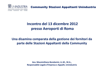 Community Stazioni Appaltanti Unindustria Incontro del 13 dicembre 2012 presso Aeroporti di Roma Una disamina comparata della gestione dei fornitori da parte delle Stazioni Appaltanti della Community Avv. Massimiliano Bondanini, LL.M., M.A., Responsabile Legale d’Impresa e Appalti, Unindustria Community Stazioni Appaltanti Unindustria SOGIN/1 VANTAGGI PRINCIPALI RISULTATI OTTENUTI Garanzia di un elevato standard di qualità Nuovi regolamenti di qualificazione (maggio 2011) Verifica preventiva dei requisiti Istituzione Elenco Operatori Economici su base locale (giugno 2011) Contrazione dei tempi di aggiudicazione Definizione di chiare regole a garanzia di una sana concorrenza Rispetto dei principi di par condicio e trasparenza Fornitori qualificati nel 2011: Albo Lavori: 48 Albo Servizi di Ingegneria: 12 Operatori Economici: 134 Community Stazioni Appaltanti Unindustria SOGIN/2 Processo di Vendor Rating: 2008: avvio 2011 passaggio alla gestione informatizzata Numeri: valutazione di circa 1.900 ordini COS’E’ Metodologia di classificazione delle aziende fornitrici basata sulla valutazione della loro affidabilità e della loro performance OBIETTIVO PRINCIPALE Miglioramento della qualità delle prestazioni delle imprese INTEGRAZIONE CON IL SISTEMA DI QUALIFICAZIONE Indirizzamento delle imprese qualificate verso azioni correttive POPOLAZIONE DI RIFERIMENTO Fornitori qualificati e non Community Stazioni Appaltanti Unindustria SOGIN/3 Valutazione dei fornitori 1) Efficacia 2) Efficienza 3) Qualità delle loro prestazioni Ogni tre mesi, Sogin assegna a ciascun operatore un indice di Vendor Rating (IVR) che verrà preso in considerazione ai fini della qualificazione. Calcolo dell'IVR La valutazione tecnica della prestazione del fornitore viene calcolata attraverso parametri di valutazione, ai quali corrisponde un punteggio che varia da 0 a 10. Ogni punteggio viene, successivamente, moltiplicato per il “peso” ponderale assegnato al parametro di riferimento. IVR = sommatoria punteggi assegnati ai parametri X per i loro pesi ponderali: INDICE VALUTAZIONE 9 < IVR < 10 OTTIMO 6 < IVR < 8,9 SUFFICIENTE – BUONO 5 < IVR < 5,9 INSUFFICIENTE 0 < IVR < 4,9 GRAVEMENTE INSUFFICIENTE Community Stazioni Appaltanti Unindustria SOGIN/4 Valutazione dei fornitori Effetti sul sistema di qualificazione Il valore dell'indice di Vendor Rating Sogin determina la valutazione della prestazione del fornitore: valutazioni positive: comunicate al fornitore; valutazioni non sufficienti e avvalorate da un numero significativo di eventi: effetti su: a) Revoca b) Sospensione Il sistema di Vendor Rating conclude, quindi, il processo del sistema di qualificazione dando una valutazione a valle della prestazione resa dal fornitore. Community Stazioni Appaltanti Unindustria ATAC/1 Vendor Rating / Obiettivi • Costruire una graduatoria oggettiva basata sull’“affidabilità” del fornitore in termini di puntualità e regolarità delle prestazioni rese e corrispondenza qualitativa della merce consegnata a quella richiesta • Acquisire dati oggettivi sulle performance in modo tale da monitorare nel tempo l’operato dei fornitori • Strutturare in maniera oggettiva i dati per favorire lo scambio di informazioni all’interno dell’azienda in relazione al ciclo di interazione tra il settore acquisti e i clienti interni • Attuare interventi penalizzanti verso i fornitori che non raggiungano un livello minimo di performance (es. decadenza dello stato di Qualifica del fornitore) Community Stazioni Appaltanti Unindustria ATAC/2 Vendor Rating / perimetro e modelli di valutazione • Il perimetro d’analisi : fornitori di ricambistica per autobus e tram • Criteri base dell’analisi dei possibili modelli di valutazione: - Forte correlazione con le penali applicate - Ricerca di un modello A) che soddisfi le esigenze di conformità su diversi assi (Tempo, Quantità e Qualità) e B) che consideri l’eterogeneità dei fornitori • Dimensioni considerate: Tempo (analisi dei ritardi) Quantità (materiale consegnato vs. ordinato) Qualità (analisi delle contestazioni qualitative) Community Stazioni Appaltanti Unindustria ATAC/3 Vendor Rating / indici complessivi 1) Non Completezza % ponderata: • Indicatore del comportamento del Fornitore rispetto alla affidabilità sui volumi attesi • Totale delle Posizioni non completate / Totale delle posizioni nel periodo 2) Ritardi %: • Indicatore dell’incidenza dei ritardi rispetto a quanto atteso • Totale Consegne in ritardo per fascia di gg di ritardo/ Totale Consegne attese 3) Contestazioni qualitative: • Indicatore dell’ incidenza delle contestazioni per fascia sul numero di OdA ricevuti • Totale contestazioni emerse nel periodo considerato valutate per fascia di numerosità di OdA ricevuti nel biennio precedete alla valutazione Community Stazioni Appaltanti Unindustria ACEA/1 Tipologie di sistemi di qualificazione 10 sistemi di qualificazione per classi merceologiche definite da 1) strategicità e 2) 2) ricorrenza nell’acquisto Ogni sistema comprende più tipologie con specifici albi, suddivisi in classi d’interpello da a) Importo economico (lavori) b) Caratteristiche tecniche (forniture) • 2 di lavori, area Energia (7 albi) e area Idrico-elettromeccanica (6 albi) • 6 di forniture • 2 di servizi Community Stazioni Appaltanti Unindustria ACEA/2 2011: Istituzione di un ufficio qualificazione fornitori distinto dall’Ufficio Acquisti Creazione di un sistema di vendor management Principi • • • Utilizzo degli albi per il 100% delle classi merceologiche Semplificazione dei processi di qualificazione e gestione albi Adozione di una piattaforma informatica a idonea a maggiori volumi Obiettivi • • • • Snellimento processo di acquisto anche pe ril sopra soglia Maggior controllo del parco fornitori Incremento della concorrenza Verifica e monitoraggio operatori economici iscritti sotto il prpofilo dell’affidabilità tecnica, ambientale, di sicurezza, c