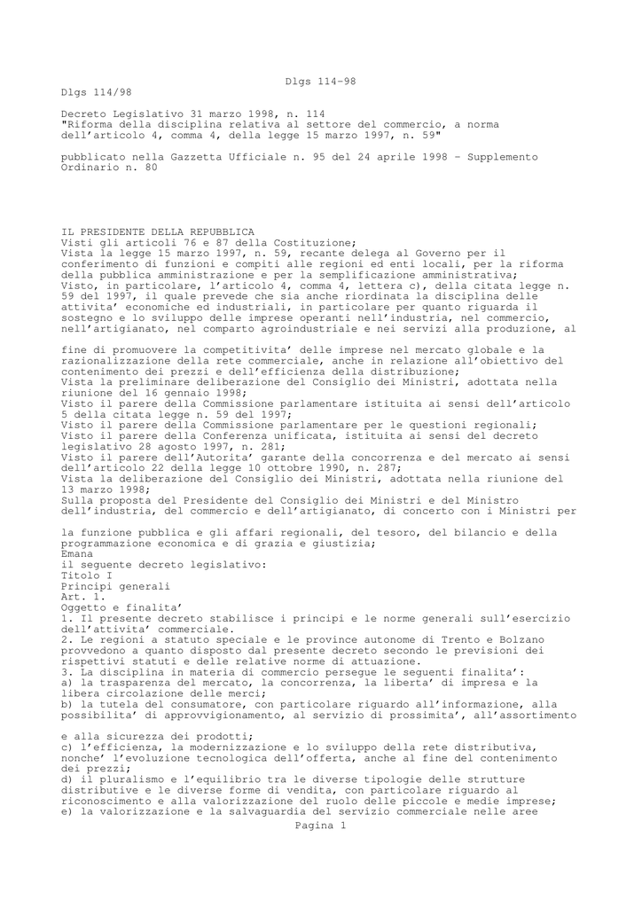 Dlgs 114/98 Dlgs 114-98 Decreto Legislativo 31 marzo 1998, n. 114 "Riforma della disciplina relativa al settore del commercio, a norma dell’articolo 4, comma 4, della legge 15 marzo 1997, n. 59" pubblicato nella Gazzetta Ufficiale n. 95 del 24 aprile 1998 - Supplemento Ordinario n. 80 IL PRESIDENTE DELLA REPUBBLICA Visti gli articoli 76 e 87 della Costituzione; Vista la legge 15 marzo 1997, n. 59, recante delega al Governo per il conferimento di funzioni e compiti alle regioni ed enti locali, per la riforma della pubblica amministrazione e per la semplificazione amministrativa; Visto, in particolare, l’articolo 4, comma 4, lettera c), della citata legge n. 59 del 1997, il quale prevede che sia anche riordinata la disciplina delle attivita’ economiche ed industriali, in particolare per quanto riguarda il sostegno e lo sviluppo delle imprese operanti nell’industria, nel commercio, nell’artigianato, nel comparto agroindustriale e nei servizi alla produzione, al fine di promuovere la competitivita’ delle imprese nel mercato globale e la razionalizzazione della rete commerciale, anche in relazione all’obiettivo del contenimento dei prezzi e dell’efficienza della distribuzione; Vista la preliminare deliberazione del Consiglio dei Ministri, adottata nella riunione del 16 gennaio 1998; Visto il parere della Commissione parlamentare istituita ai sensi dell’articolo 5 della citata legge n. 59 del 1997; Visto il parere della Commissione parlamentare per le questioni regionali; Visto il parere della Conferenza unificata, istituita ai sensi del decreto legislativo 28 agosto 1997, n. 281; Visto il parere dell’Autorita’ garante della concorrenza e del mercato ai sensi dell’articolo 22 della legge 10 ottobre 1990, n. 287; Vista la deliberazione del Consiglio dei Ministri, adottata nella riunione del 13 marzo 1998; Sulla proposta del Presidente del Consiglio dei Ministri e del Ministro dell’industria, del commercio e dell’artigianato, di concerto con i Ministri per la funzione pubblica e gli affari regionali, del tesoro, del bilancio e della programmazione economica e di grazia e giustizia; Emana il seguente decreto legislativo: Titolo I Principi generali Art. 1. Oggetto e finalita’ 1. Il presente decreto stabilisce i principi e le norme generali sull’esercizio dell’attivita’ commerciale. 2. Le regioni a statuto speciale e le province autonome di Trento e Bolzano provvedono a quanto disposto dal presente decreto secondo le previsioni dei rispettivi statuti e delle relative norme di attuazione. 3. La disciplina in materia di commercio persegue le seguenti finalita’: a) la trasparenza del mercato, la concorrenza, la liberta’ di impresa e la libera circolazione delle merci; b) la tutela del consumatore, con particolare riguardo all’informazione, alla possibilita’ di approvvigionamento, al servizio di prossimita’, all’assortimento e alla sicurezza dei prodotti; c) l’efficienza, la modernizzazione e lo sviluppo della rete distributiva, nonche’ l’evoluzione tecnologica dell’offerta, anche al fine del contenimento dei prezzi; d) il pluralismo e l’equilibrio tra le diverse tipologie delle strutture distributive e le diverse forme di vendita, con particolare riguardo al riconoscimento e alla valorizzazione del ruolo delle piccole e medie imprese; e) la valorizzazione e la salvaguardia del servizio commerciale nelle aree Pagina 1 Dlgs 114-98 urbane, rurali, montane, insulari. Art. 2. Liberta’ di impresa e libera circolazione delle merci 1. L’attivita’ commerciale si fonda sul principio della liberta’ di iniziativa economica privata ai sensi dell’articolo 41 della Costituzione ed e’ esercitata nel rispetto dei principi contenuti nella legge 10 ottobre 1990, n. 287, recante norme per la tutela della concorrenza e del mercato. Art. 3. Obbligo di vendita 1. In conformita’ a quanto stabilito dall’articolo 1336 del codice civile, il titolare dell’attivita’ commerciale al dettaglio procede alla vendita nel rispetto dell’ordine temporale della richiesta. Art. 4. Definizioni e ambito di applicazione del decreto 1. Ai fini del presente decreto si intendono: a) per commercio all’ingrosso, l’attivita’ svolta da chiunque professionalmente acquista merci in nome e per conto proprio e le rivende ad altri commercianti, all’ingrosso o al dettaglio, o ad utilizzatori professionali, o ad altri utilizzatori in grande. Tale attivita’ puo’ assumere la forma di commercio interno, di importazione o di esportazione; b) per commercio al dettaglio, l’attivita’ svolta da chiunque professionalmente acquista merci in nome e per conto proprio e le rivende, su aree private in sede fissa o mediante altre forme di distribuzione, direttamente al consumatore finale; c) per superficie di vendita di un esercizio commerciale, l’area destinata alla vendita, compresa quella occupata da banchi, scaffalature e simili. Non costituisce superficie di vendita quella destinata a magazzini, depositi, locali di lavorazione, uffici e servizi; d) per esercizi di vicinato quelli aventi superficie di vendita non superiore a 150 mq. nei comuni con popolazione residente inferiore a 10.000 abitanti e a 250 mq. nei comuni con popolazione residente superiore a 10.000 abitanti; e) per medie strutture di vendita gli esercizi aventi superficie superiore ai limiti di cui al punto d) e fino a 1.500 mq nei comuni con popolazione residente inferiore a 10.000 abitanti e a 2.500 mq. nei comuni con popolazione residente superiore a 10.000 abitanti; f) per grandi strutture di vendita gli esercizi aventi superficie superiore ai limiti di cui al punto e); g) per centro commerciale, una media o una grande struttura di vendita nella quale piu’ esercizi commerciali sono inseriti in una struttura a destinazione specifica e usufruiscono di infrastrutture comuni e spazi di servizio gestiti unitariamente. Ai fini del presente decreto per superficie di vendita di un centro commerciale si intend