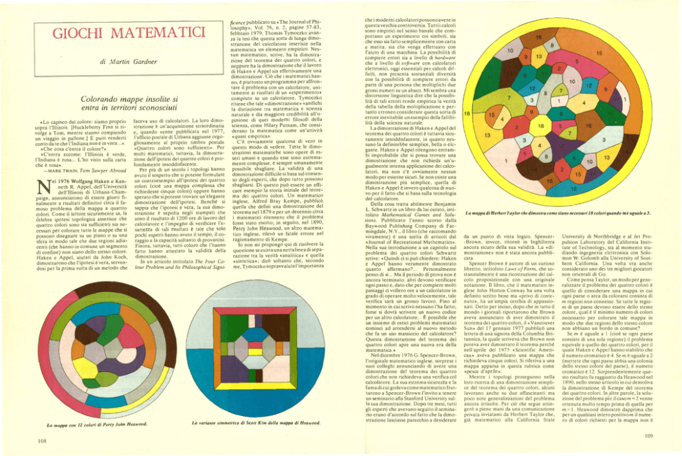 ficance pubblicato su «The Journal of Phi GIOCHI MATEMA TICI di Martin Gardner Colorando mappe insolite si entra in territori sconosciuti «Lo capisco dal colore: siamo proprio sopra l'Illinois. [Huckleberry Finn si ri volge a Tom, mentre stanno compiendo un viaggio in pallone.] E puoi renderti conto da te che l'Indiana non è in vista ...•. .Che cosa c'entra il colore?». ..C'entra eccome: l'Illinois è verde, l'Indiana è rosa... L'ho visto sulla carta che è rosa». -MARK TWAIN, Tom Sawyer Abroad el 1976 Wolfgang Haken e Ken neth R. Appel, dell'Università dell'Illinois di Urbana-Cham paign, annunciarono di essere giunti fi nalmente a risultati definitivi circa il fa moso problema della mappa a quattro colori. Come il lettore sicuramente sa, la èelebre ipotesi topologica asserisce che quattro colori sono sia sufficienti sia ne cessari per colorare tutte le mappe che si possono disegnare su un piano o su una sfera in modo tale che due regioni adia· centi (che hanno in comune un segmento di confine) non siano dello stesso colore. Haken e Appel, aiutati da John Koch, dimostrarono che l'ipotesi è vera, serven dosi per la prima volta di un metodo che N faceva uso di calcolatori. La loro dimo strazione è un'acquisizione straordinaria e, quando venne pubblicata nel 1977, l'ufficio postale di Urbana aggiunse orgo gliosamente al proprio timbro postale .:Quattro colori sono sufficienti». Per molti matematici, tuttavia, la dimostra zione dell'ipotesi dei quattro colori è pro fondamente insoddisfacente. 'Per più di un secolo i topologi hanno avuto il sospetto che si potesse formulare un controesempio all'ipotesi dei quattro colori (cioè una mappa complessa che richiedesse cinque colori) oppure hanno sperato che si potesse trovare un'elegante dimostrazione dell'ipotesi. Benché si sappia che l'ipotesi è vera, la sua dimo strazione è sepolta negli stampati che sono il risultato di 1200 ore di lavoro del calcolatore e l'impegno di verificare l'e sattezza di tali risultati è tale che solo pochi esperti hanno avuto il tempo, il co raggio e la capacità soltanto di provarcisi. Finora, tuttavia, tutti coloro che l'hanno falto hanno attestato la validità della dimostrazione. In un articolo intitolato The Four Co lour Problem and IlS Philosophical Signi- LA maJ1lHl con 12 colori di Percy lo"" Heawood. La ..arùmle losophp, VoI. 76, n. 2, pagine 57-83, febbraio 1979, Thomas Tymoczko avan za la tesi che questa sorta di lunga dimo strazione del calcolatore inserisce nella matematica un elemento empirico. Nes sun matematico, scrive, ha la dimostra zione del teorema dei quattro colori, e neppure ha la dimostrazione che il lavoro di Haken e Appel sia effettivamente una dimostrazione. Ciò che i matematici han no, è piuttosto un programma per affron tare il problema con un calcolatore, uni tamente ai risultati di un «esperimento» compiuto su un calcolatore. Tymoczko ritiene che tale «dimostrazione» vanifichi la distinzione tra matematica e scienza naturale e dia maggiore credibilità all'o pinione di quei moderni filosofi della scienza, come Hilary Putnam, che consi derano la matematica come un'attività equasi empirica». C'è ovviamente qualcosa di vero in questo modo di vedere. Tutte le dimo strazioni matematiche sono opere di es seri umani e quando esse sono estrema mente complesse, è sempre umanamente possibile sbagliare. La validità di una dimostrazione difficile si basa sul consen so degli esperti, che dopo tutto possono sbagliarsi. Di questo può essere un effi cace esempio la storia iniziale del teore ma dei quattro colori. Un matematico inglese, Alfred Bray Kempe, pubblicò quella che definI una dimostrazione del teorema nel 1879 e per un decennio circa i matematici ritennero che il problema fosse stato risolto; in seguito, nel 1890, Percy John Heawood, un altro matema tico inglese, rilevò un fatale errore nel ragionamento di Kempe. lo non mi propongo qui di risolvere la questione se esista una netta linea di sepa razione tra la verità «analitica:. e quella «sintetica»; dirò soltanto che, secondo me, Tymoczko sopravvaluta l'importanza slmmelrlca di SCOli Xlm della mappa di Hea'Wood. che i moderni calcolatori possono avere in questa vecchia controversia. Tutti i calcoli sono empirici nel senso banale che com portano un esperimento coi simboli, sia che esso sia fatto semplicemente con carta e matita. sia che venga effettuato con l'aiuto di una macchina. La possibilità di compiere errori sia a livello di hardware che a livello di software con calcolatori elettronici, oggi essenziali per calcoli dif ficili, non presenta sostanziali diversità con la possibilità di compiere errori da parte di una persona che moltiplichi due grossi numeri su un abaco. Mi sembra una distorsione linguistica dire che la possibi lità di tali errori rende empirica la verità della tabella della moltiplicazione e per tanto erroneo considerare questa sorta di errore inevitabile un esempio della fallibi lità della scienza naturale. La dimostrazione di Haken e Appel del teorema dei quattro colori è tuttavia sicu ramente insoddisfacente, in quanto nes suno la definirebbe semplice, bella o ele gante. Haken e Appel ritengono entram bi improbabile che si possa trovare una dimostrazione che non richieda un'u gualmente intensa applicazione dei calco latori, ma non c'è ovviamente nessun modo per esserne sicuri. Se non esiste una dimostrazione più semplice, quella di Haken e Appel è invero qualcosa di nuo vo per il fatto che si basa sulla tecnologia del calcolatore. Della cosa tratta abilmente Benjamin L. Schwartz in un libro da lui curato, inti tolato Mathematical Games and Solu tions. Pubblicato l'anno scorso dalla Baywood Publishing Company di Far mingdale, N.Y., il libro (che raccomando vivamente) è una scelta di articoli dal eJournal of Recreational Mathematics». Nella sua introduzione a un capitolo sul problema dei quattro colori Schwartz scrive: eQuindi ci si può chiedere: Haken e Appel hanno ver
