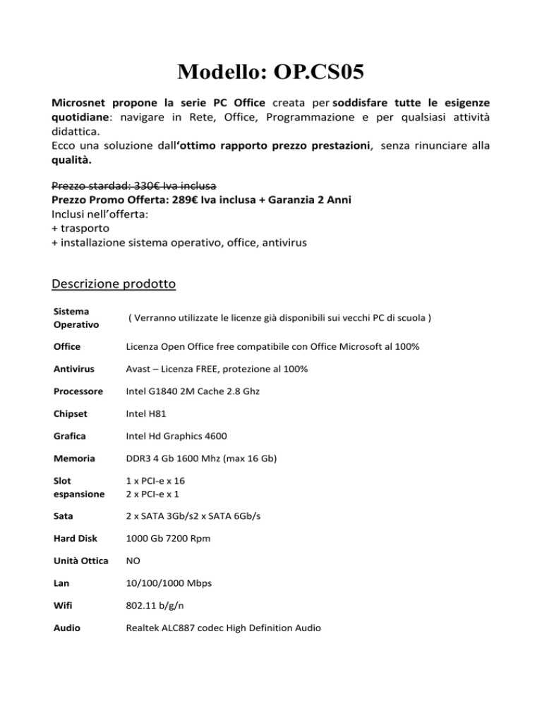Modello: OP.CS05 Microsnet propone la serie PC Office creata per soddisfare tutte le esigenze quotidiane: navigare in Rete, Office, Programmazione e per qualsiasi attività didattica. Ecco una soluzione dall‘ottimo rapporto prezzo prestazioni, senza rinunciare alla qualità. Prezzo stardad: 330€ Iva inclusa Prezzo Promo Offerta: 289€ Iva inclusa + Garanzia 2 Anni Inclusi nell’offerta: + trasporto + installazione sistema operativo, office, antivirus Descrizione prodotto Sistema Operativo ( Verranno utilizzate le licenze già disponibili sui vecchi PC di scuola ) Office Licenza Open Office free compatibile con Office Microsoft al 100% Antivirus Avast – Licenza FREE, protezione al 100% Processore Intel G1840 2M Cache 2.8 Ghz Chipset Intel H81 Grafica Intel Hd Graphics 4600 Memoria DDR3 4 Gb 1600 Mhz (max 16 Gb) Slot espansione 1 x PCI-e x 16 2 x PCI-e x 1 Sata 2 x SATA 3Gb/s2 x SATA 6Gb/s Hard Disk 1000 Gb 7200 Rpm Unità Ottica NO Lan 10/100/1000 Mbps Wifi 802.11 b/g/n Audio Realtek ALC887 codec High Definition Audio Porte I/O Pannello Frontale 1 x Headphone 1 x Microphone 2 x USB 3.0 Porte I/O Posteriori 2 x PS/2 keyboard/mouse port 1 x VGA D-Sub port 1 x DVI-D port1 x HDMI 4 x USB 3.0ports 2 x USB 2.0ports 1 x RJ-45 port 3 x audio jacks (Line In/Line Out/Microphone) Potenza 500 W Dimensioni 28.5 x 21 x 27 mm Microsnet – Assistenza PC / Notebook - PI: 10138931000 - Sito Web: www.microsnet.it - email: [email protected] - Tel: +39 380 6876471 NB: Prezzi resteranno validi per 30gg a partire dal 22.10.2015
