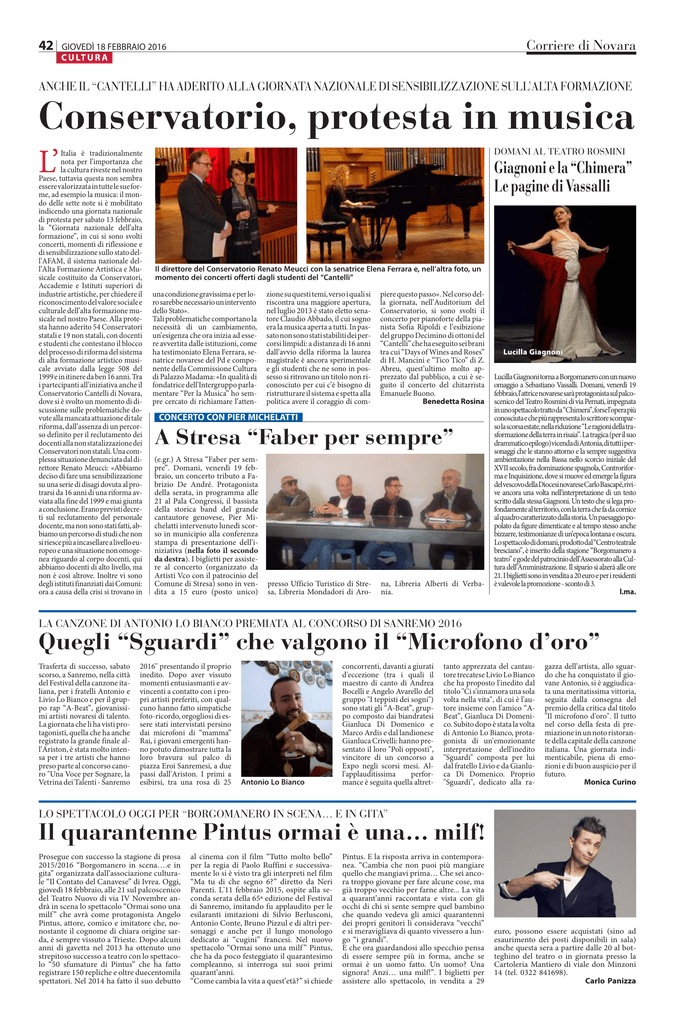 42 Corriere di Novara GIOVEDÌ 18 FEBBRAIO 2016 C U LT U R A ANCHE IL “CANTELLI” HA ADERITO ALLA GIORNATA NAZIONALE DI SENSIBILIZZAZIONE SULL’ALTA FORMAZIONE Conservatorio, protesta in musica DOMANI AL TEATRO ROSMINI L’ Italia è tradizionalmente nota per l’importanza che la cultura riveste nel nostro Paese, tuttavia questa non sembra essere valorizzata in tutte le sue forme, ad esempio la musica: il mondo delle sette note si è mobilitato indicendo una giornata nazionale di protesta per sabato 13 febbraio, la “Giornata nazionale dell’alta formazione”, in cui si sono svolti concerti, momenti di riflessione e di sensibilizzazione sullo stato dell’AFAM, il sistema nazionale dell’Alta Formazione Artistica e Musicale costituito da Conservatori, Accademie e Istituti superiori di industrie artistiche, per chiedere il riconoscimento del valore sociale e culturale dell’alta formazione musicale nel nostro Paese. Alla protesta hanno aderito 54 Conservatori statali e 19 non statali, con docenti e studenti che contestano il blocco del processo di riforma del sistema di alta formazione artistico musicale avviato dalla legge 508 del 1999 e in itinere da ben 16 anni. Tra i partecipanti all’iniziativa anche il Conservatorio Cantelli di Novara, dove si è svolto un momento di discussione sulle problematiche dovute alla mancata attuazione di tale riforma, dall’assenza di un percorso definito per il reclutamento dei docenti alla non statalizzazione dei Conservatori non statali. Una complessa situazione denunciata dal direttore Renato Meucci: «Abbiamo deciso di fare una sensibilizzazione su una serie di disagi dovuta al protrarsi da 16 anni di una riforma avviata alla fine del 1999 e mai giunta a conclusione. Erano previsti decreti sul reclutamento del personale docente, ma non sono stati fatti, abbiamo un percorso di studi che non si riesce più a incasellare a livello europeo e una situazione non omogenea riguardo al corpo docenti, qui abbiamo docenti di alto livello, ma non è così altrove. Inoltre vi sono degli istituti finanziati dai Comuni: ora a causa della crisi si trovano in Giagnoni e la “Chimera” Le pagine di Vassalli Il direttore del Conservatorio Renato Meucci con la senatrice Elena Ferrara e, nell’altra foto, un momento dei concerti offerti dagli studenti del “Cantelli” una condizione gravissima e per loro sarebbe necessario un intervento dello Stato». Tali problematiche comportano la necessità di un cambiamento, un’esigenza che ora inizia ad essere avvertita dalle istituzioni, come ha testimoniato Elena Ferrara, senatrice novarese del Pd e componente della Commissione Cultura di Palazzo Madama: «In qualità di fondatrice dell'Intergruppo parlamentare “Per la Musica” ho sempre cercato di richiamare l’atten- zione su questi temi, verso i quali si riscontra una maggiore apertura, nel luglio 2013 è stato eletto senatore Claudio Abbado, il cui sogno era la musica aperta a tutti. In passato non sono stati stabiliti dei percorsi limpidi: a distanza di 16 anni dall’avvio della riforma la laurea magistrale è ancora sperimentale e gli studenti che ne sono in possesso si ritrovano un titolo non riconosciuto per cui c’è bisogno di ristrutturare il sistema e spetta alla politica avere il coraggio di com- piere questo passo». Nel corso della giornata, nell’Auditorium del Conservatorio, si sono svolti il concerto per pianoforte della pianista Sofia Ripoldi e l’esibizione del gruppo Decimino di ottoni del “Cantelli” che ha eseguito sei brani tra cui “Days of Wines and Roses” di H. Mancini e “Tico Tico” di Z. Abreu, quest’ultimo molto apprezzato dal pubblico, a cui è seguito il concerto del chitarrista Emanuele Buono. Benedetta Rosina CONCERTO CON PIER MICHELATTI A Stresa “Faber per sempre” (e.gr.) A Stresa “Faber per sempre”. Domani, venerdì 19 febbraio, un concerto tributo a Fabrizio De André. Protagonista della serata, in programma alle 21 al Pala Congressi, il bassista della storica band del grande cantautore genovese, Pier Michelatti intervenuto lunedì scorso in municipio alla conferenza stampa di presentazione dell’iniziativa (nella foto il secondo da destra). I biglietti per assistere al concerto (organizzato da Artisti Vco con il patrocinio del Comune di Stresa) sono in vendita a 15 euro (posto unico) presso Ufficio Turistico di Stresa, Libreria Mondadori di Aro- na, Libreria Alberti di Verbania. Lucilla Giagnoni Lucilla Giagnoni torna a Borgomanero con un nuovo omaggio a Sebastiano Vassalli. Domani, venerdì 19 febbraio, l’attrice novarese sarà protagonista sul palcoscenico del Teatro Rosmini di via Pernati, impegnata in uno spettacolo tratto da “Chimera”, forse l’opera più conosciuta e che più rappresenta lo scrittore scomparso la scorsa estate, nella riduzione “Le ragioni della trasformazione della terra in risaia”. La tragica (per il suo drammatico epilogo) vicenda di Antonia, di tutti i personaggi che le stanno attorno e la sempre suggestiva ambientazione nella Bassa nello scorcio iniziale del XVII secolo, fra dominazione spagnola, Controriforma e Inquisizione, dove si muove ed emerge la figura del vescovo della Diocesi novarese Carlo Bascapé, rivive ancora una volta nell’interpretazione di un testo scritto dalla stessa Giagnoni. Un testo che si lega profondamente al territorio, con la terra che fa da cornice al quadro caratterizzato dalla storia. Un paesaggio popolato da figure dimenticate e al tempo stesso anche bizzarre, testimonianze di un’epoca lontana e oscura. Lo spettacolo di domani, prodotto dal “Centro teatrale bresciano”, è inserito della stagione “Borgomanero a teatro”e gode del patrocinio dell’Assessorato alla Cultura dell’Amministrazione. Il sipario si alzerà alle ore 21. I biglietti sono in vendita a 20 euro e per i residenti è valevole la promozione - sconto di 3. l.ma. LA CANZONE DI ANTONIO LO BIANCO PREMIATA AL CONCORSO DI SANREMO 2016 Quegli “Sguardi” 