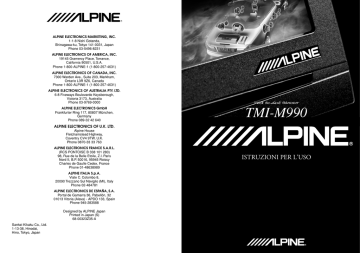 R ALPINE ELECTRONICS MARKETING, INC. 1-1-8 Nishi Gotanda, Shinagawa-ku, Tokyo 141-0031, Japan Phone 03-5496-8231 ALPINE ELECTRONICS OF AMERICA, INC. 19145 Gramercy Place, Torrance, California 90501, U.S.A. Phone 1-800-ALPINE-1 (1-800-257-4631) ALPINE ELECTRONICS OF CANADA, INC. 7300 Warden Ave., Suite 203, Markham, Ontario L3R 9Z6, Canada Phone 1-800-ALPINE-1 (1-800-257-4631) ALPINE ELECTRONICS OF AUSTRALIA PTY. LTD. 6-8 Fiveways Boulevarde Keysborough, Victoria 3173, Australia Phone 03-9769-0000 ALPINE ELECTRONICS GmbH Frankfurter Ring 117, 80807 München, Germany Phone 089-32 42 640 TMI-M990 ALPINE ELECTRONICS OF U.K. LTD. Alpine House Fletchamstead Highway, Coventry CV4 9TW, U.K. Phone 0870-33 33 763 ALPINE ELECTRONICS FRANCE S.A.R.L. (RCS PONTOISE B 338 101 280) 98, Rue de la Belle Etoile, Z.I. Paris Nord II, B.P. 50016, 95945 Roissy Charles de Gaulle Cedex, France Phone 01-48638989 ALPINE ITALIA S.p.A. Viale C. Colombo 8, 20090 Trezzano Sul Naviglio (MI), Italy Phone 02-484781 ALPINE ELECTRONICS DE ESPAÑA, S.A. Portal de Gamarra 36, Pabellón, 32 01013 Vitoria (Alava) - APDO 133, Spain Phone 945-283588 Designed by ALPINE Japan Printed in Japan (S) 68-00323Z35-A Sankei Kikaku Co., Ltd. 1-13-38, Hinodai, Hino, Tokyo, Japan ISTRUZIONI PER L’USO PSOLO PER L'UTILIZZO IN AUTOMOBILE R TMI-M990 VGA IN-DASH MONITOR ITALIANO • ISTRUZIONI PER L’USO Si prega di leggere prima di utilizzare l’attrezzatura. Indice Istruzioni per l’uso AVVERTIMENTO AVVERTIMENTO .................................. 3 ATTENZIONE ........................................ 4 PRECAUZIONI ....................................... 5 Per cominciare Sul telecomando ...................................... 6 Sugli indicatori e sul microfono .............. 7 Utilizzo del TMI-M990 con un collegamento IONBUS ......................... 7 Lettura del manuale ................................. 8 Operazione basilare Usando la facciata di copertina ................ 9 Accensione del sistema iniziale ............... 9 Accensione o spegnimento .................... 10 Aprire/Chiudere il monitor .................... 12 Regolazione del display indietro ed in avanti ................................................... 13 Regolazione dell’angolo visivo del monitor ......................................... 14 Portare il monitor in una posizione piana ................................... 15 Regolazione del volume ........................ 15 Commutazione della fonte ..................... 16 Passaggio tra i modi di visualizzazione .................................... 17 Informazioni supplementari .................. 18 Altre funzioni utili Sull’equalizzatore visivo (VISUAL EQTM ) ............................... 20 Selezione della proprietà VISUAL EQTM ............................................................. 21 Regolazione e memorizzazione VISUAL EQTM ................................................... 23 Sulla SELEZIONE POSTERIORE ....... 26 Funzione d’intrattenimento posteriore ......................................... 28 Modifica delle funzioni del sensore remoto .............................................. 29 Solo passaggio alla sorgente visiva (funzione simultanea) ......................... 30 Attivazione e disattivazione del modo blackout ............................................ 31 Informazioni supplementari .................. 32 Impostazione Sull’impostazione .................................. 33 Approntamento generale ....................... 34 Regolazione della luminosità .............. 36 Regolazione del colore dell’immagine .................................. 37 Regolazione del tono dell’immagine .................................. 37 Regolazione del contrasto del display ........................................ 37 Regolazione della nitidezza ................ 38 Memorizzazione di VISUAL EQ regolato ............................................ 38 Impostazione della luminosità dell’illuminazione ............................ 39 Regolazione del livello d’illuminazione ................................ 39 Controllo della retroilluminazione ...... 40 Impostazione di apertura/chiusura automatica del monitor .................... 40 Selezione dell’angolo d’apertura del monitor ............................................. 41 Regolazione dell’angolo visivo del monitor ............................................. 41 Funzione toni tastiera (Beep) .............. 41 Cambio del colore d’illuminazione .... 42 Interruzione della navigazione ............ 42 Regolazione del volume d’interruzione audio di navigazione ........................ 42 1-IT Indice Funzioni collegate della Head Unit .... 43 IMPOSTAZIONE AUX IN/S-IN ........... 43 Impostazione del modo AUX ............. 45 Nome del componente esterno da visualizzare (AUX) .......................... 45 Regolazione del livello audio d’ingresso esterno ............................ 45 Impostazione del modo S-IN .............. 45 Nome dell’ingresso S video da visualizzare (S-IN) ........................... 46 Commutazione tra la configurazione NTSC e PAL .................................... 46 TV (Opzione) Operazione TV ...................................... 47 Manovra dalla Head Unit Manovra dalla Head Unit ...................... 48 Commutazione della fonte ..................... 49 Regolazione del volume ........................ 49 Funzionamento della Head Unit con il telecomando .............................. 50 Informazione In caso di difficoltà ................................ 52 Caratteristiche tecniche ......................... 53 Installazione e collegamenti Avvertimento ......................................... 55 Attenzione ............................................. 56 Precauzioni ............................................ 56 Installazione ........................................... 57 Collegamenti (schema elettrico dell’unità TMI-M990) ......................................... 60 Esempio di sistema ................................ 62 2-IT WARNI