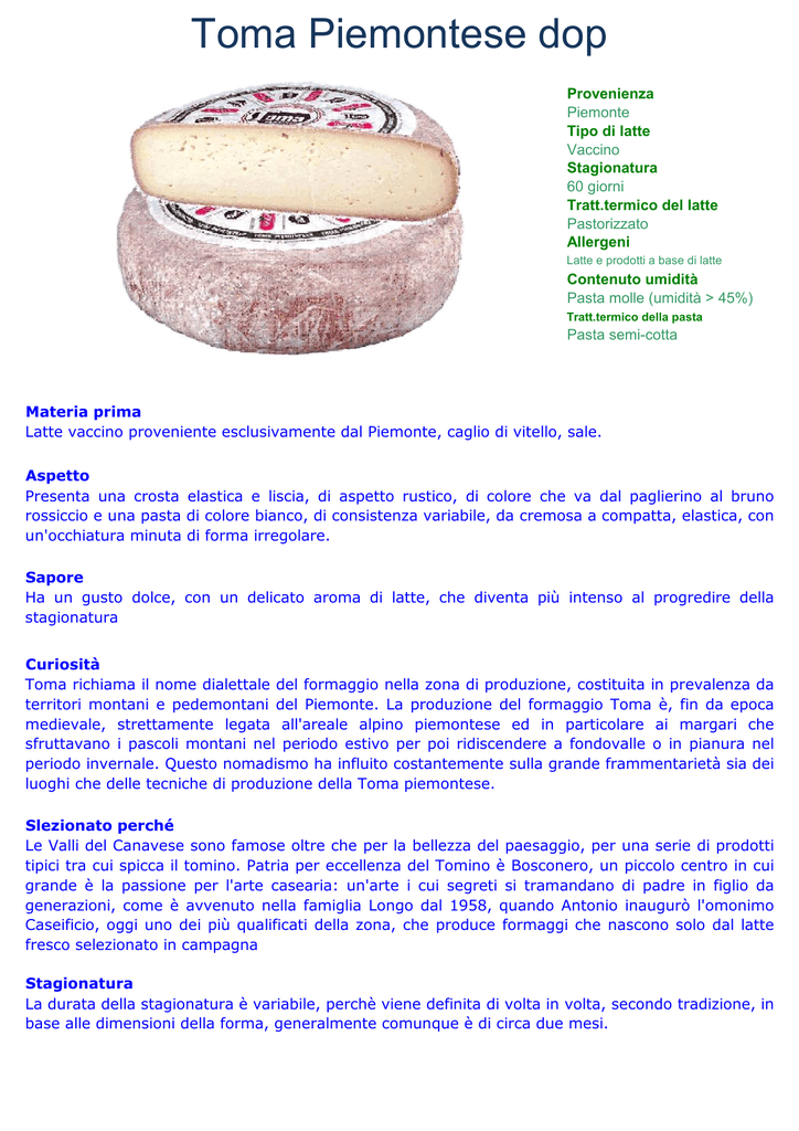 Toma Piemontese dop Provenienza Piemonte Tipo di latte Vaccino Stagionatura 60 giorni Tratt.termico del latte Pastorizzato Allergeni Latte e prodotti a base di latte Contenuto umidità Pasta molle (umidità > 45%) Tratt.termico della pasta Pasta semi-cotta Materia prima Latte vaccino proveniente esclusivamente dal Piemonte, caglio di vitello, sale. Aspetto Presenta una crosta elastica e liscia, di aspetto rustico, di colore che va dal paglierino al bruno rossiccio e una pasta di colore bianco, di consistenza variabile, da cremosa a compatta, elastica, con un'occhiatura minuta di forma irregolare. Sapore Ha un gusto dolce, con un delicato aroma di latte, che diventa più intenso al progredire della stagionatura Curiosità Toma richiama il nome dialettale del formaggio nella zona di produzione, costituita in prevalenza da territori montani e pedemontani del Piemonte. La produzione del formaggio Toma è, fin da epoca medievale, strettamente legata all'areale alpino piemontese ed in particolare ai margari che sfruttavano i pascoli montani nel periodo estivo per poi ridiscendere a fondovalle o in pianura nel periodo invernale. Questo nomadismo ha influito costantemente sulla grande frammentarietà sia dei luoghi che delle tecniche di produzione della Toma piemontese. Slezionato perché Le Valli del Canavese sono famose oltre che per la bellezza del paesaggio, per una serie di prodotti tipici tra cui spicca il tomino. Patria per eccellenza del Tomino è Bosconero, un piccolo centro in cui grande è la passione per l'arte casearia: un'arte i cui segreti si tramandano di padre in figlio da generazioni, come è avvenuto nella famiglia Longo dal 1958, quando Antonio inaugurò l'omonimo Caseificio, oggi uno dei più qualificati della zona, che produce formaggi che nascono solo dal latte fresco selezionato in campagna Stagionatura La durata della stagionatura è variabile, perchè viene definita di volta in volta, secondo tradizione, in base alle dimensioni della forma, generalmente comunque è di circa due mesi.