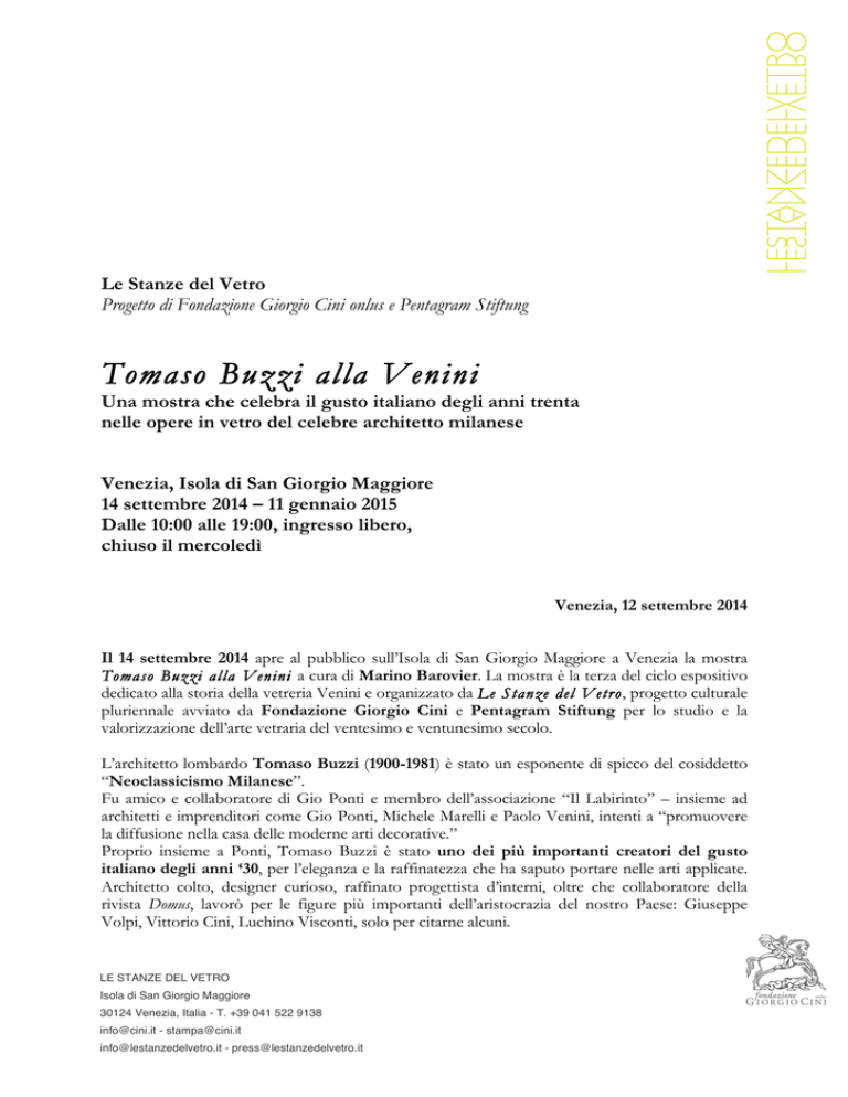 Le Stanze del Vetro Progetto di Fondazione Giorgio Cini onlus e Pentagram Stiftung Tomaso Buzzi alla Venini Una mostra che celebra il gusto italiano degli anni trenta nelle opere in vetro del celebre architetto milanese Venezia, Isola di San Giorgio Maggiore 14 settembre 2014 – 11 gennaio 2015 Dalle 10:00 alle 19:00, ingresso libero, chiuso il mercoledì Venezia, 12 settembre 2014 Il 14 settembre 2014 apre al pubblico sull’Isola di San Giorgio Maggiore a Venezia la mostra Tomaso Buzzi alla Venini a cura di Marino Barovier. La mostra è la terza del ciclo espositivo dedicato alla storia della vetreria Venini e organizzato da Le Stanze del Vetro, progetto culturale pluriennale avviato da Fondazione Giorgio Cini e Pentagram Stiftung per lo studio e la valorizzazione dell’arte vetraria del ventesimo e ventunesimo secolo. L’architetto lombardo Tomaso Buzzi (1900-1981) è stato un esponente di spicco del cosiddetto “Neoclassicismo Milanese”. Fu amico e collaboratore di Gio Ponti e membro dell’associazione “Il Labirinto” – insieme ad architetti e imprenditori come Gio Ponti, Michele Marelli e Paolo Venini, intenti a “promuovere la diffusione nella casa delle moderne arti decorative.” Proprio insieme a Ponti, Tomaso Buzzi è stato uno dei più importanti creatori del gusto italiano degli anni ‘30, per l’eleganza e la raffinatezza che ha saputo portare nelle arti applicate. Architetto colto, designer curioso, raffinato progettista d’interni, oltre che collaboratore della rivista Domus, lavorò per le figure più importanti dell’aristocrazia del nostro Paese: Giuseppe Volpi, Vittorio Cini, Luchino Visconti, solo per citarne alcuni. LE STANZE DEL VETRO Isola di San Giorgio Maggiore 30124 Venezia, Italia - T. +39 041 522 9138 [email protected] - [email protected] [email protected] - [email protected] Tra il 1932 e il 1933 l’architetto milanese Tomaso Buzzi avvia un’attiva collaborazione con la vetreria Venini, che prosegue episodicamente anche durante gli anni successivi. Il contributo creativo di Buzzi si caratterizza per il suo approccio sperimentale alla forma e ai materiali. La sua ampia ricerca riguarda anche l’illuminazione, dando così inizio a una nuova veste a questo tradizionale settore del vetro di Murano. Quando nel 1932 arriva a Murano alla Venini, Buzzi porta il suo notevole bagaglio culturale e la sua profonda conoscenza dell’arte antica, in particolare di quella etrusca, verso la quale l’architetto ha una particolare attenzione. Una tra le fonti di ispirazione nella produzione di Buzzi, è infatti rappresentata dalla tipologia dell’askòs, un vaso in ceramica con una o due bocche a entrambe le estremità, di origine greca e diffuso in età etrusca, utilizzato per contenere liquidi oleosi, spesso modellato a figure zoomorfe, come volatili o animali cornuti. Non è un caso, infatti, che nel corso degli anni venti l’arte etrusca fosse stata oggetto di riscoperta e approfondimento: è qui che Buzzi cerca motivi di ispirazione, con la volontà di creare manufatti nuovi e originali che se da un lato non negano la loro ispirazione storica, dall’altro esaltano le caratteristiche plastiche e materiche del vetro. Ciò avviene attraverso la sperimentazione con un nuovo tessuto vitreo, il vetro incamiciato a più strati di colore e applicazioni di foglia d’oro, e l’utilizzo di particolari zoomorfi (come chiocciole, teste di cavallini e di capra) o elaborati collarini, nastri annodati e manici a forma di elmo stilizzato. Tra gli oggetti più significativi, presentati alla V Triennale di Milano del 1933, si distinse la celebre Coppa delle Mani, sostenuta da mani con polsi uniti e dita affusolate, decorati da bracciali e anelli. La nuova tecnica, perfezionata da Buzzi, trasforma radicalmente l’aspetto dei vetri prodotti fino ad allora dalla Venini, rispondendo all’esigenza di rinnovamento dell’azienda muranese e affermandone la sua vocazione alla produzione di vetri eleganti e raffinati. È noto, grazie all’analisi e allo studio dei disegni conservati nell’archivio Venini, che Buzzi studiò 14 ricette diverse per la produzione dei vetri incamiciati a più strati, una tecnica che potrebbe essere paragonata a quella della velatura a olio nella pittura. L’architetto utilizza diversi strati di colore per ottenere tonalità come il rosa, il verde, il grigio-azzurro e il rosa-rosso, che daranno vita alle serie dei vetri laguna, alga, alba e tramonto. “Questa tecnica” – afferma il curatore Marino Barovier – “gli consente di ottenere tonalità inedite, ricche di intensità e di sfumature, e una materia che reagisce alle variazioni della luce, anche in relazione alla forma dell’oggetto e a seconda degli spessori ottenuti con la soffiatura. Tale materia per la sua modalità di realizzazione non è mai ripetibile e uguale a se stessa e, in tal modo, contribuisce a determinare l’unicità e nello stesso tempo l’originalità dell’oggetto”. LE STANZE DEL VETRO Isola di San Giorgio Maggiore 30124 Venezia, Italia - T. +39 041 522 9138 [email protected] - [email protected] [email protected] - [email protected] La mostra Tomaso Buzzi alla Venini, a cura di Marino Barovier, ripercorre questa breve ma fruttuosa collaborazione, documentata non solo attraverso le opere selezionate (circa 200), i disegni originali catalogati nell’archivio Venini, ma anche attraverso progetti inediti conservati alla Scarzuola a Montegabbione (Terni), la città-teatro (originariamente un convento con annessa una chiesa del Duecento) che Buzzi costruì a partire dalla fine degli anni sessanta e che continuò a modificare fino all’anno della sua morte avvenuta nel 1981. In occasione della mostra, verrà pubblicato il primo catalogo ragionato dell’opera su vetro di Tomaso Buzzi, pubblicato da Skira per Le Stanze del Vetro e curato da Marino Barovier con Carla Sonego. Inoltre, anche in occasione di questa terza mostra dedicata alla Venini, il regista Gian 
